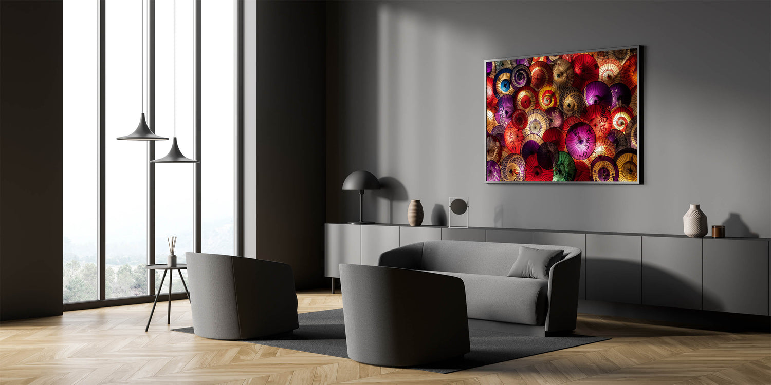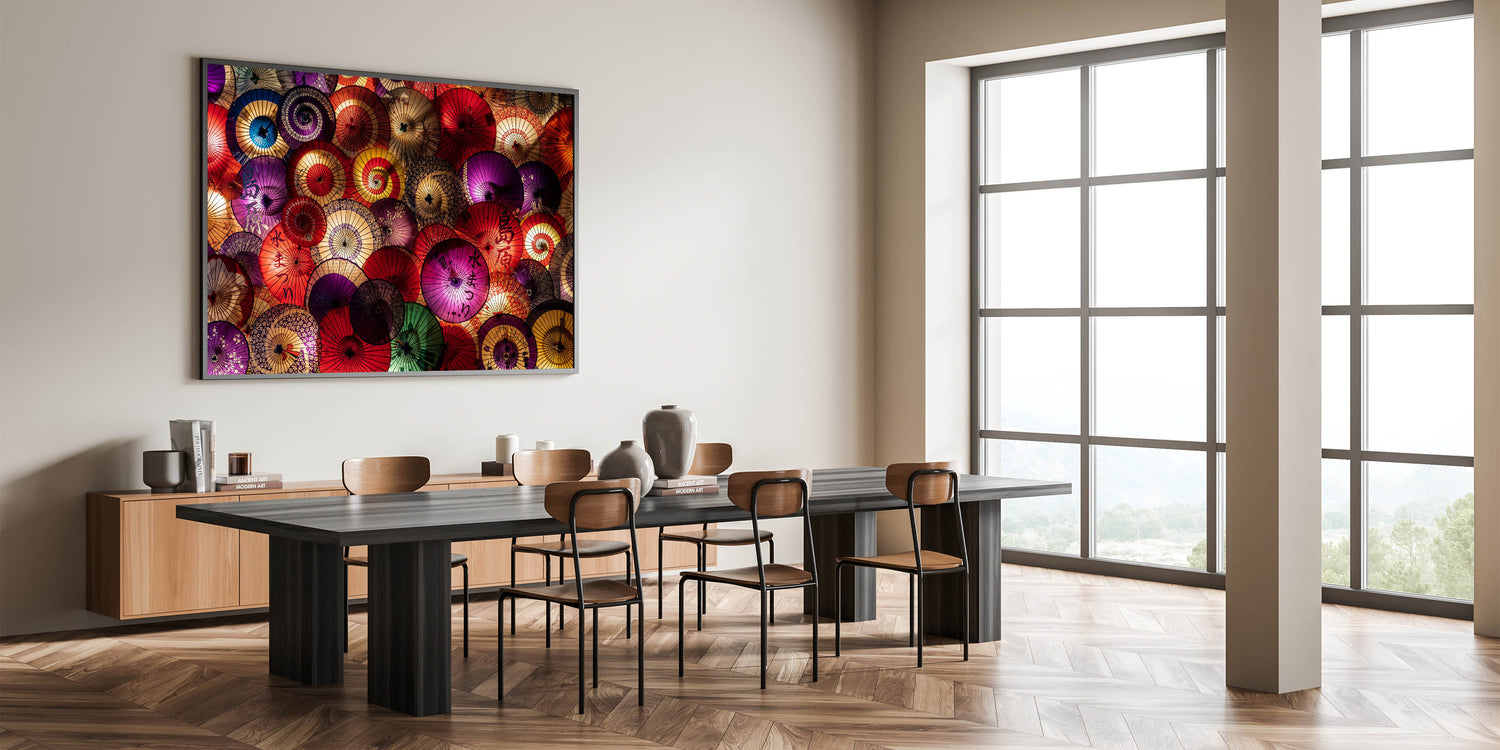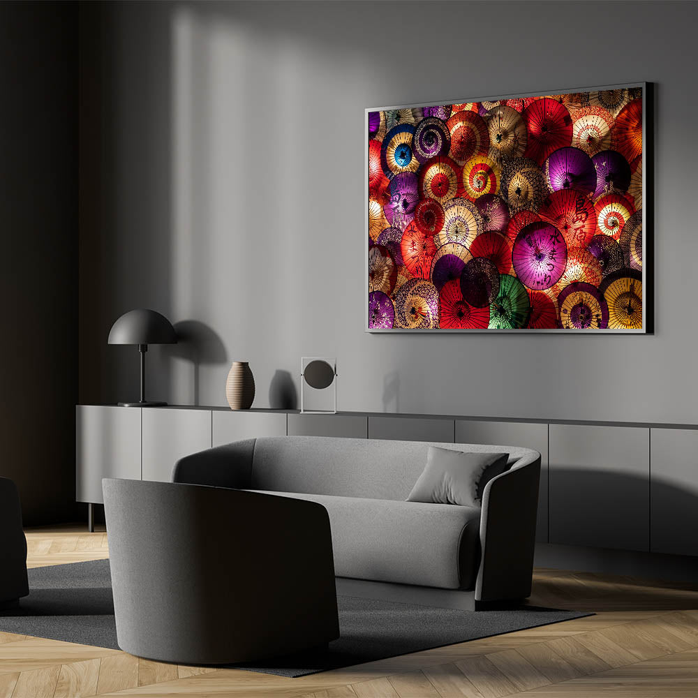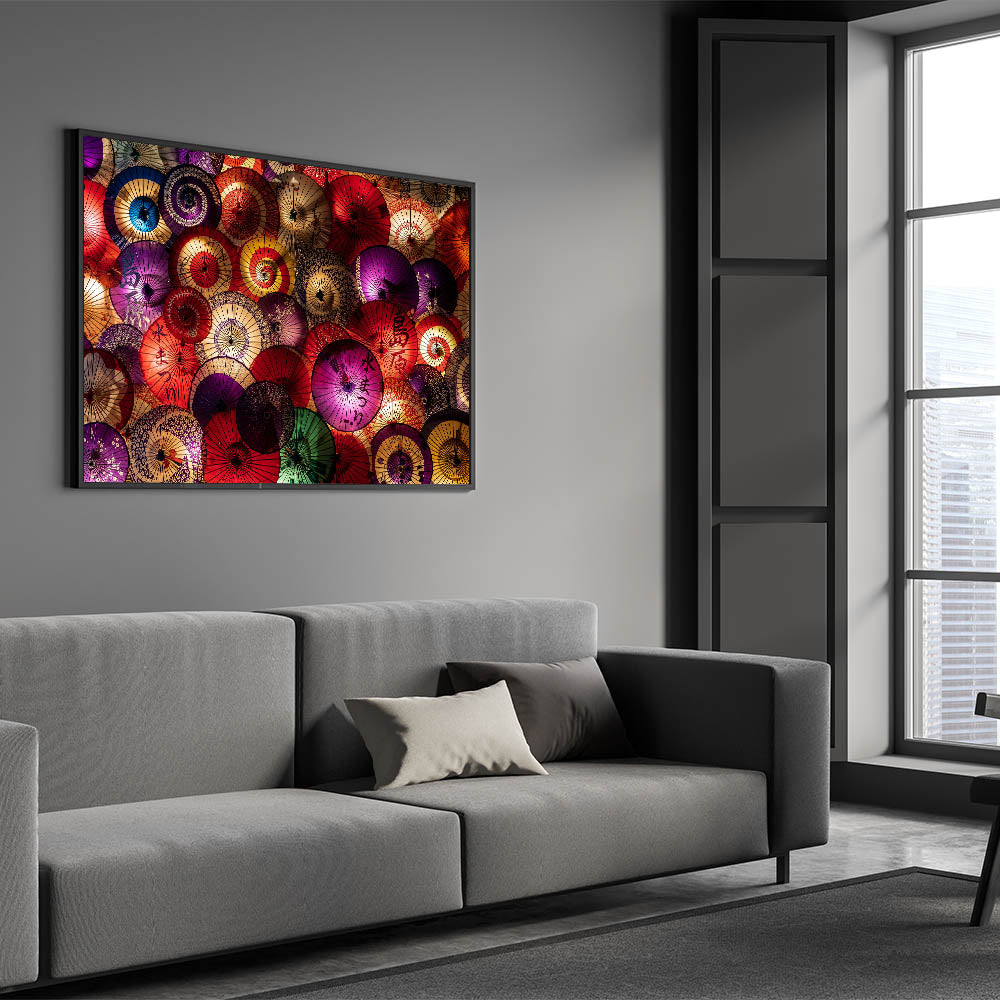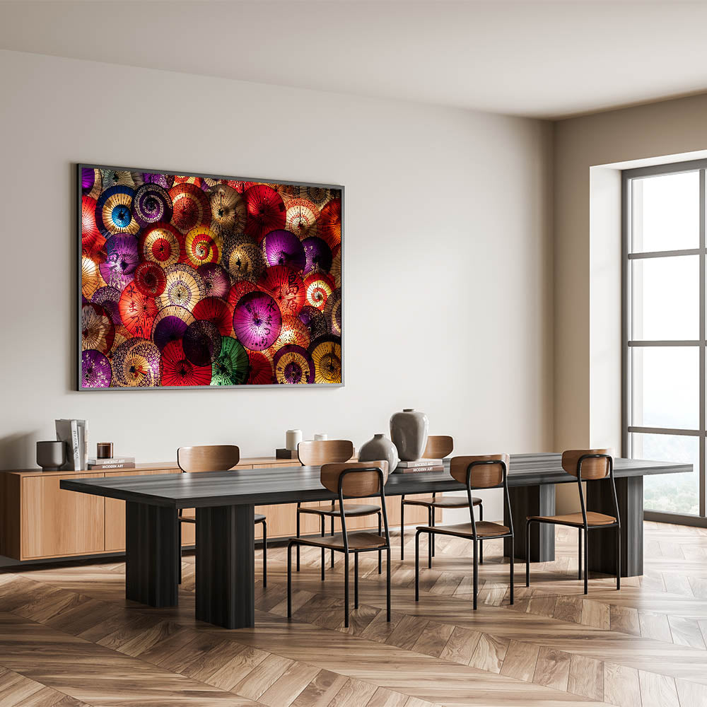 Add a splash of color and tradition to your space with this stunning Traditional Japanese Umbrella Art. This vibrant wall art showcases a beautiful arrangement of colorful Japanese paper umbrellas, creating an intricate tapestry of red, purple, gold, and green tones. The elegant patterns and textures on each umbrella reflect the rich cultural heritage of Japan, making this piece a perfect blend of tradition and modern design.