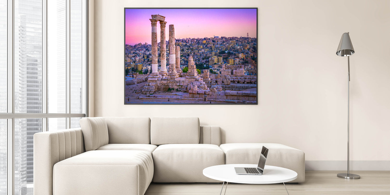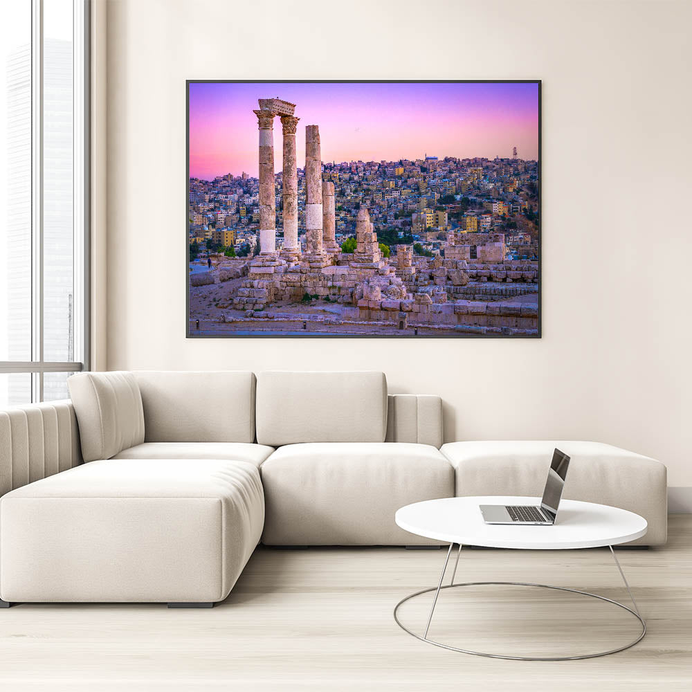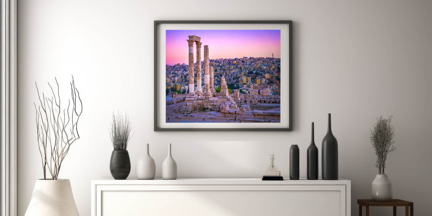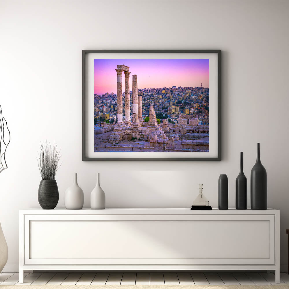 - Handcrafted Amman Cityscape Art, showcasing the Temple of Hercules and modern city life