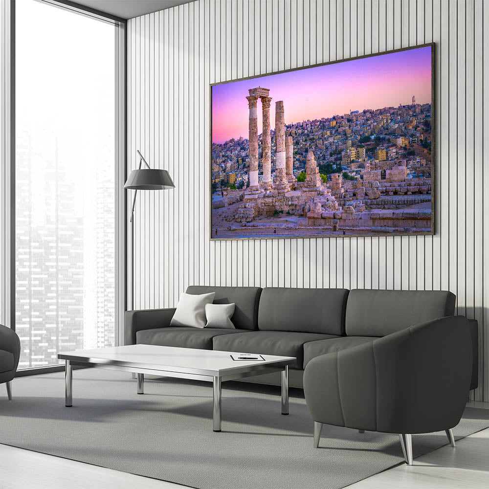 Capture the perfect blend of ancient and modern with this stunning wall art of Amman, Jordan. Featuring the iconic columns of the Temple of Hercules set against the backdrop of the bustling city, this handcrafted Jordan wall art beautifully encapsulates the rich history and vibrant urban life of Amman. The purple and pink hues of the sky add a dreamlike quality to the piece, making it an eye-catching addition to any room.