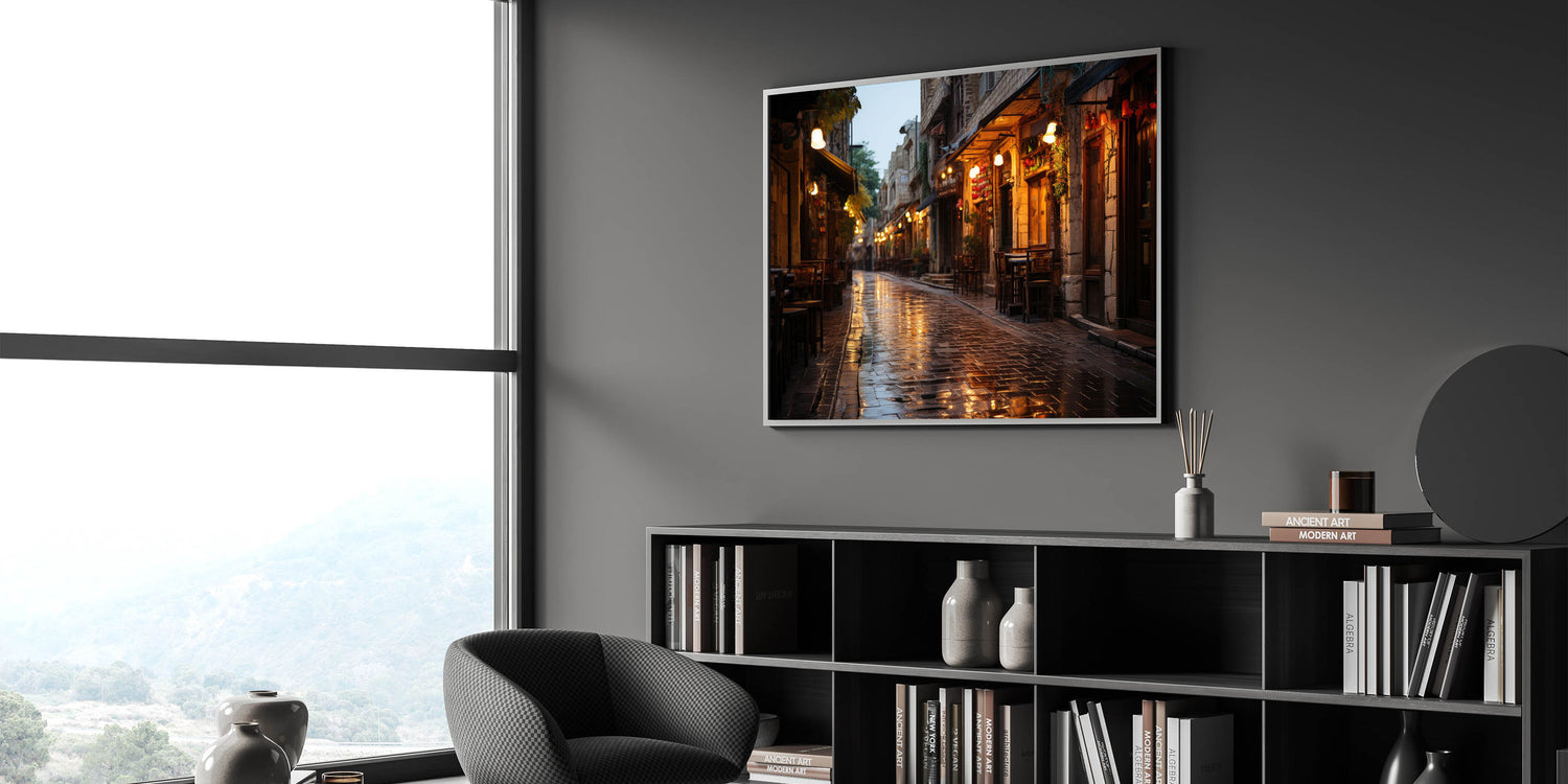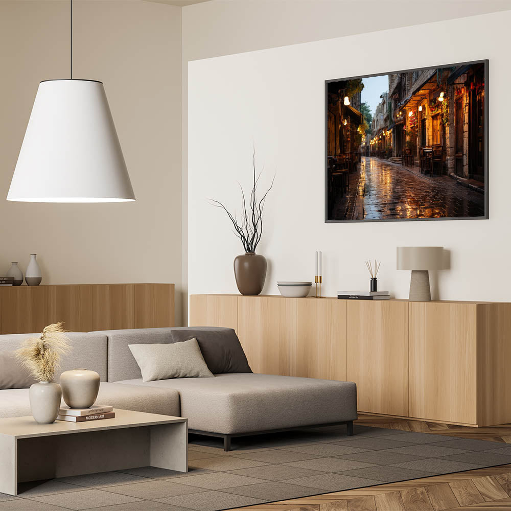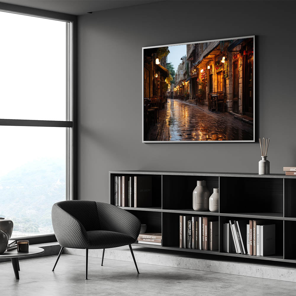 Step into the warm glow of a quiet Jordanian street at dusk with this captivating wall art. The soft, amber lighting reflects off the wet cobblestone street, illuminating the charming shops and inviting the viewer to explore the peaceful ambiance of the scene. This handcrafted Jordan wall art perfectly captures the balance between the old-world charm of the architecture and the modern urban setting. The rich colors and glowing lights make this piece a perfect addition to any space, creating an atmosphere of warmth and tranquility.