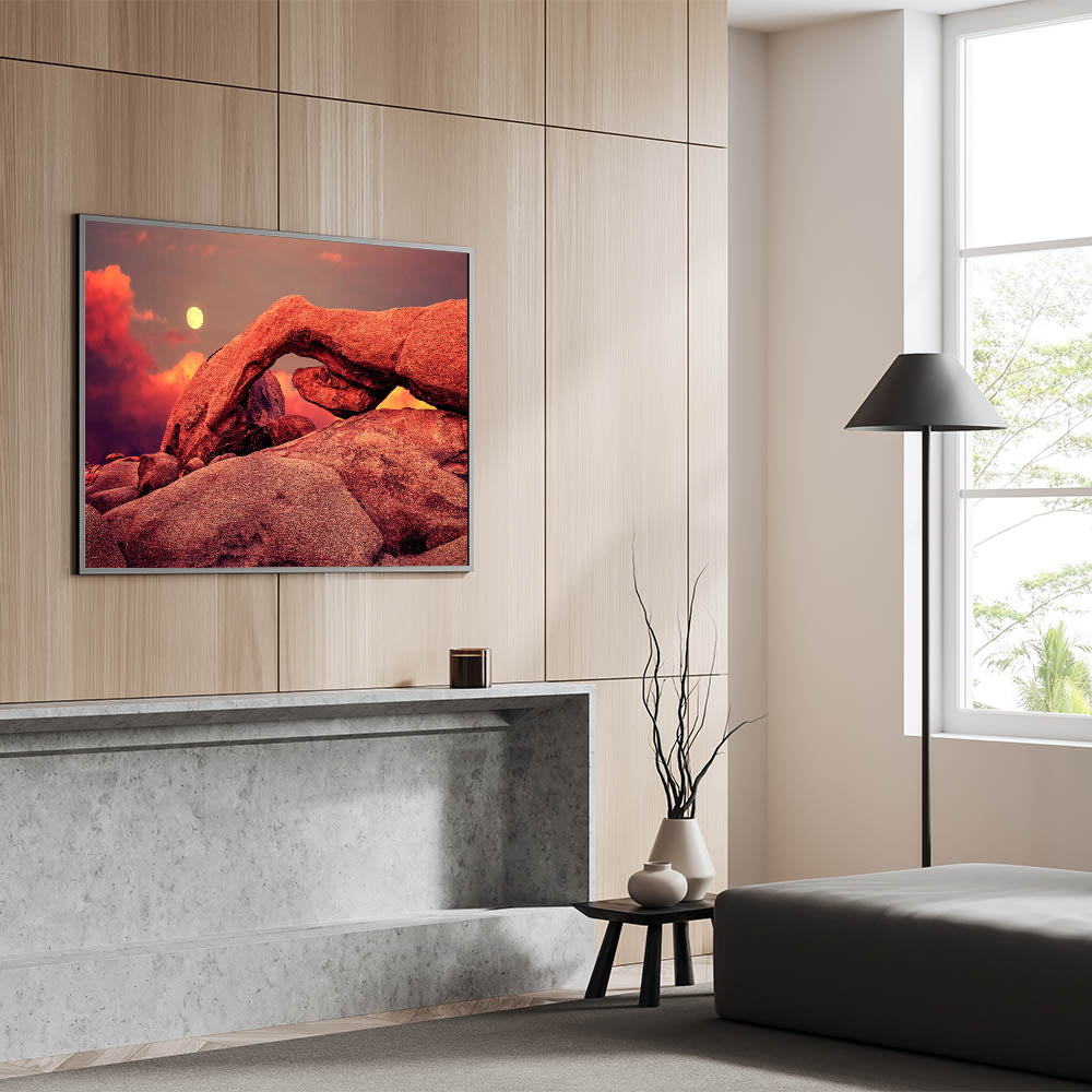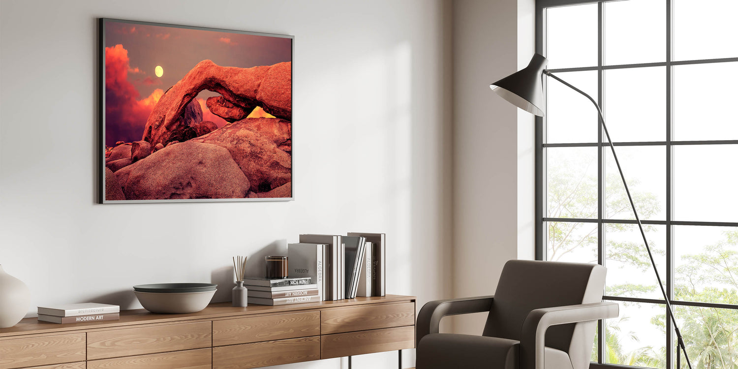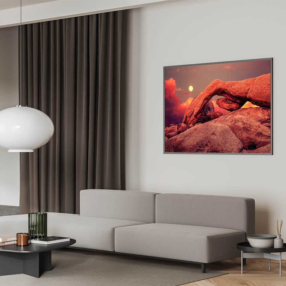 Experience the captivating beauty of a moonrise over Joshua Tree National Park with this striking wall art piece. Featuring the iconic desert rock formations bathed in warm, earthy hues as the full moon rises against a dramatic sky, this artwork brings the serene yet powerful essence of the California desert into your home.
