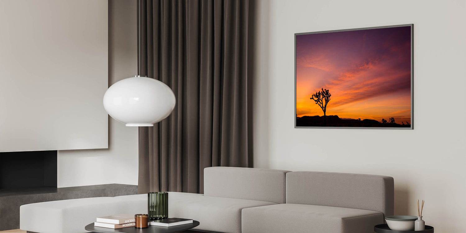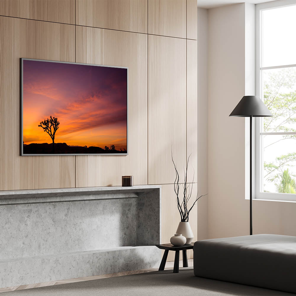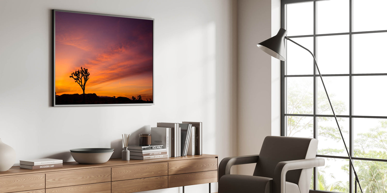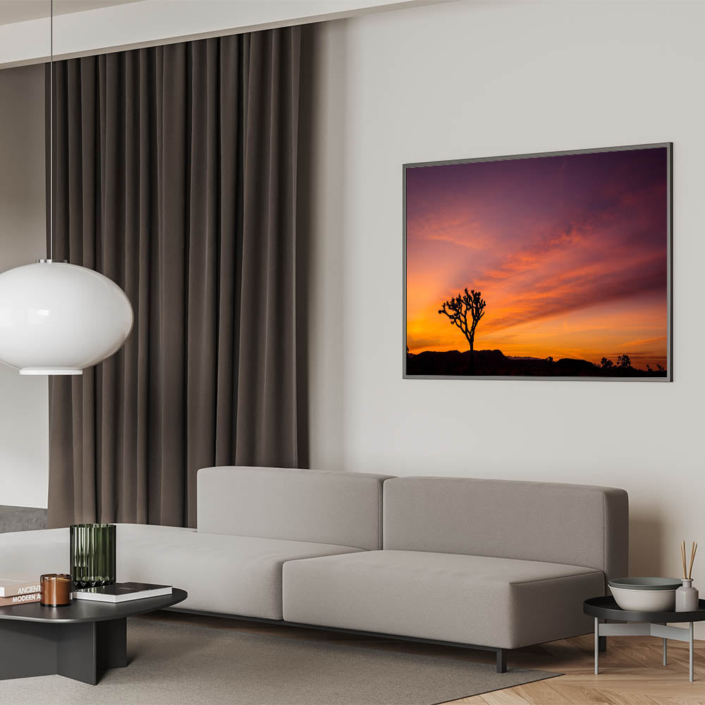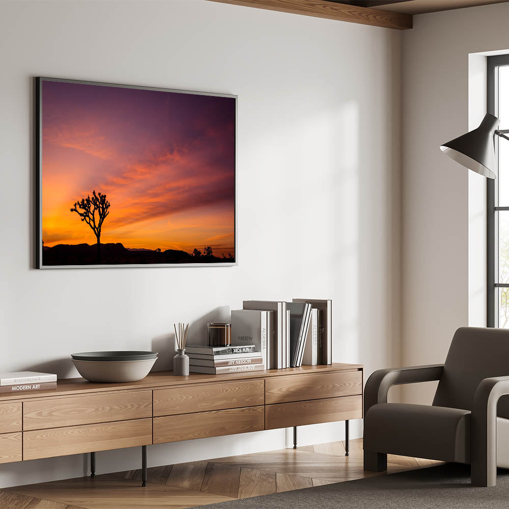 This striking piece of Joshua Tree National Park sunset art is perfect for nature lovers and photography enthusiasts. Its bold, vibrant colors and peaceful landscape bring a calming yet dramatic touch to your interior, making it a standout addition to any décor.