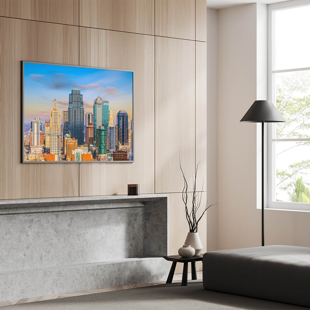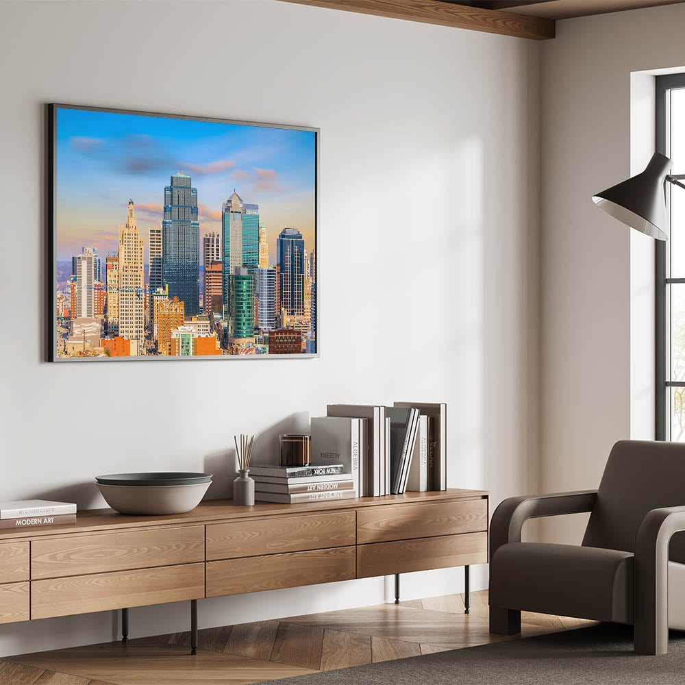 Celebrate Kansas City's lively downtown with this captivating wall art, featuring the vibrant cityscape against a soft, golden sunset sky. This Kansas City skyline art perfectly captures the architectural beauty and urban charm of Missouri, making it an ideal choice for any modern decor. The piece adds an energetic yet sophisticated touch to any space, transforming your home or office into a tribute to Kansas City's essence.