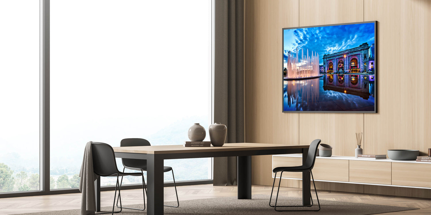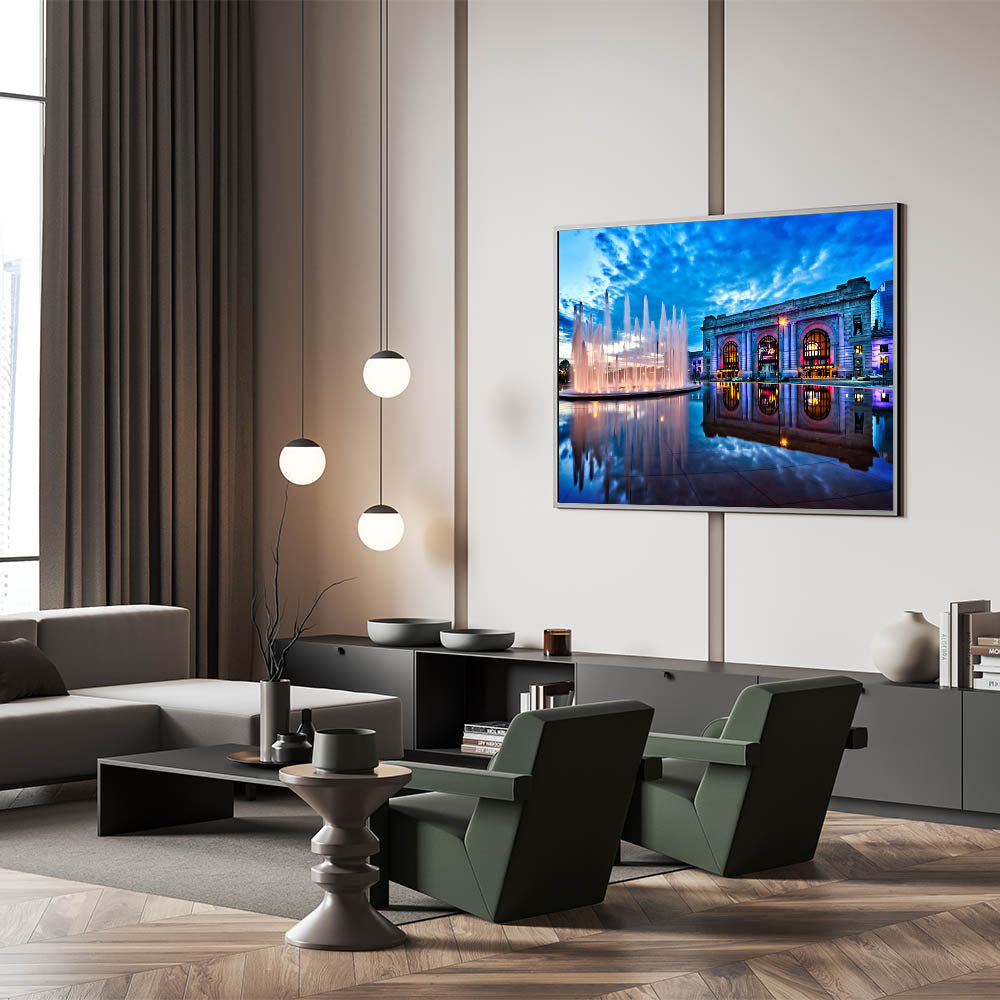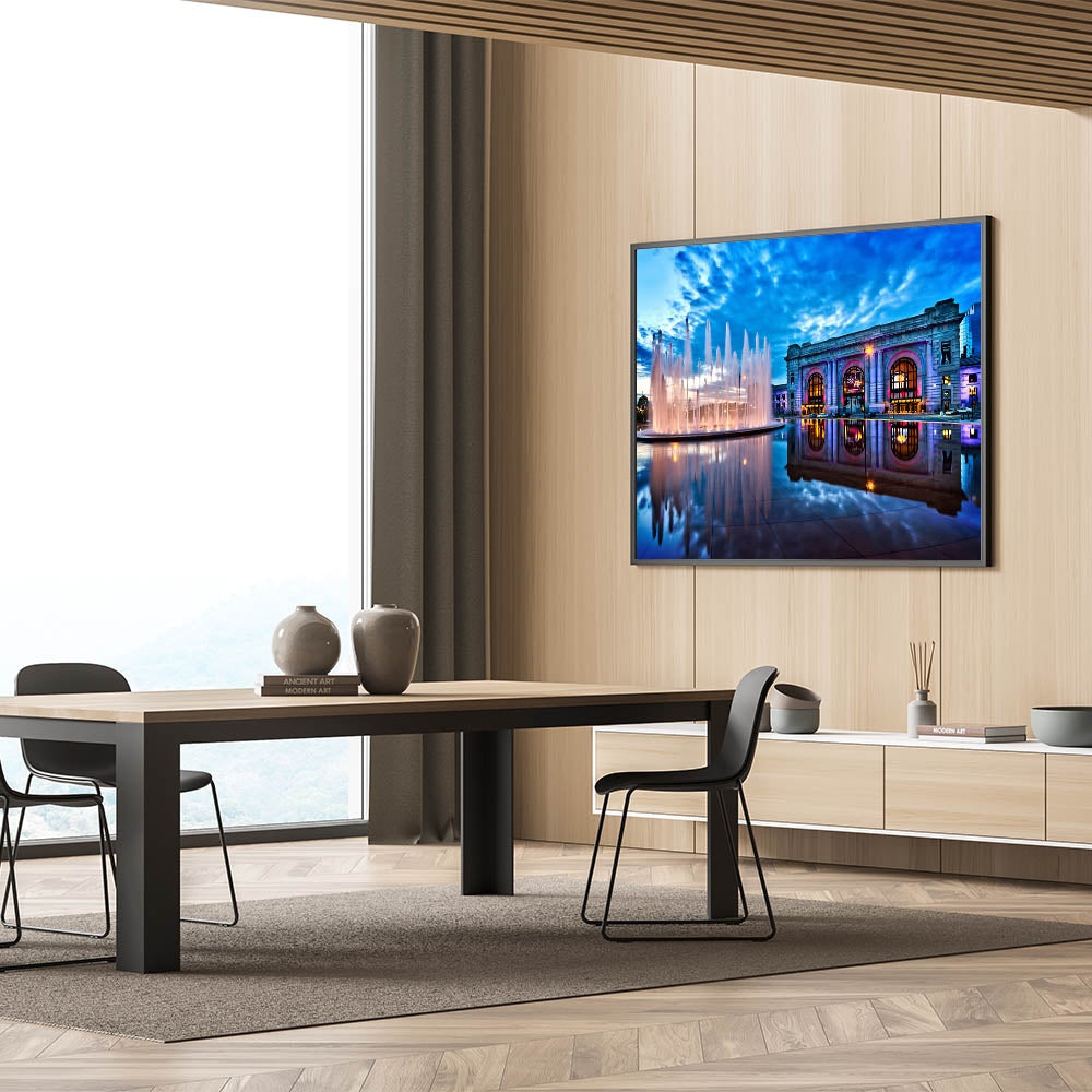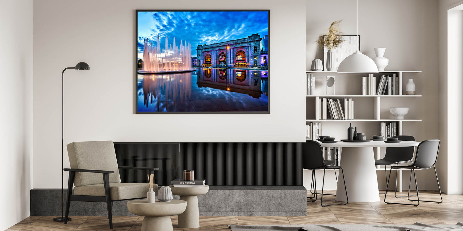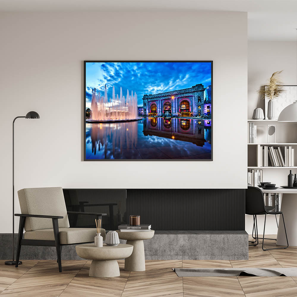 Immerse yourself in the beauty of Kansas City with this stunning photography art, capturing the iconic Union Station and its fountains under a dramatic evening sky. The vibrant blue hues of the sky contrast beautifully with the illuminated fountains and the architectural grandeur of Union Station. This Kansas City skyline art brings a touch of elegance and serenity to any space, making it ideal for those who appreciate urban beauty and architectural charm.