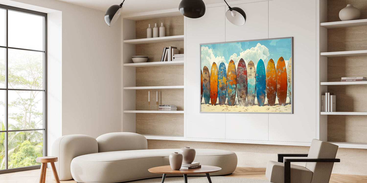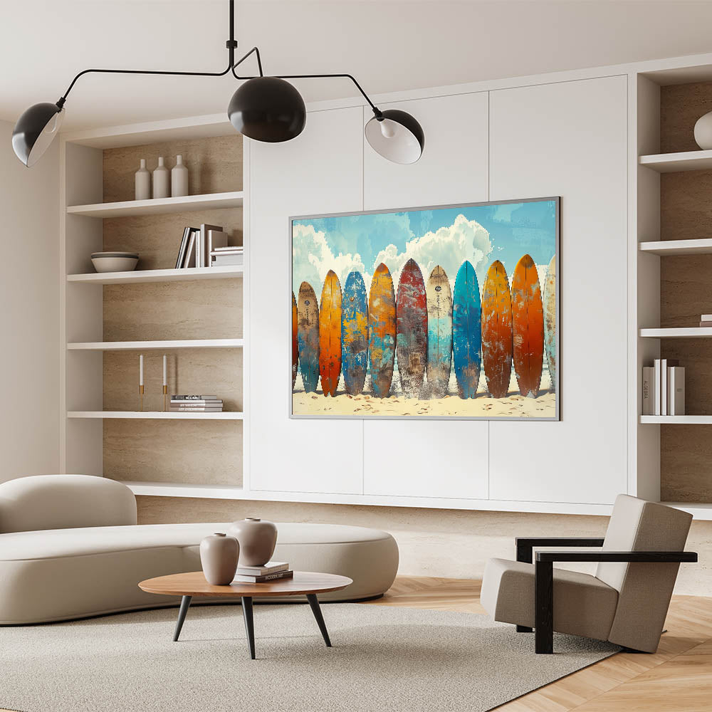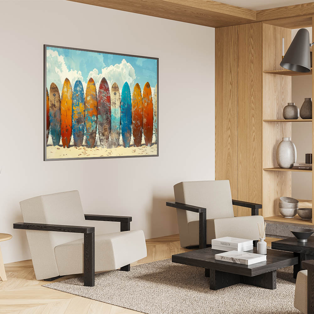 Hawaiian Island Art – Vibrant Surfboards on Beach Canvas & Framed Print