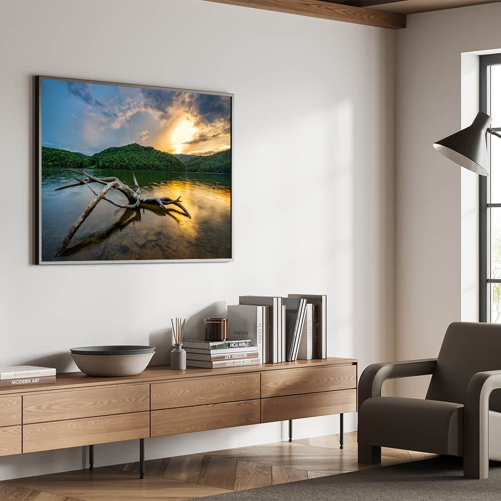 This serene artwork captures the beauty of a peaceful sunset over a Kentucky lake, with the soft glow of the sun reflecting on the calm waters and the lush green hills in the distance. The striking silhouette of the driftwood in the foreground adds depth and character to this already captivating scene. Ideal for adding a calming touch to any room, this piece celebrates the natural beauty of Kentucky's lakeside landscapes.