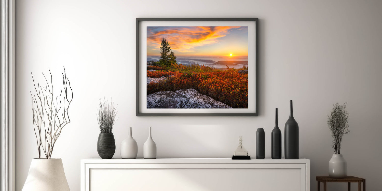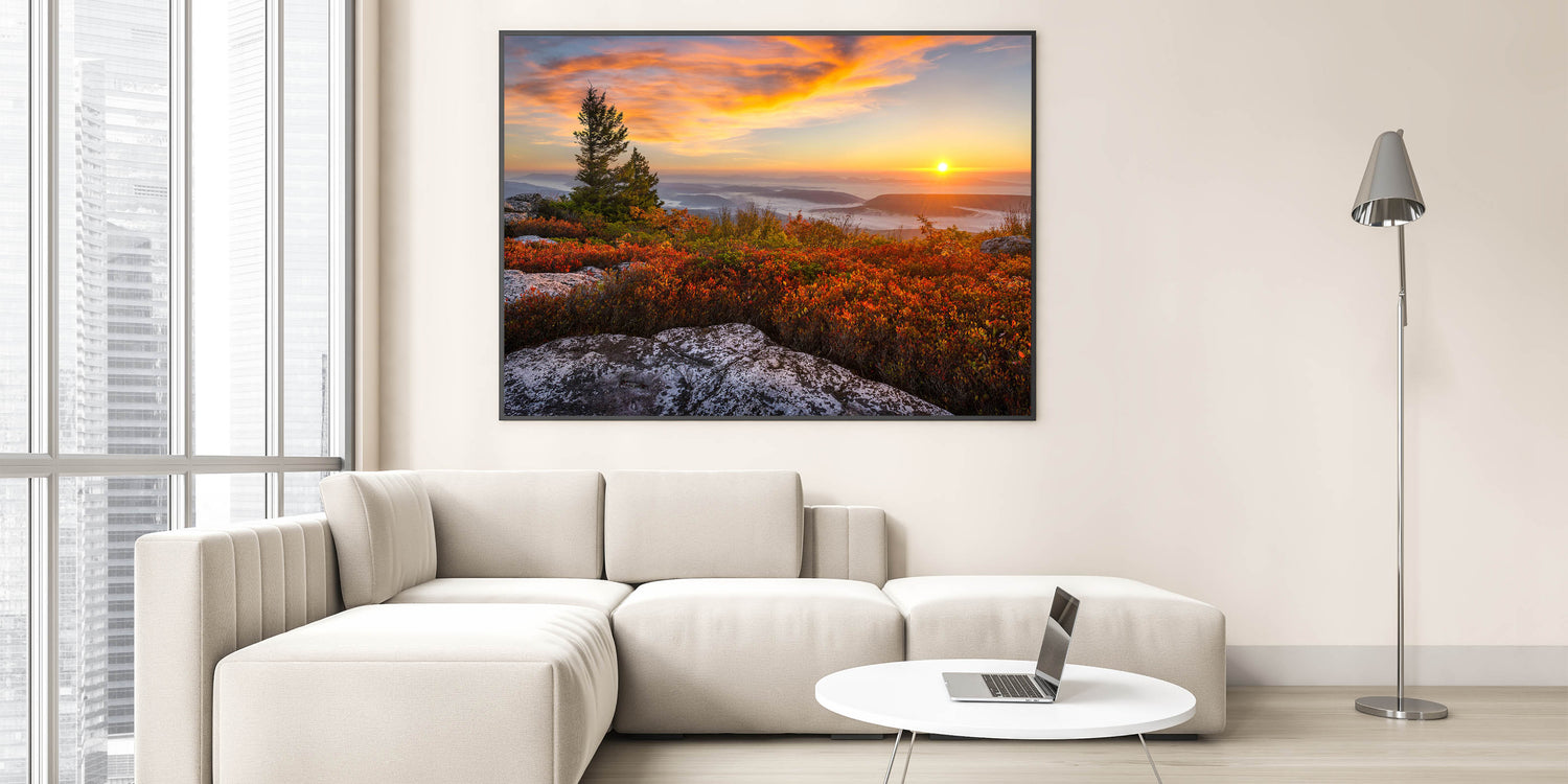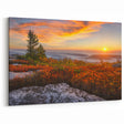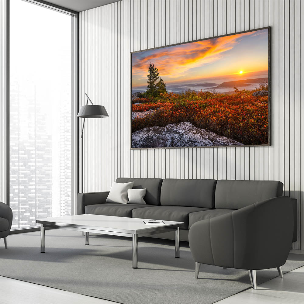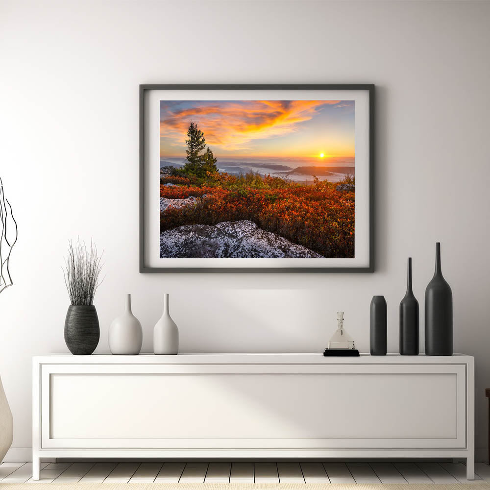 This beautiful artwork captures a vibrant autumn sunrise over the mountains of Kentucky, where the warm hues of the sky blend with the brilliant fall foliage below. The combination of fiery orange, red, and yellow leaves with the calm morning light creates an inviting and cozy atmosphere. Ideal for bringing warmth and natural beauty into your home, this piece is a must-have for those who love the changing seasons.