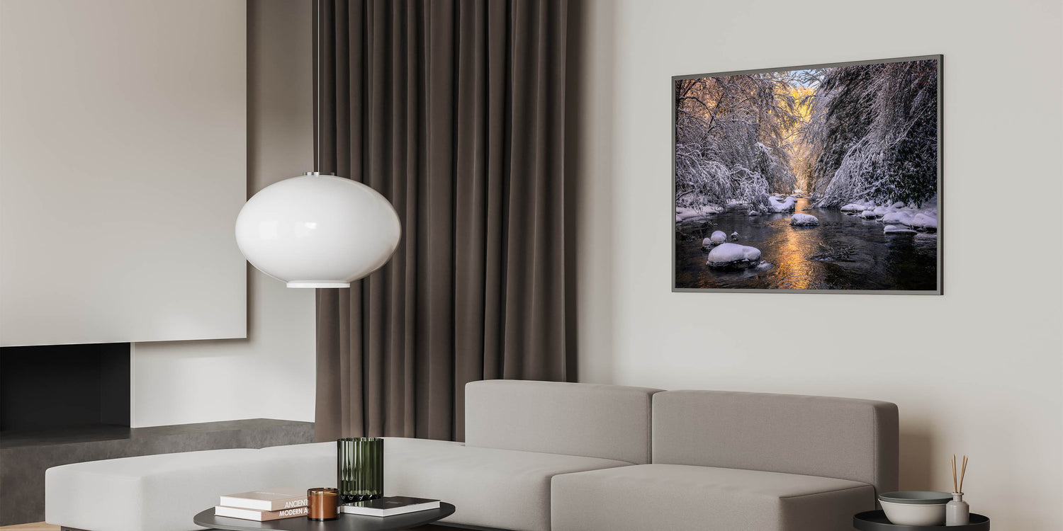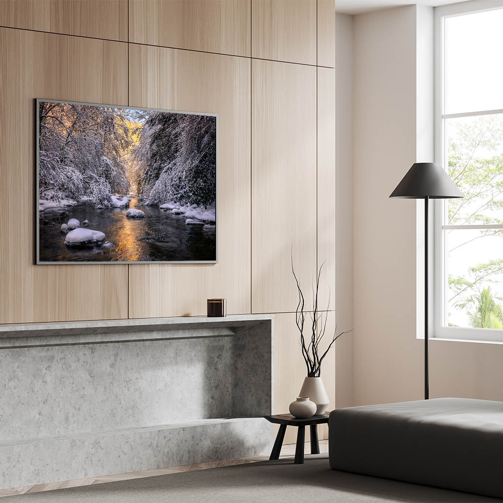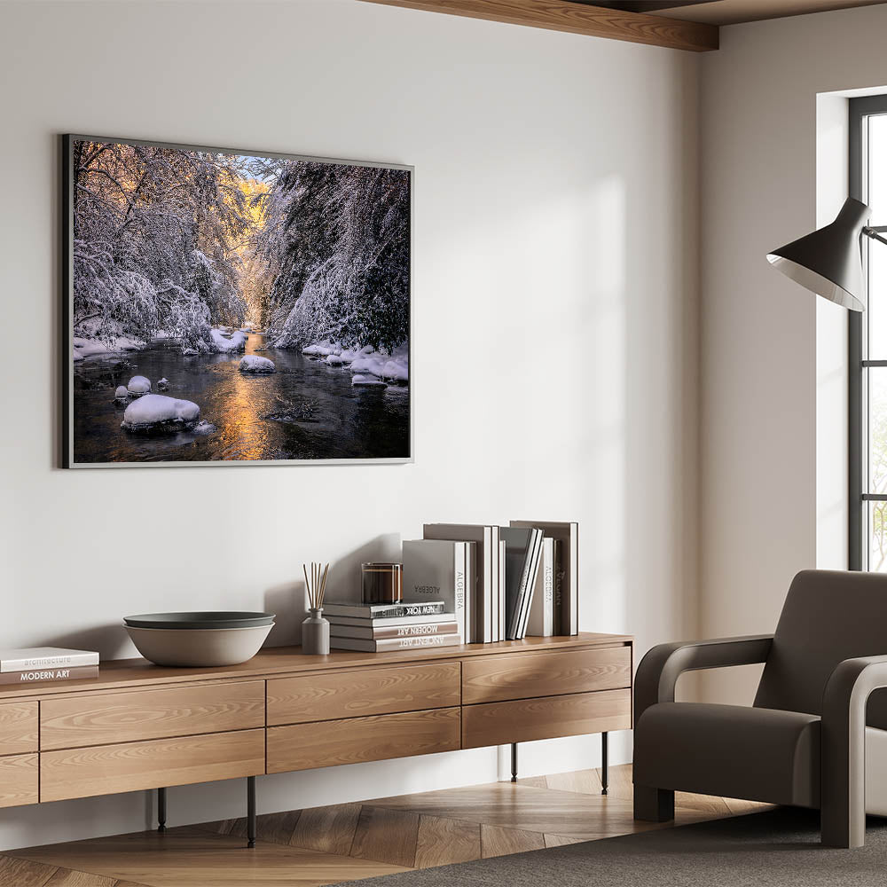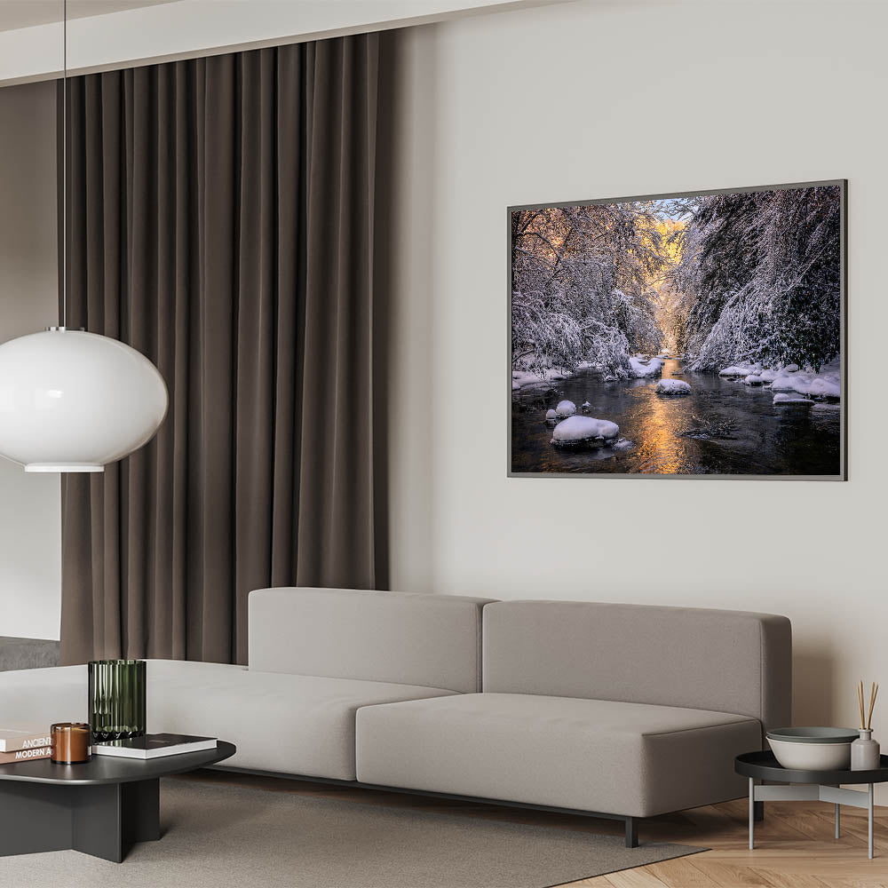 This stunning artwork captures a peaceful winter scene along a Kentucky creek, where snow-covered trees and rocks frame the gentle flow of the water. The soft glow of light reflecting off the icy water adds warmth to the cold, creating a tranquil and serene atmosphere. This piece is perfect for adding a sense of calm and natural beauty to your home during the winter months or year-round.