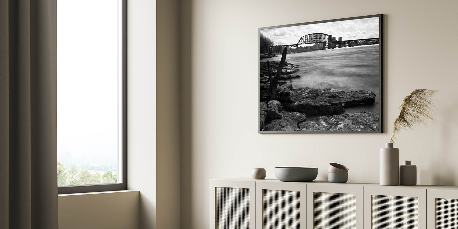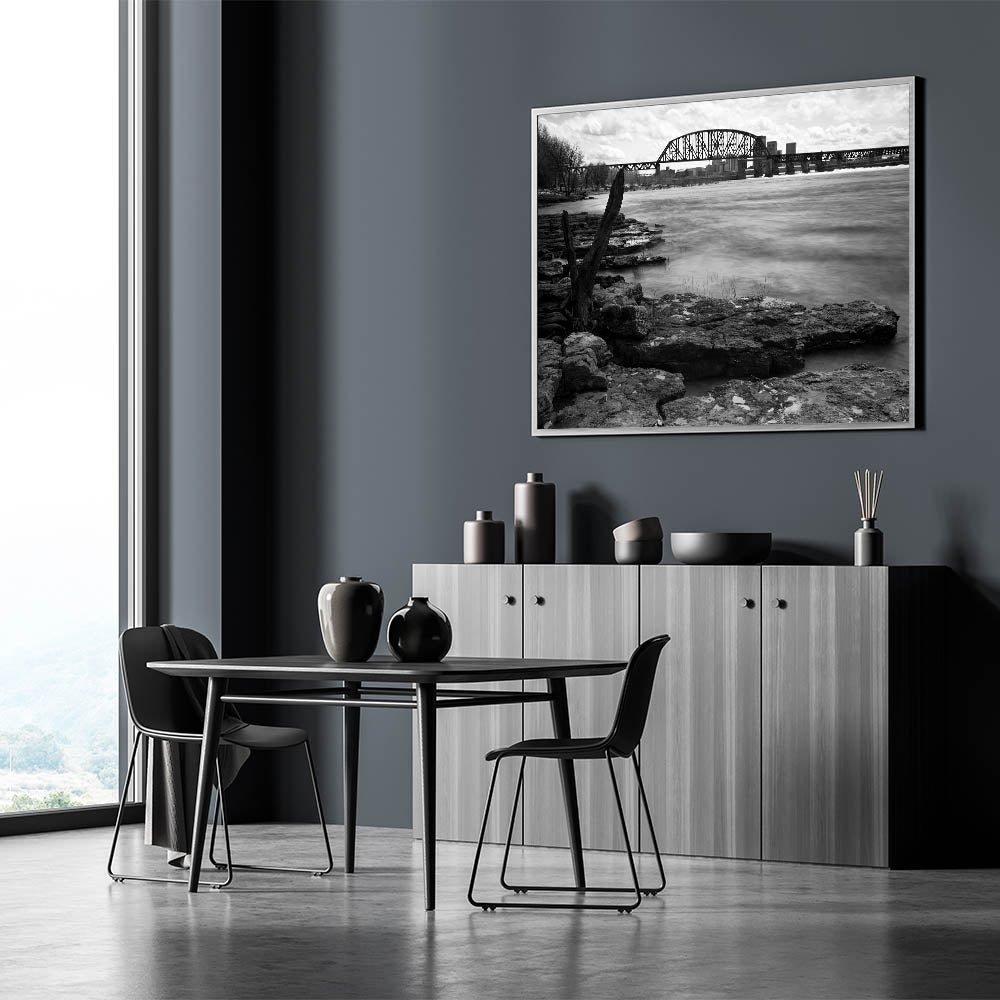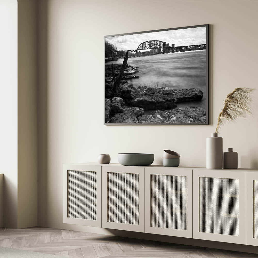 This elegant black-and-white art print captures the striking Louisville skyline and its iconic bridge, offering a timeless and sophisticated piece for urban art lovers. The strong contrast between the industrial steel bridge and the flowing water below adds depth and a sense of balance to the artwork, making it a perfect addition to any modern or contemporary space.