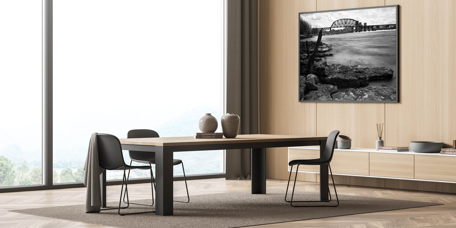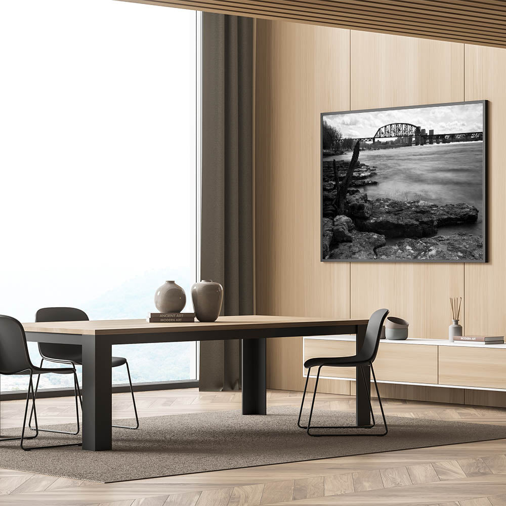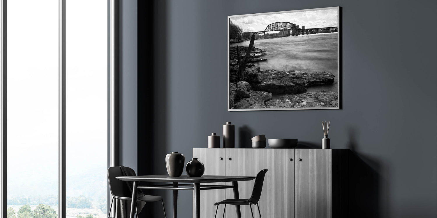 This elegant black-and-white art print captures the striking Louisville skyline and its iconic bridge, offering a timeless and sophisticated piece for urban art lovers. The strong contrast between the industrial steel bridge and the flowing water below adds depth and a sense of balance to the artwork, making it a perfect addition to any modern or contemporary space.