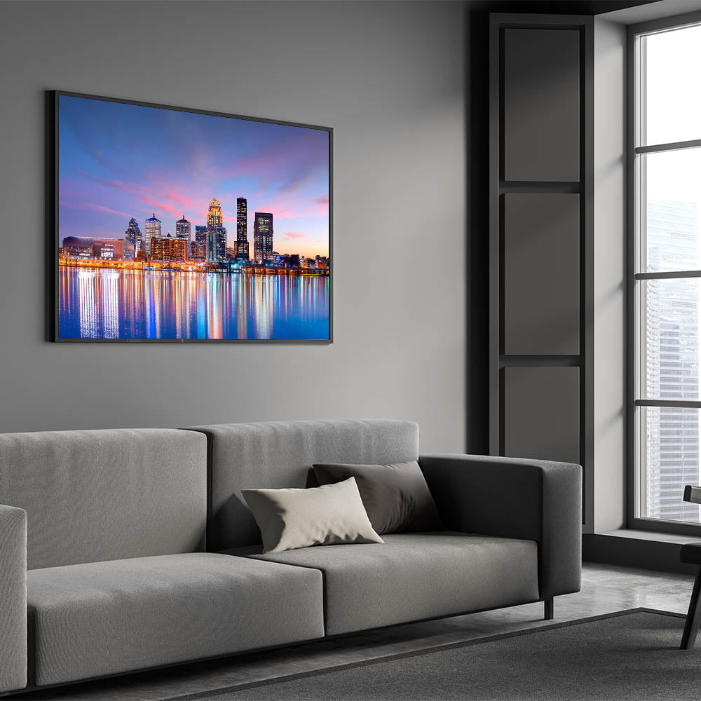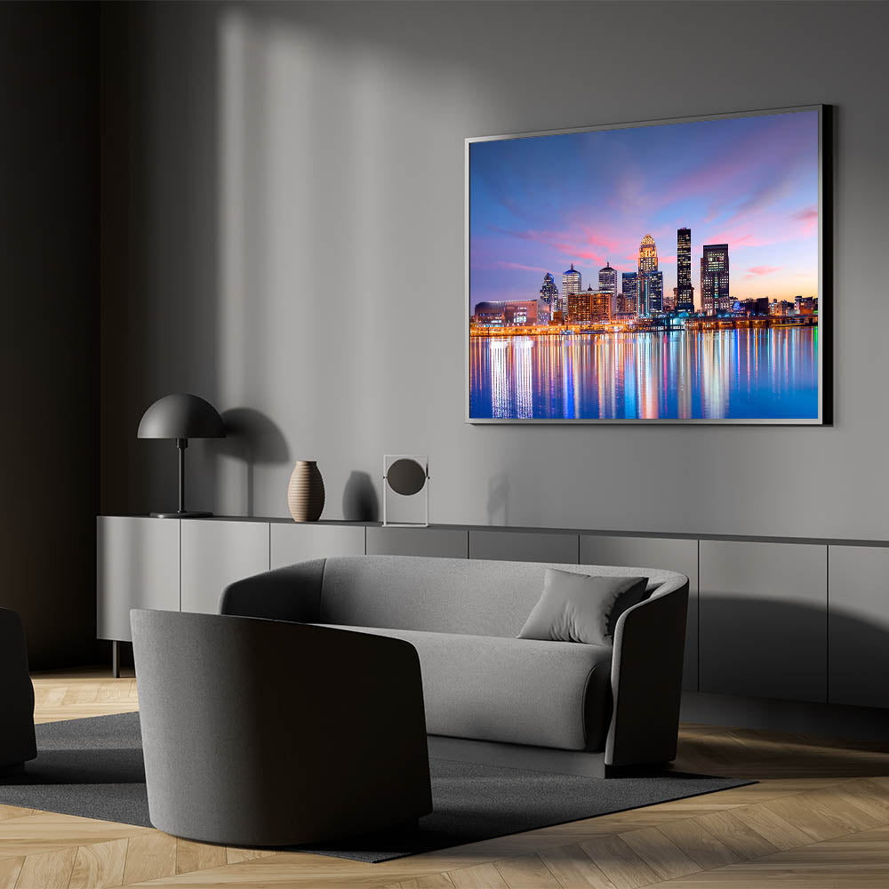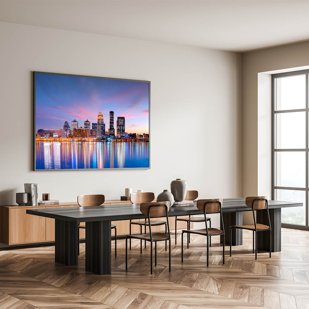 This stunning artwork captures the vibrant Louisville skyline at sunset, where the sky's warm pinks and purples reflect on the calm waters below. The city lights begin to glow, creating a perfect blend of natural beauty and urban energy. This piece is ideal for adding a touch of modern sophistication to your home or office decor, celebrating the iconic beauty of Kentucky's largest city.