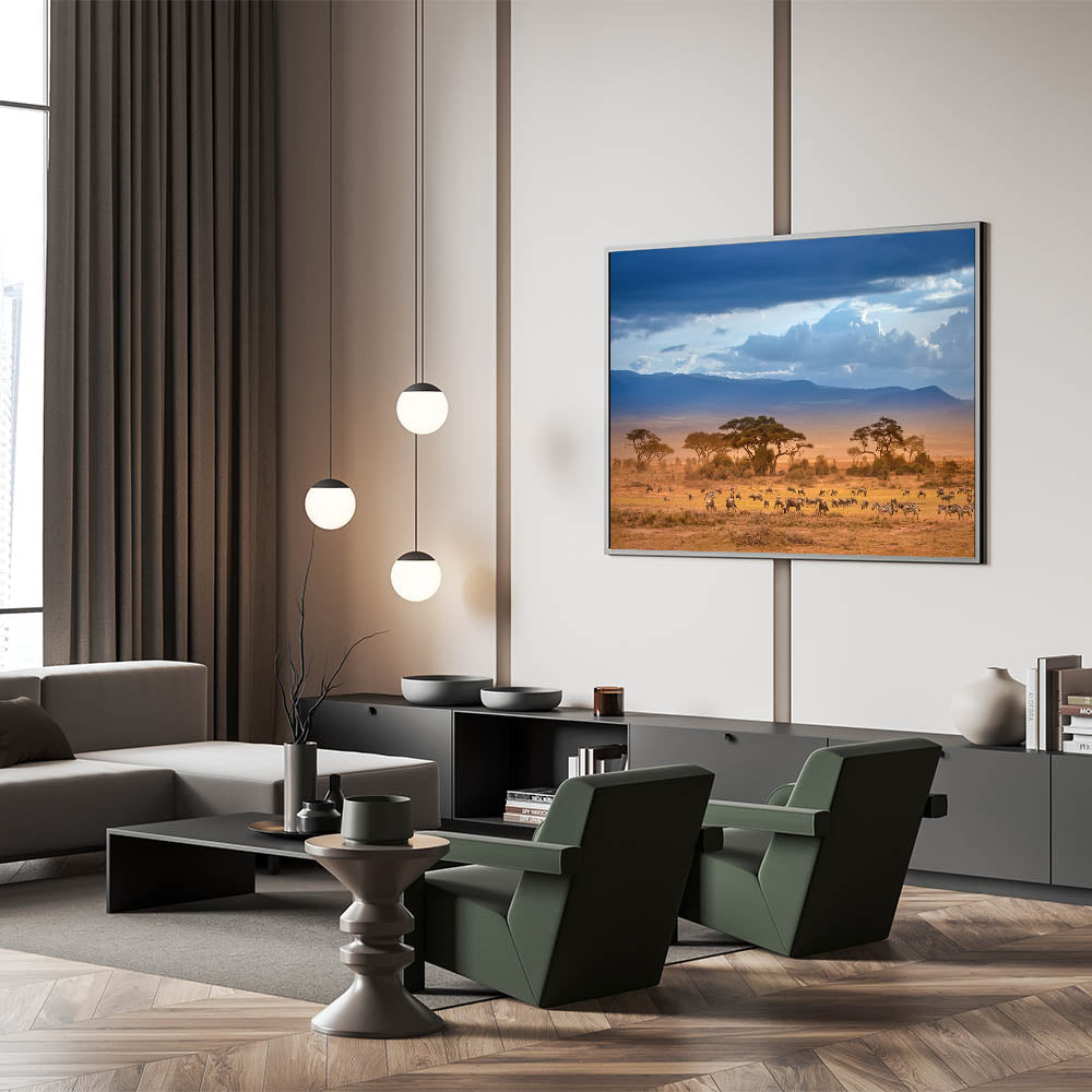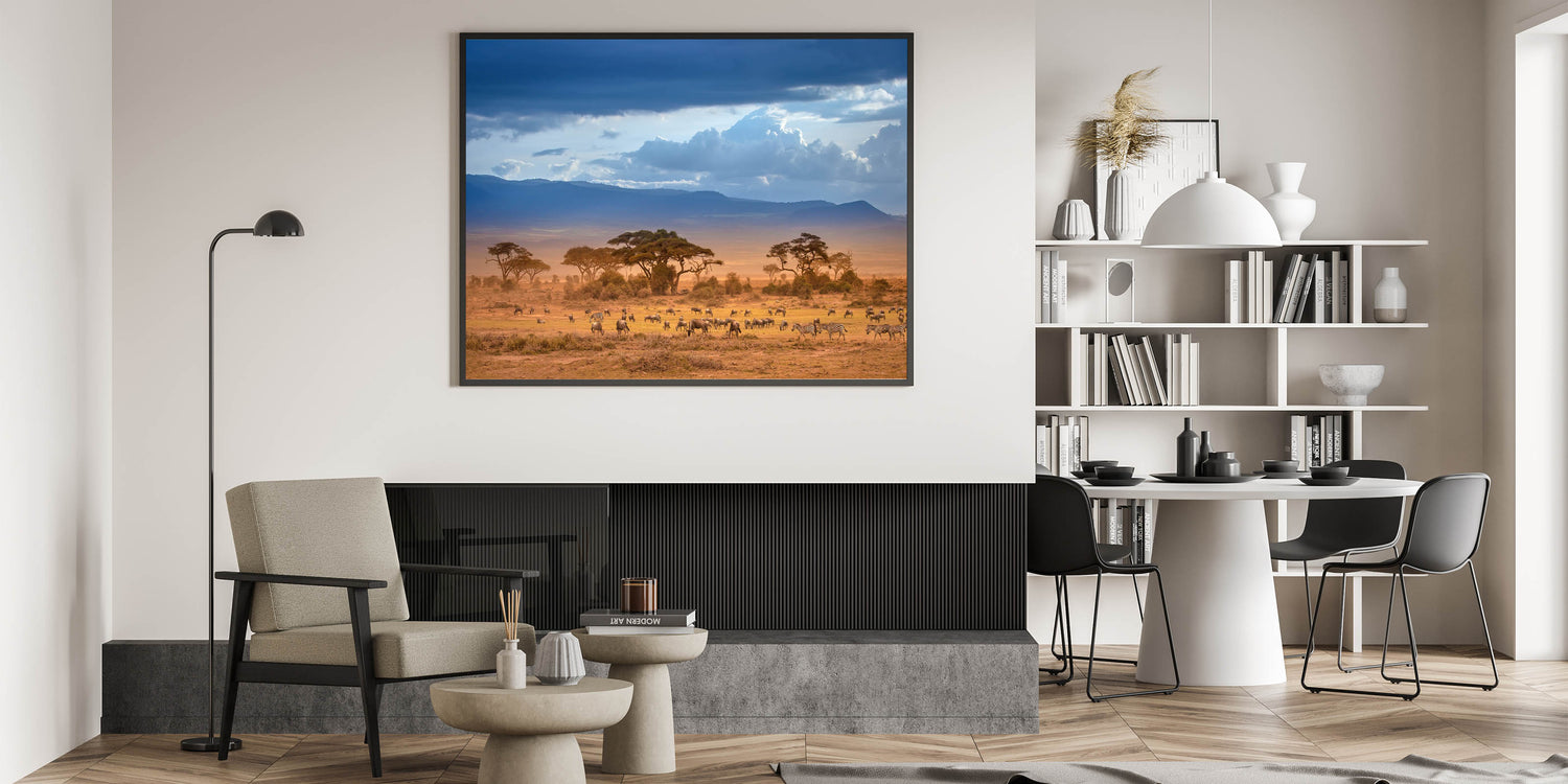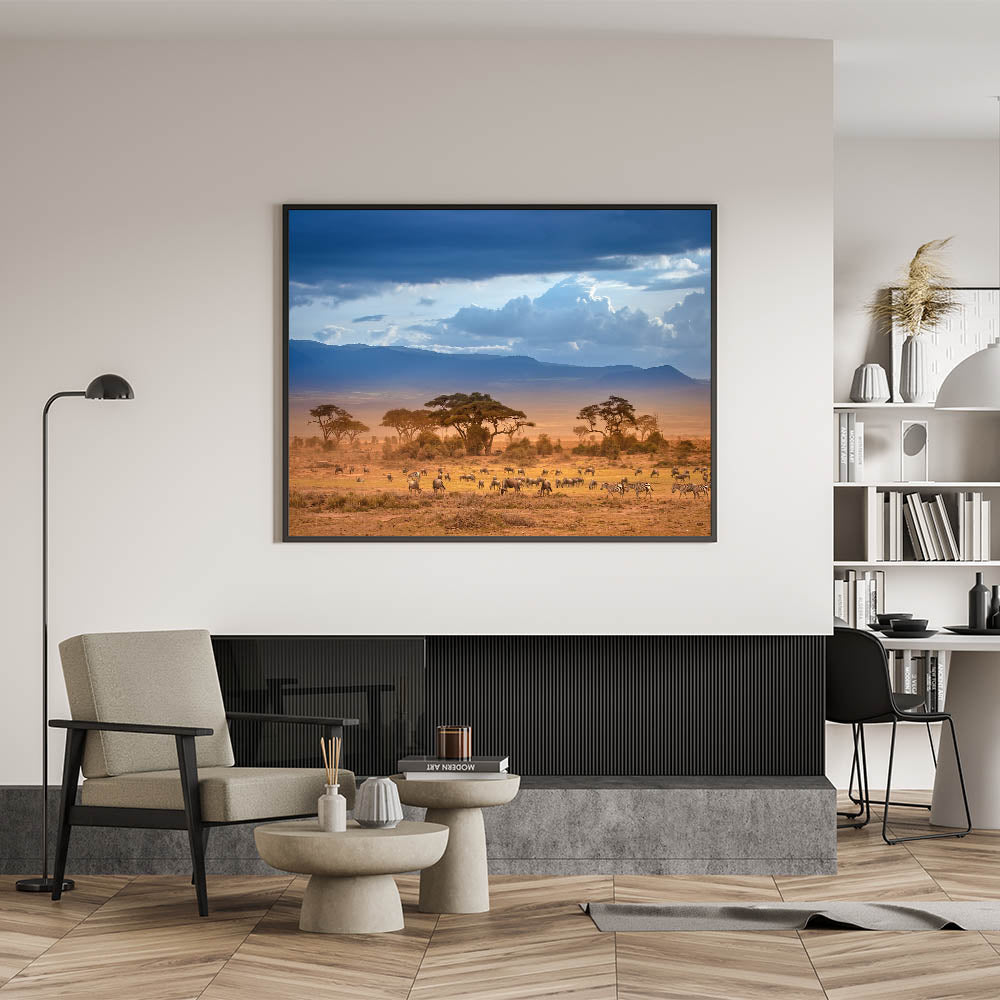 Capture the vast beauty of Kenya's African savannah with this breathtaking wall art. Depicting a tranquil scene of zebras and wildebeests grazing under the moody skies of a setting sun, this artwork encapsulates the serene yet powerful essence of the Kenyan wilderness. Perfect for those who admire the raw beauty of Africa’s landscapes, this piece brings the enchanting dusk of the savannah into your living space.
