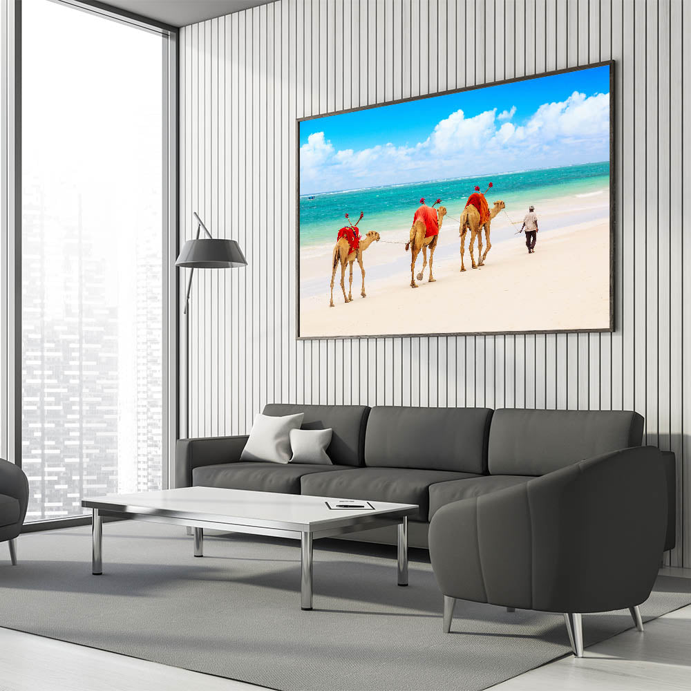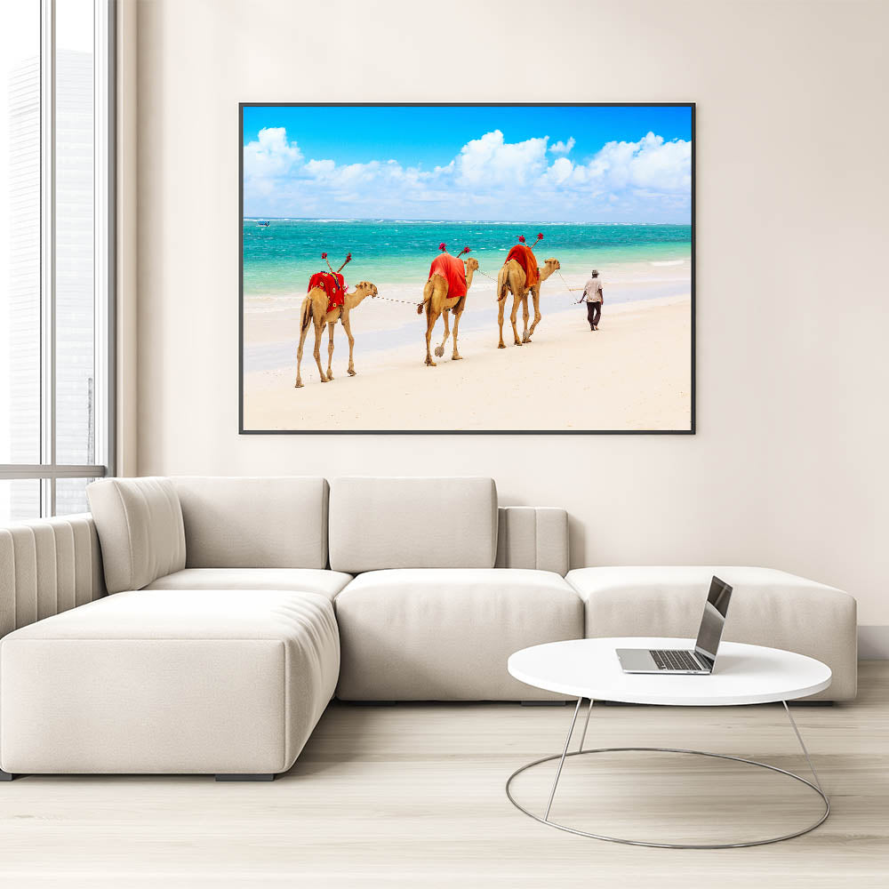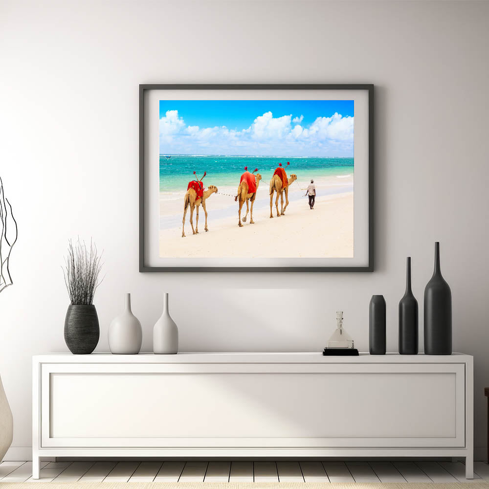 Colorful Camels on Kenyan Beach - Vibrant African Coastal Wall Art