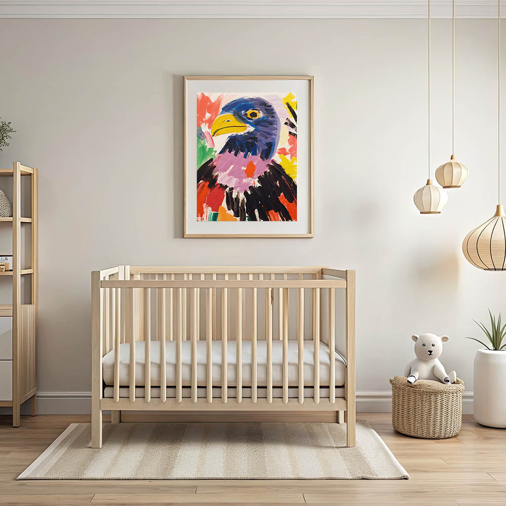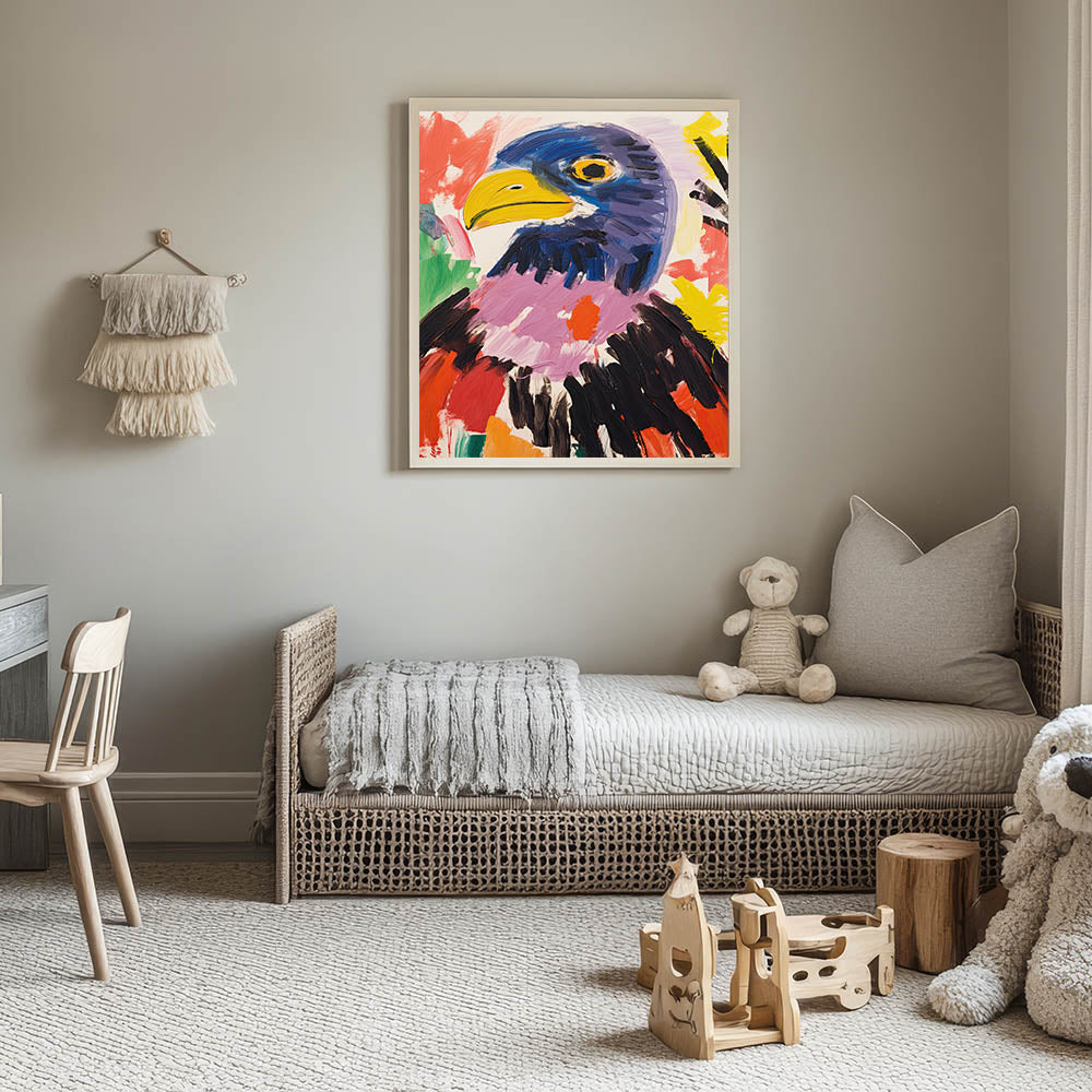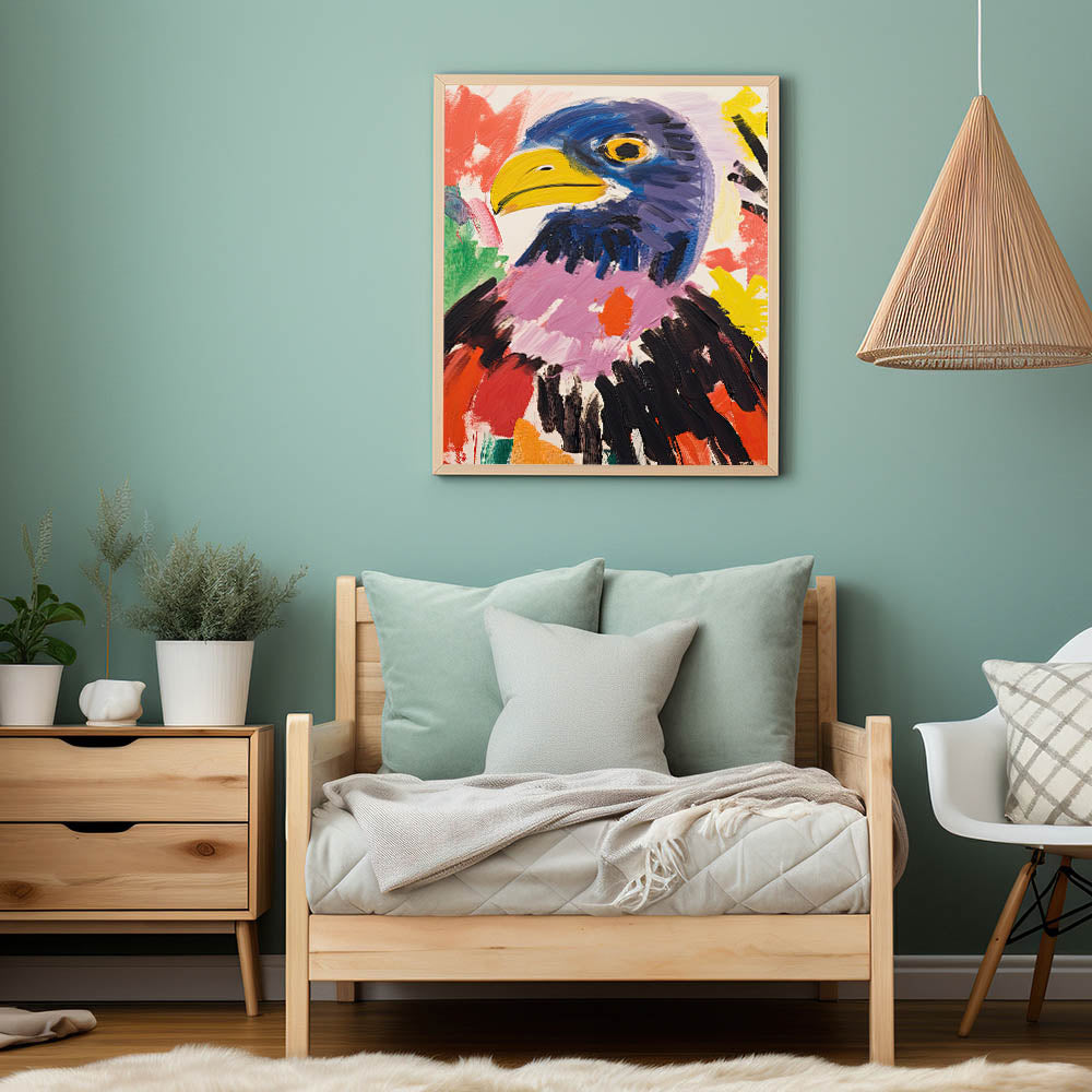 Inspire strength and confidence in your child’s space with this majestic eagle wall art, a bold and expressive piece that adds a touch of adventure. This children’s wall art print showcases a striking eagle with deep blue, black, and purple feathers, a vibrant yellow beak, and a lively background of reds, greens, and yellows, making it a perfect focal point for nurseries, playrooms, and kids' bedrooms.
