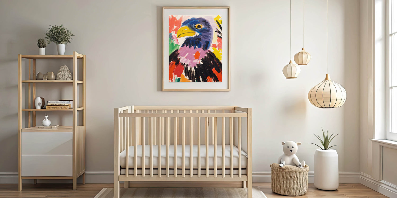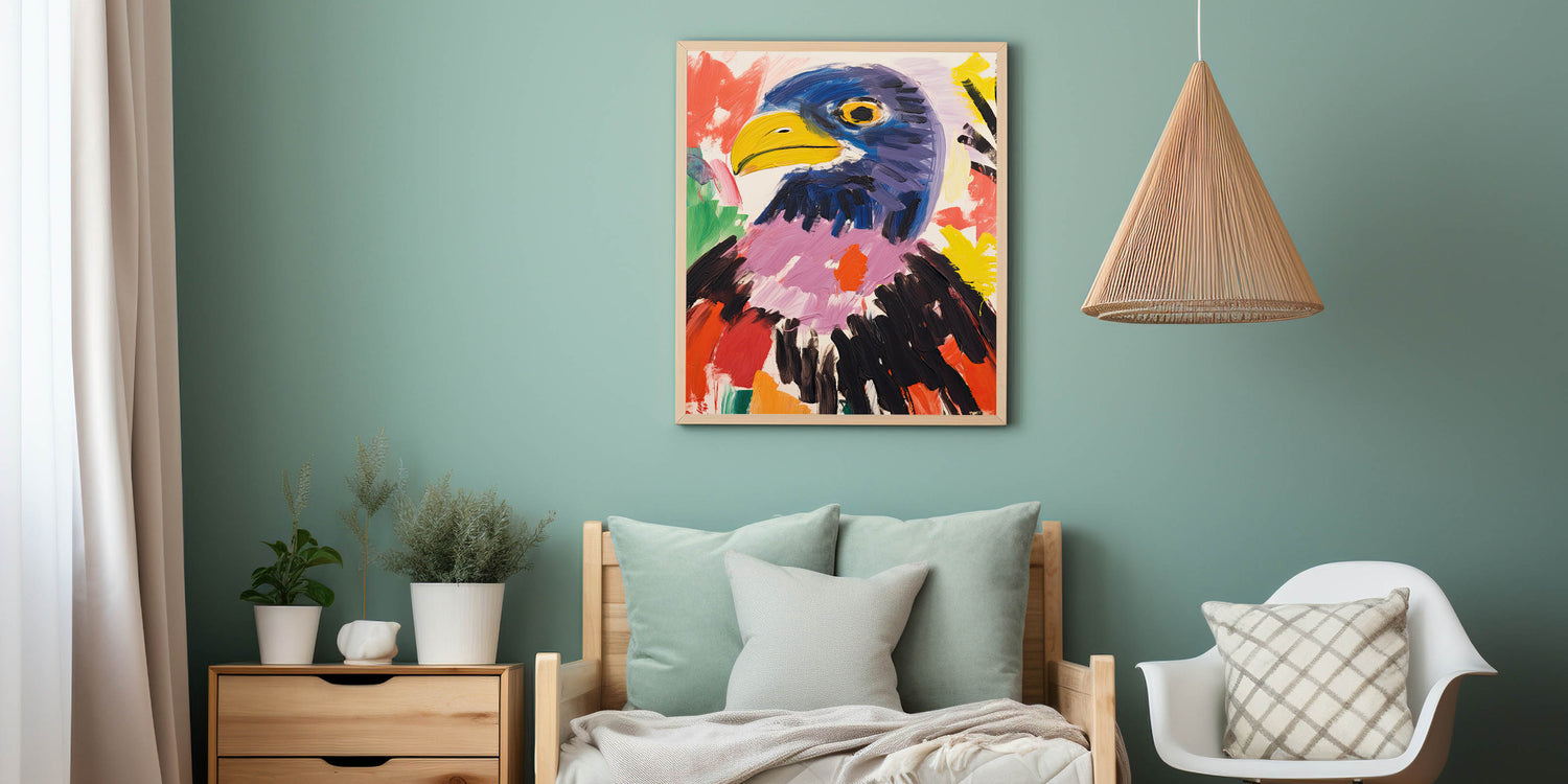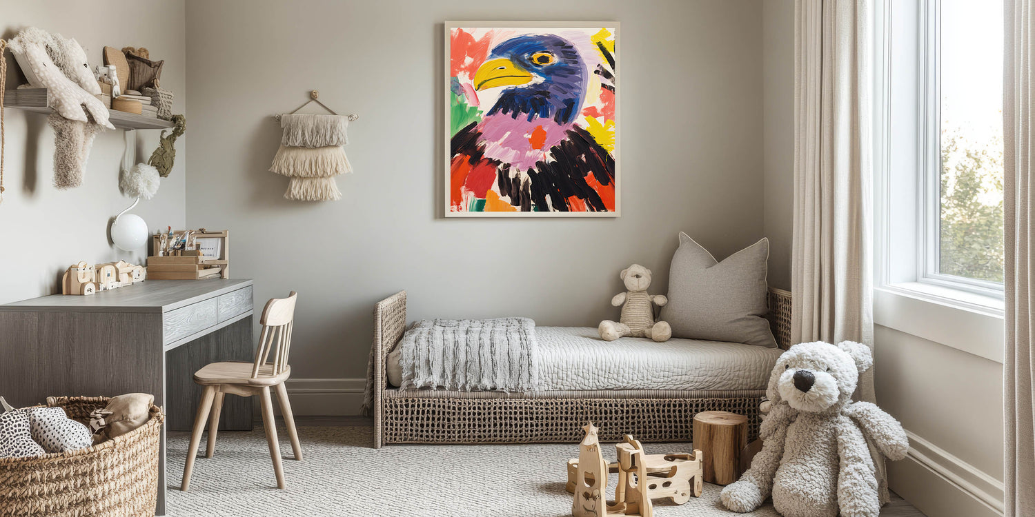 Inspire strength and confidence in your child’s space with this majestic eagle wall art, a bold and expressive piece that adds a touch of adventure. This children’s wall art print showcases a striking eagle with deep blue, black, and purple feathers, a vibrant yellow beak, and a lively background of reds, greens, and yellows, making it a perfect focal point for nurseries, playrooms, and kids' bedrooms.