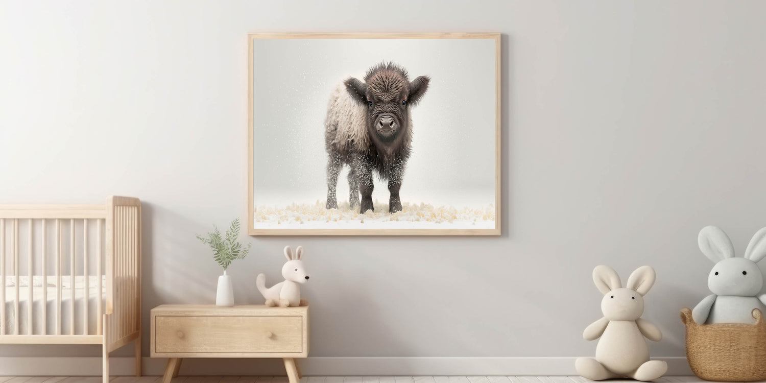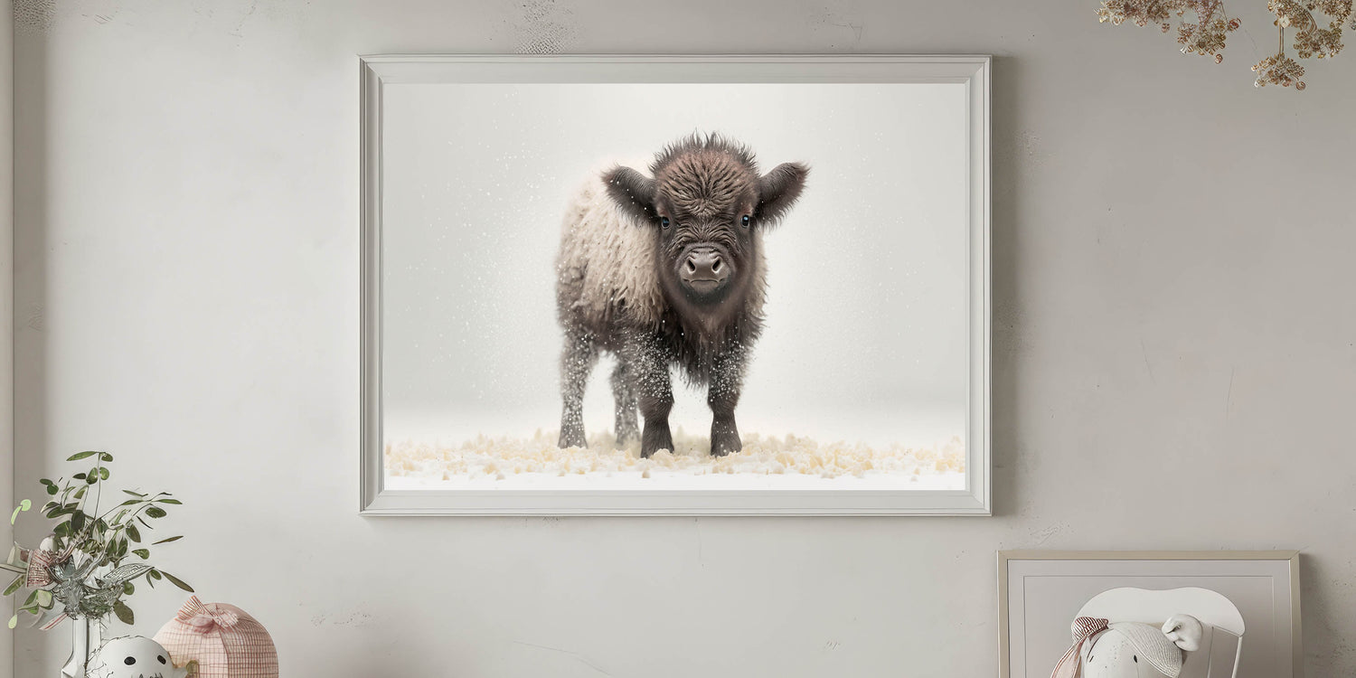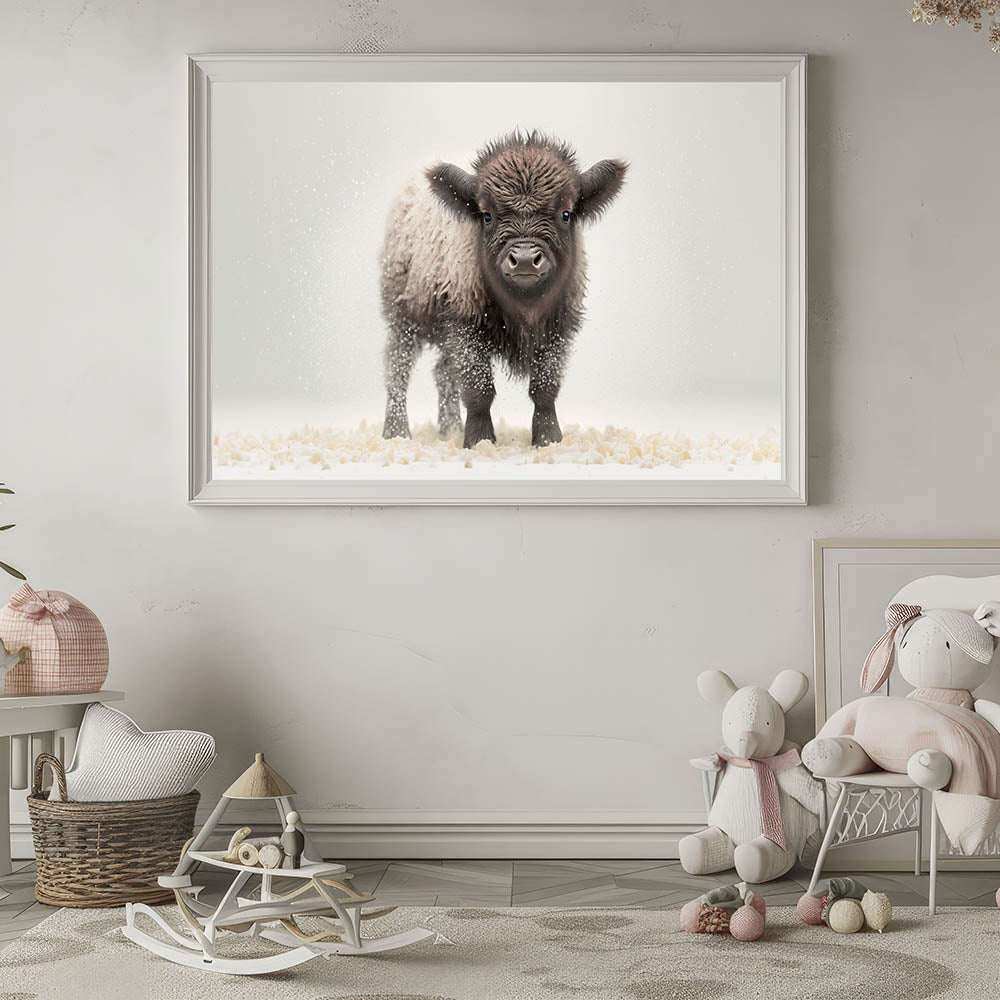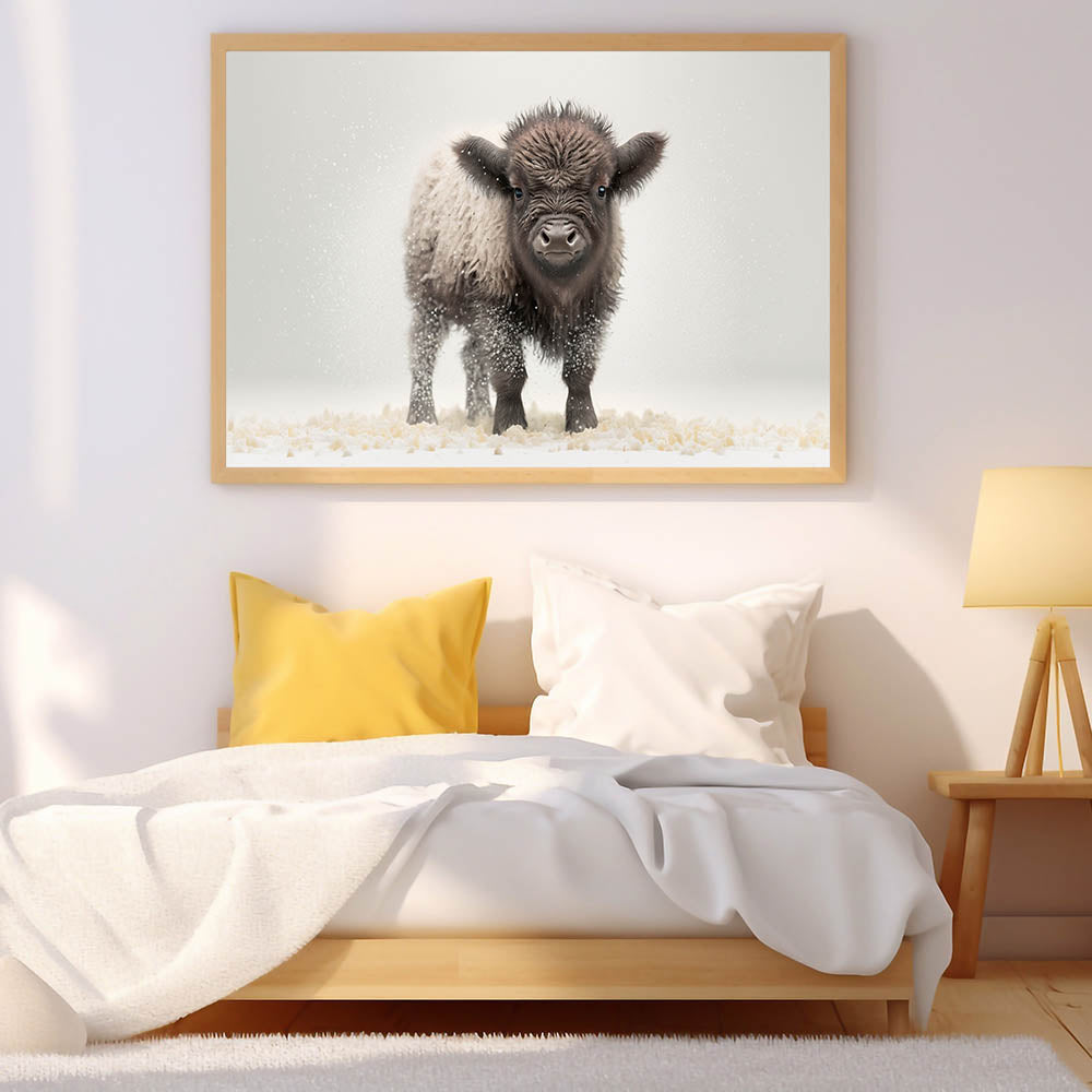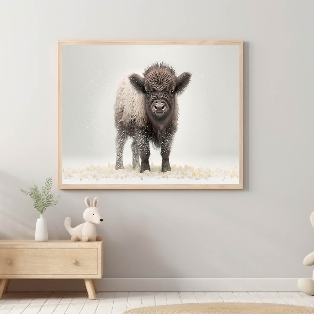 Introduce a touch of rustic charm to your child’s room with this delightful baby bison wall art. Featuring a fluffy, young bison in a snowy setting, this artwork radiates warmth and a sense of wonder. Ideal for nurseries, playrooms, or kids’ bedrooms, this design brings a gentle yet striking presence to any space.