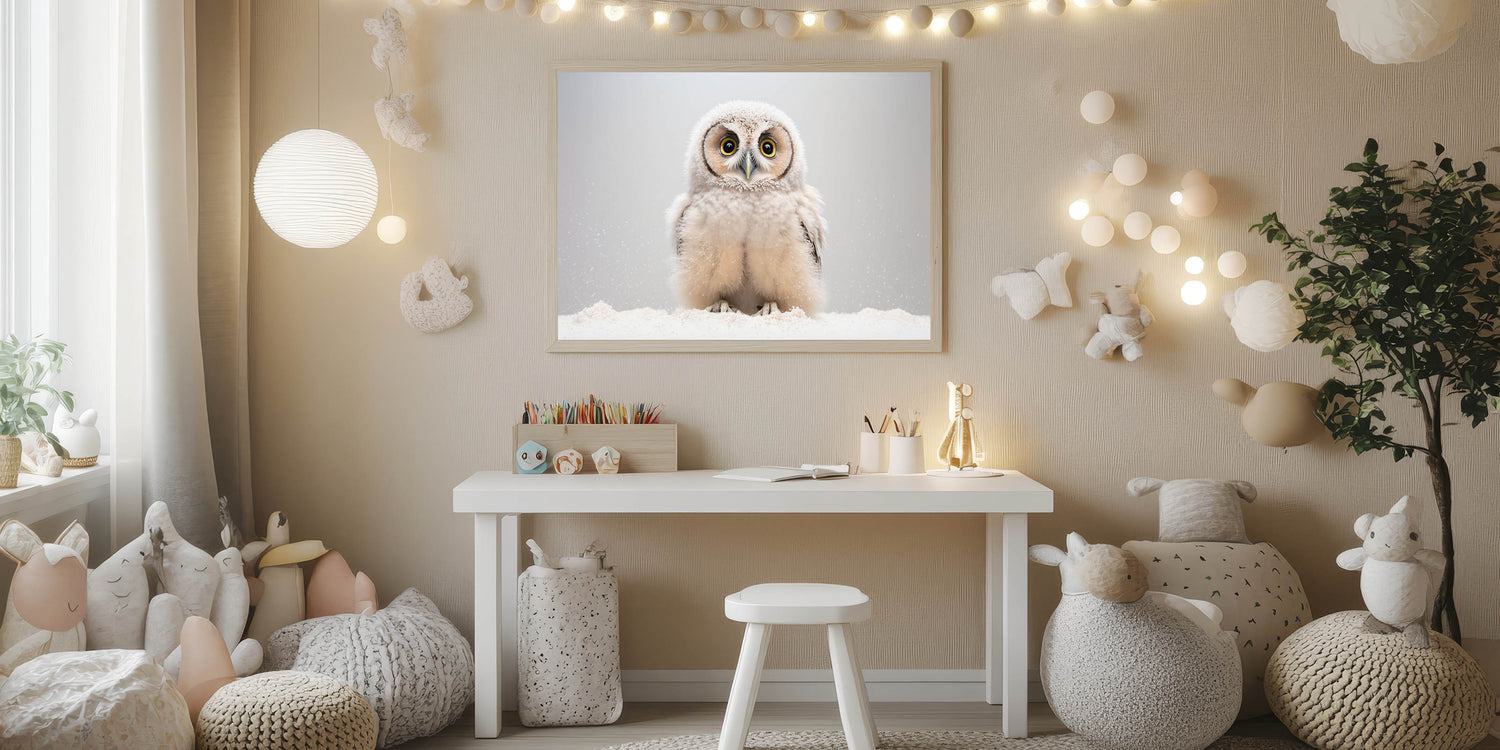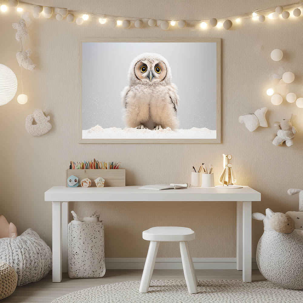 Transform your child’s room into a magical haven with this enchanting baby owl wall art. Perfect for nurseries, playrooms, or kids’ bedrooms, this artwork adds a touch of whimsy and warmth to any space. Featuring a beautifully detailed and fluffy owl against a soft backdrop, this design is ideal for creating a calming yet playful atmosphere.