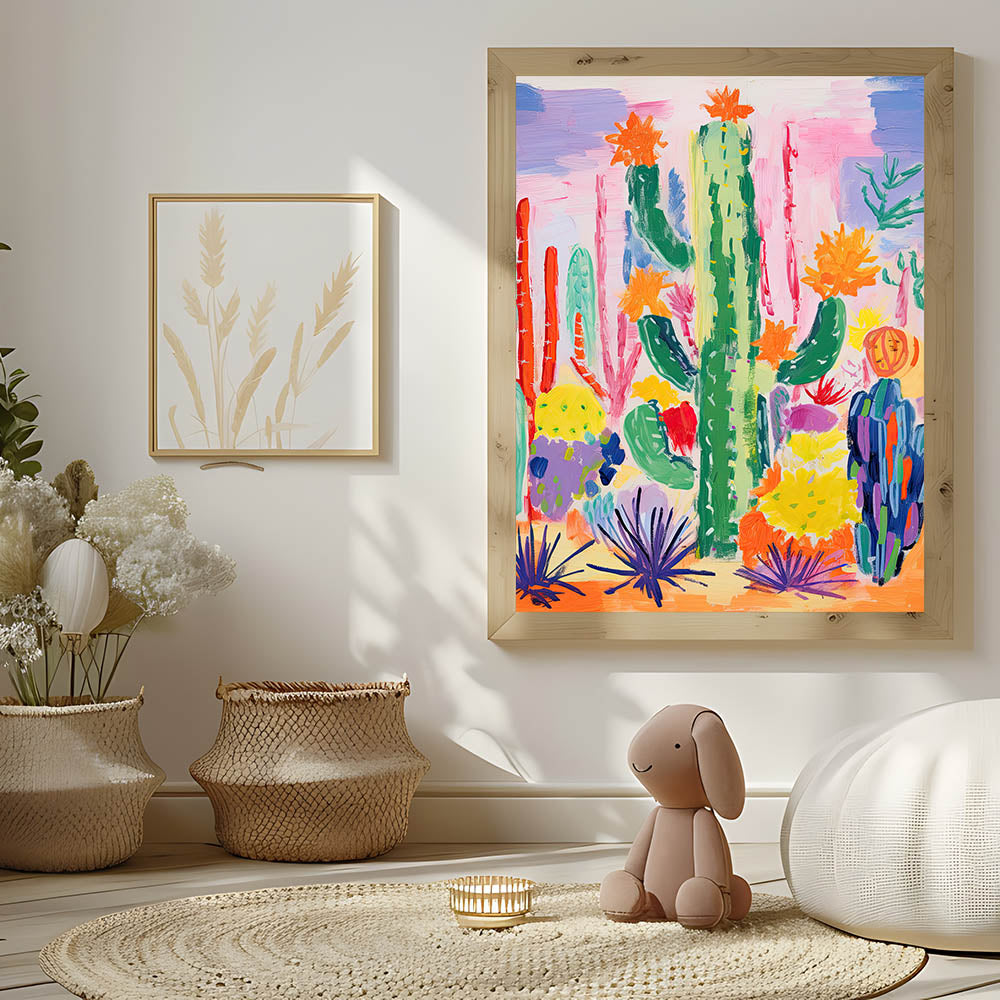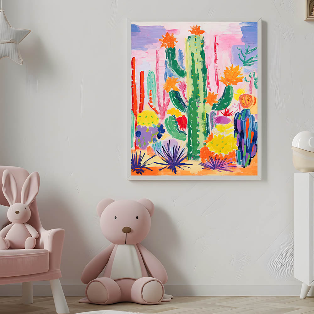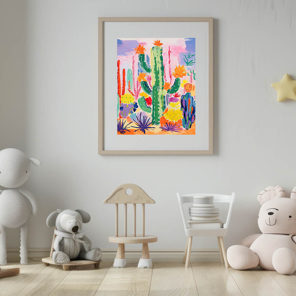 Add a touch of desert magic to your child’s space with this colorful cactus garden wall art. This children's wall art print captures a vibrant botanical landscape with green cacti, blooming orange flowers, and playful succulents, creating an inviting and artistic scene for nurseries and playrooms. The lively mix of greens, oranges, yellows, and purples makes this a perfect colorful art piece for kids' spaces.