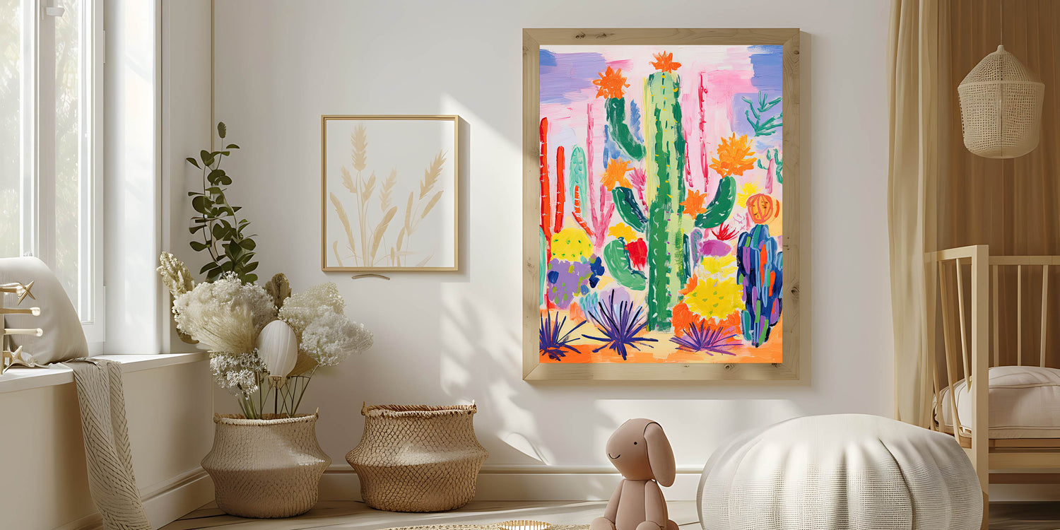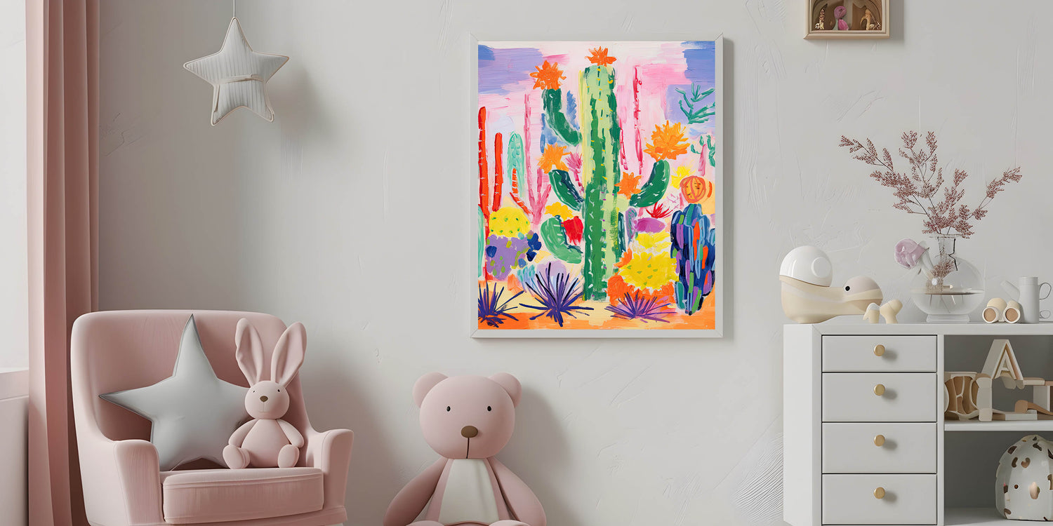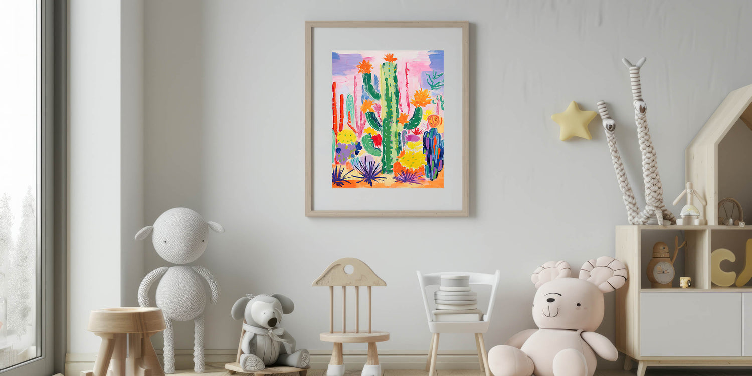 This whimsical children's wall decor is ideal for parents looking to add playroom wall art decor with a nature-inspired theme. Whether displayed as a stretched canvas, framed print, or rolled paper art print, this vibrant cactus scene will spark imagination and creativity in any child’s room.