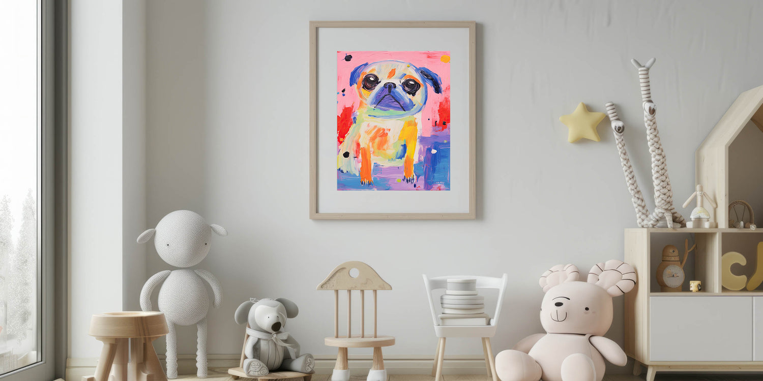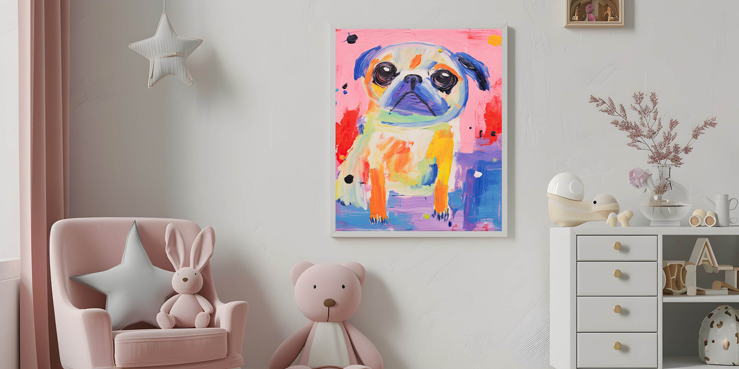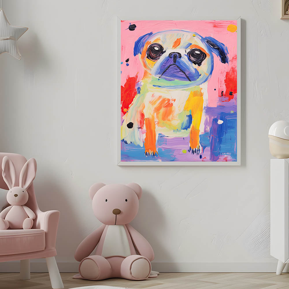 Brighten up your child's space with this colorful kids room wall art, featuring a playful pug in a lively mix of vibrant hues. This nursery wall art piece is perfect for dog lovers and adds a cheerful, artistic touch to any playroom, bedroom, or learning space.