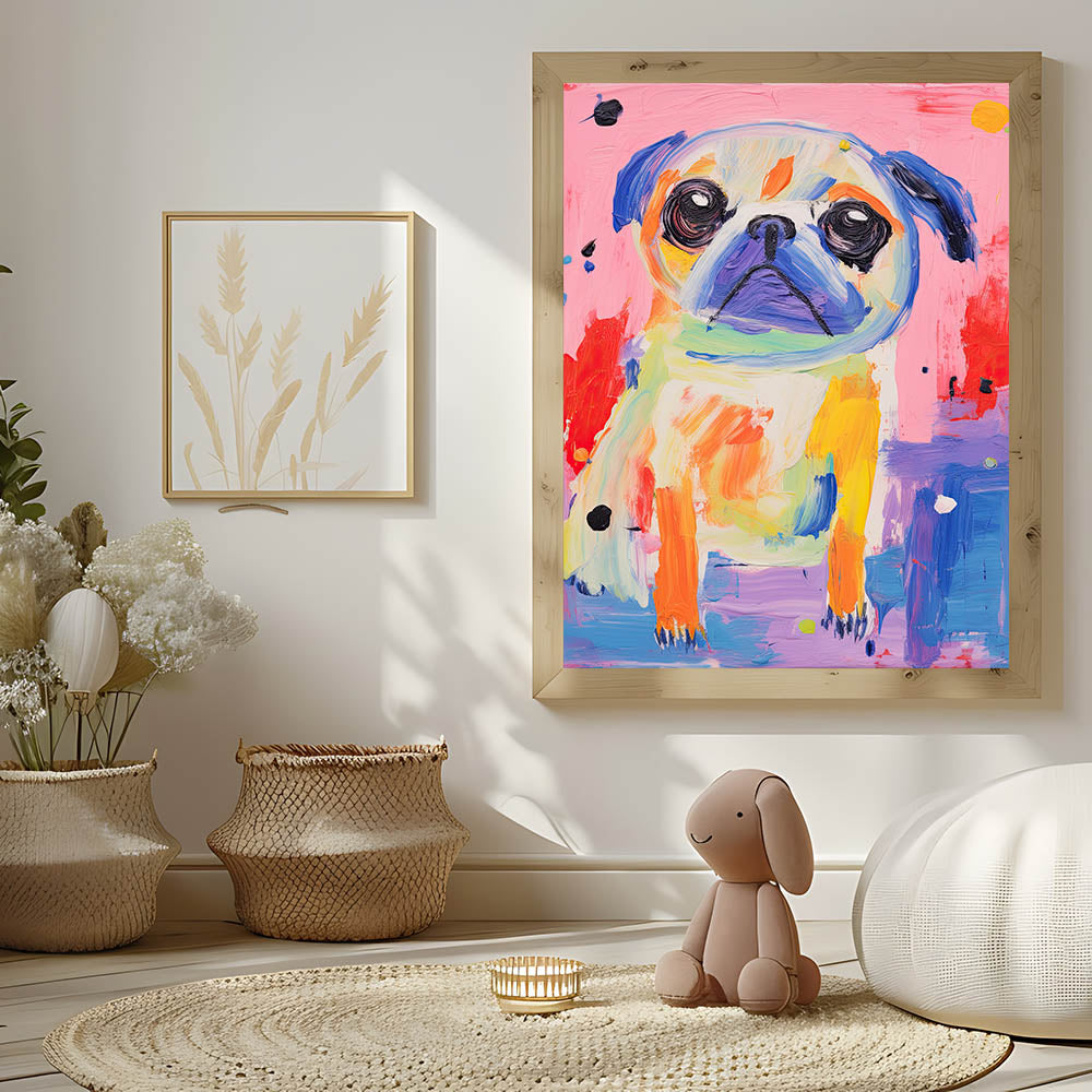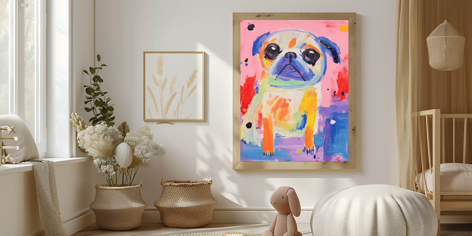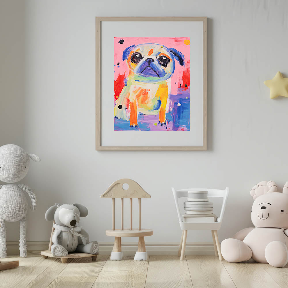 Brighten up your child's space with this colorful kids room wall art, featuring a playful pug in a lively mix of vibrant hues. This nursery wall art piece is perfect for dog lovers and adds a cheerful, artistic touch to any playroom, bedroom, or learning space.