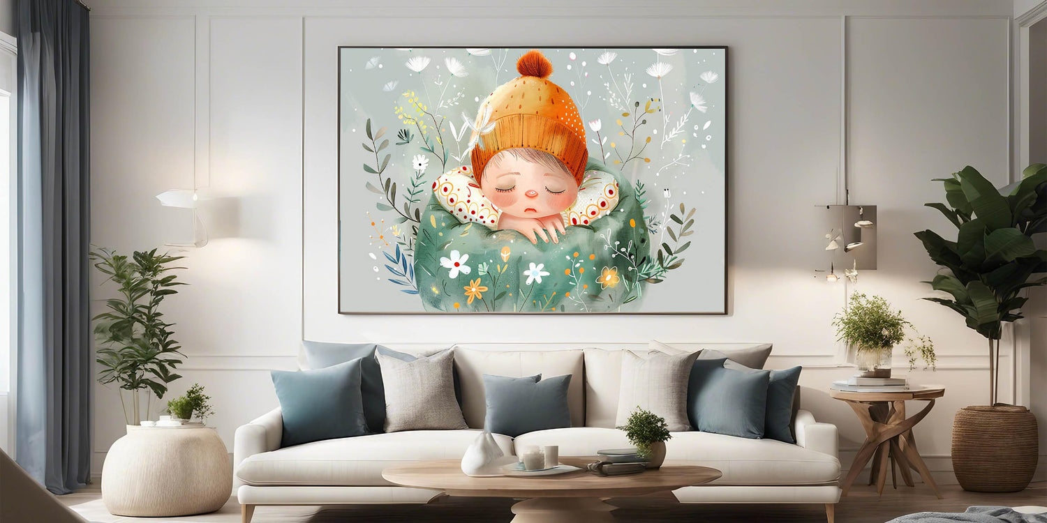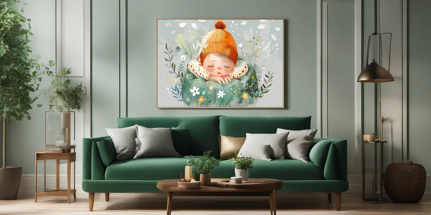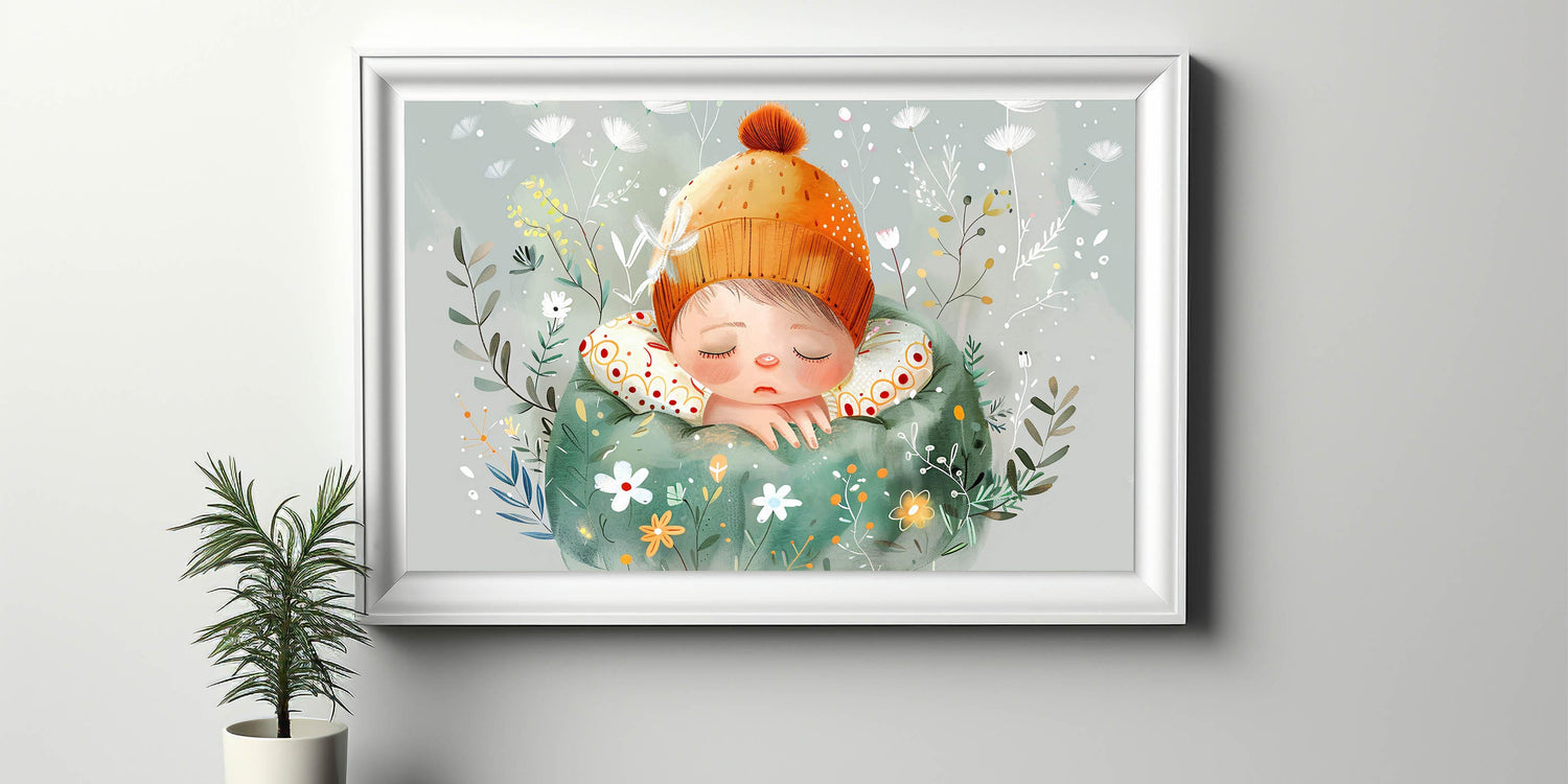 Add a touch of serenity and whimsy to your child’s room with this enchanting "Dreamy Nap" wall art. This charming design features a peaceful child cozily tucked in with a vibrant orange beanie and surrounded by a magical garden of whimsical flowers and delicate greenery. Rendered in soothing tones of green, orange, and cream, this artwork is perfect for creating a calming and inviting atmosphere in nurseries, kids’ rooms, or playrooms.
