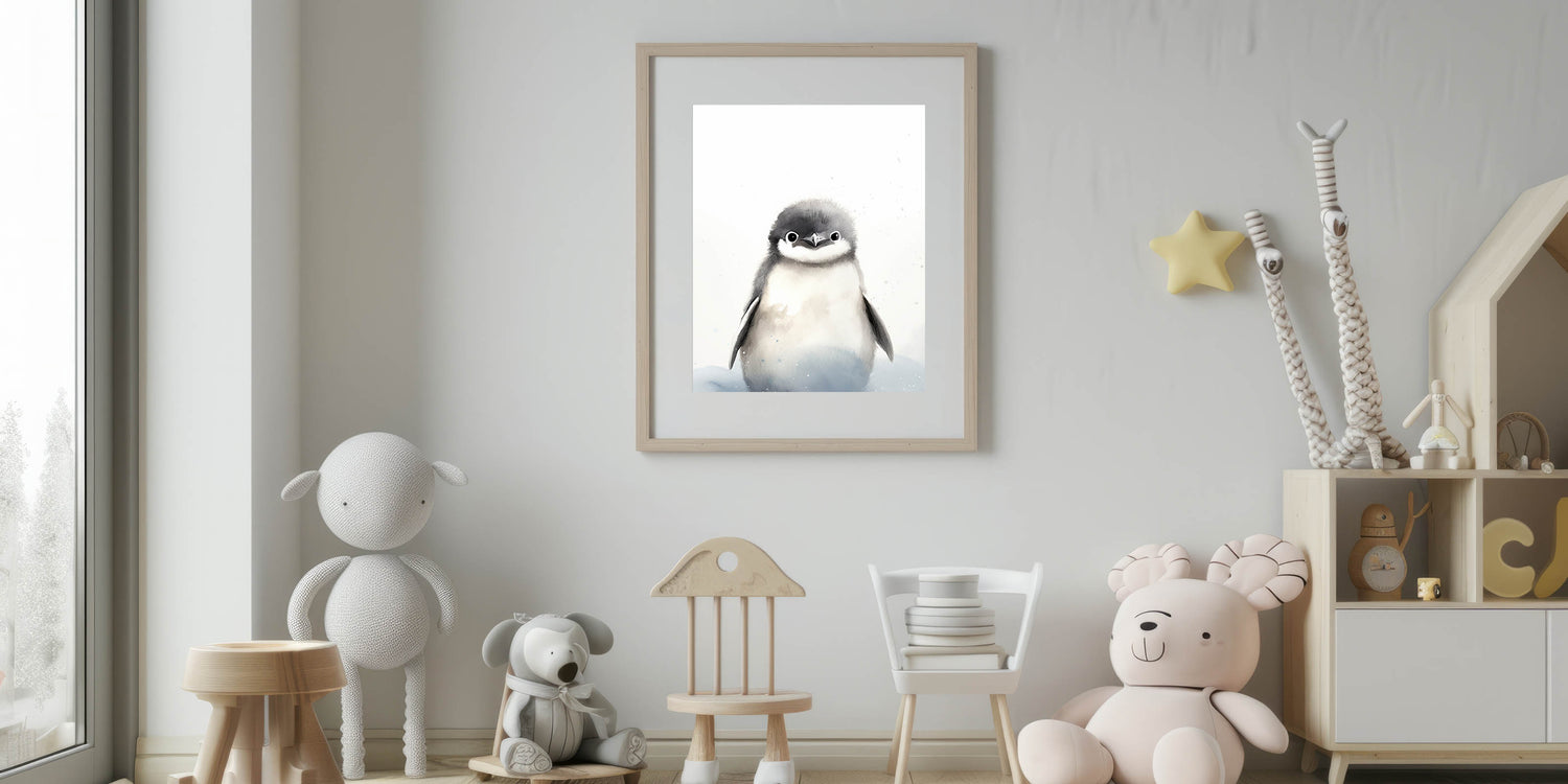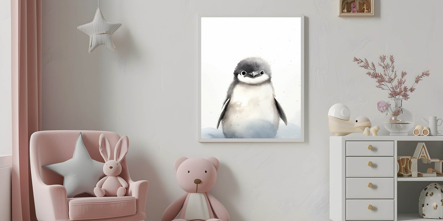 Bring charm and coziness to your child’s space with this Framed Canvas Art for Children, featuring an adorable baby penguin in soft black, white, and gray watercolor tones. This minimalist yet playful design is perfect for nurseries, playrooms, and kids' bedrooms, adding a soothing and heartwarming touch to any décor.