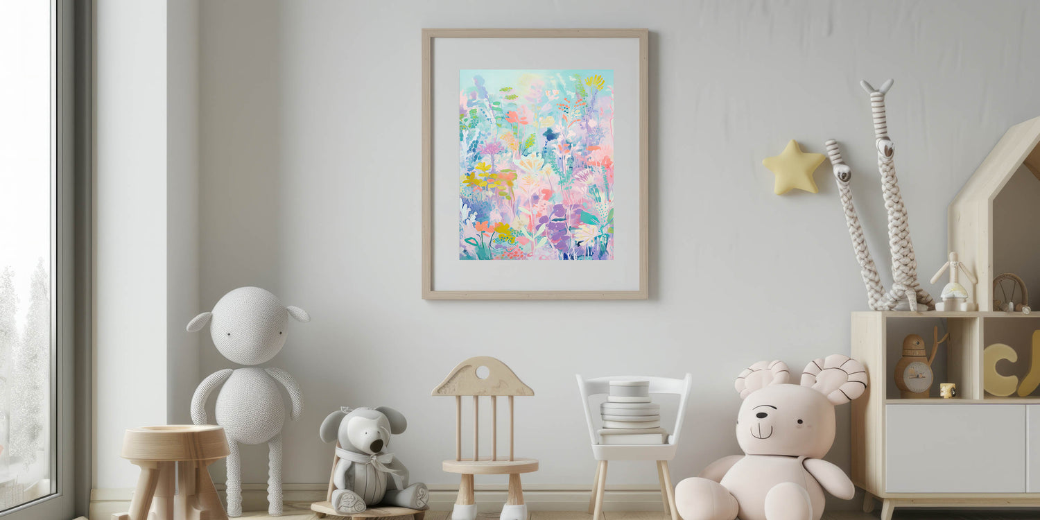 Transform your child’s space into a dreamy garden with this Rolled Canvas Print for Kids Rooms, featuring a soft and whimsical floral design in pastel hues. This Kids Room Wall Art is perfect for nurseries, playrooms, and bedrooms, creating a peaceful and enchanting atmosphere with its delicate colors and abstract botanical elements.