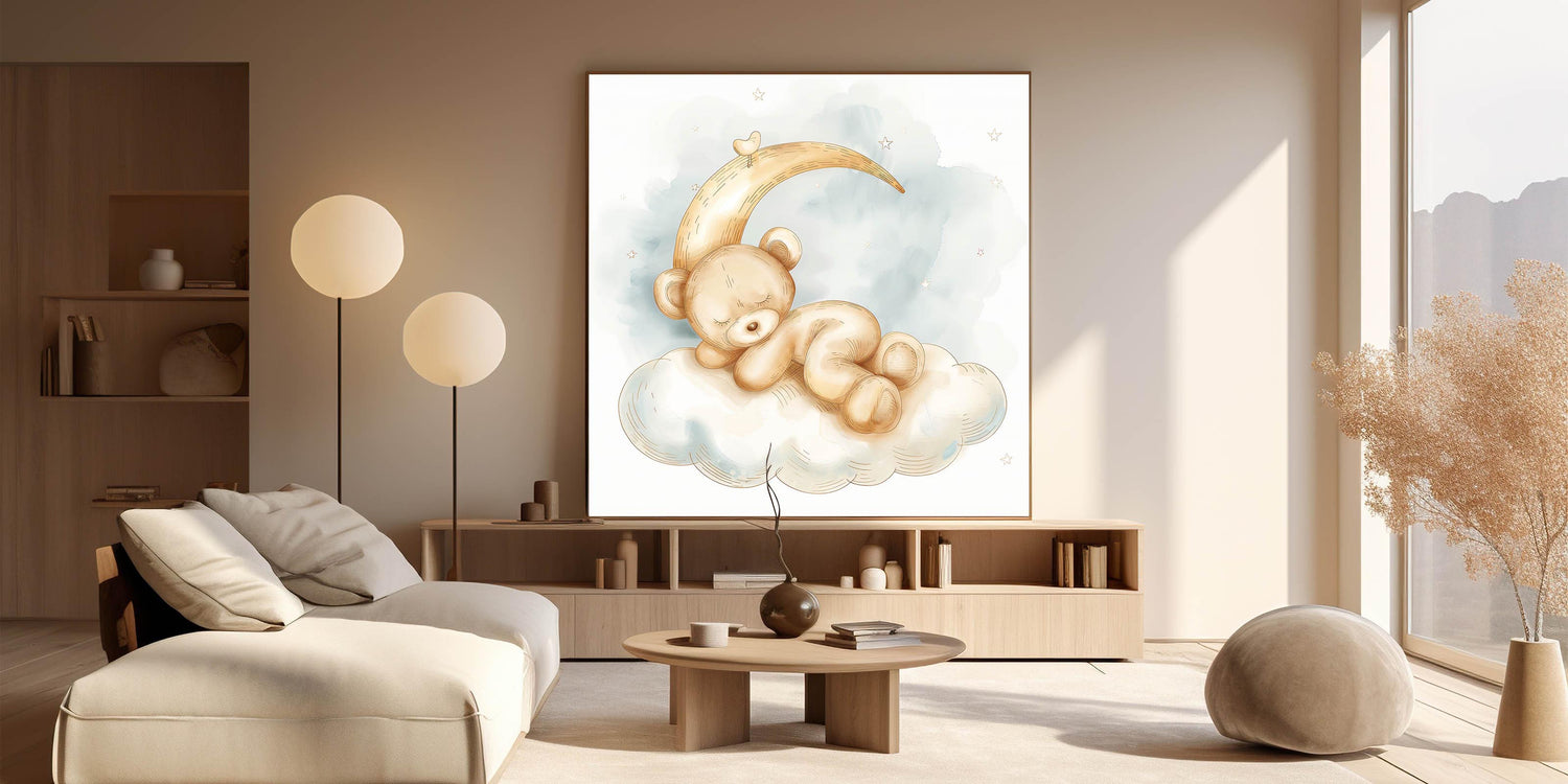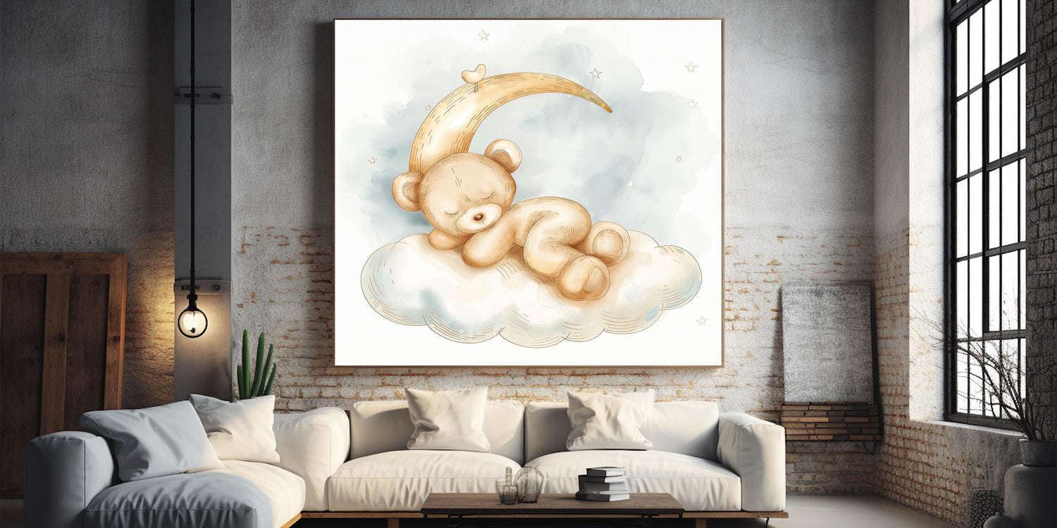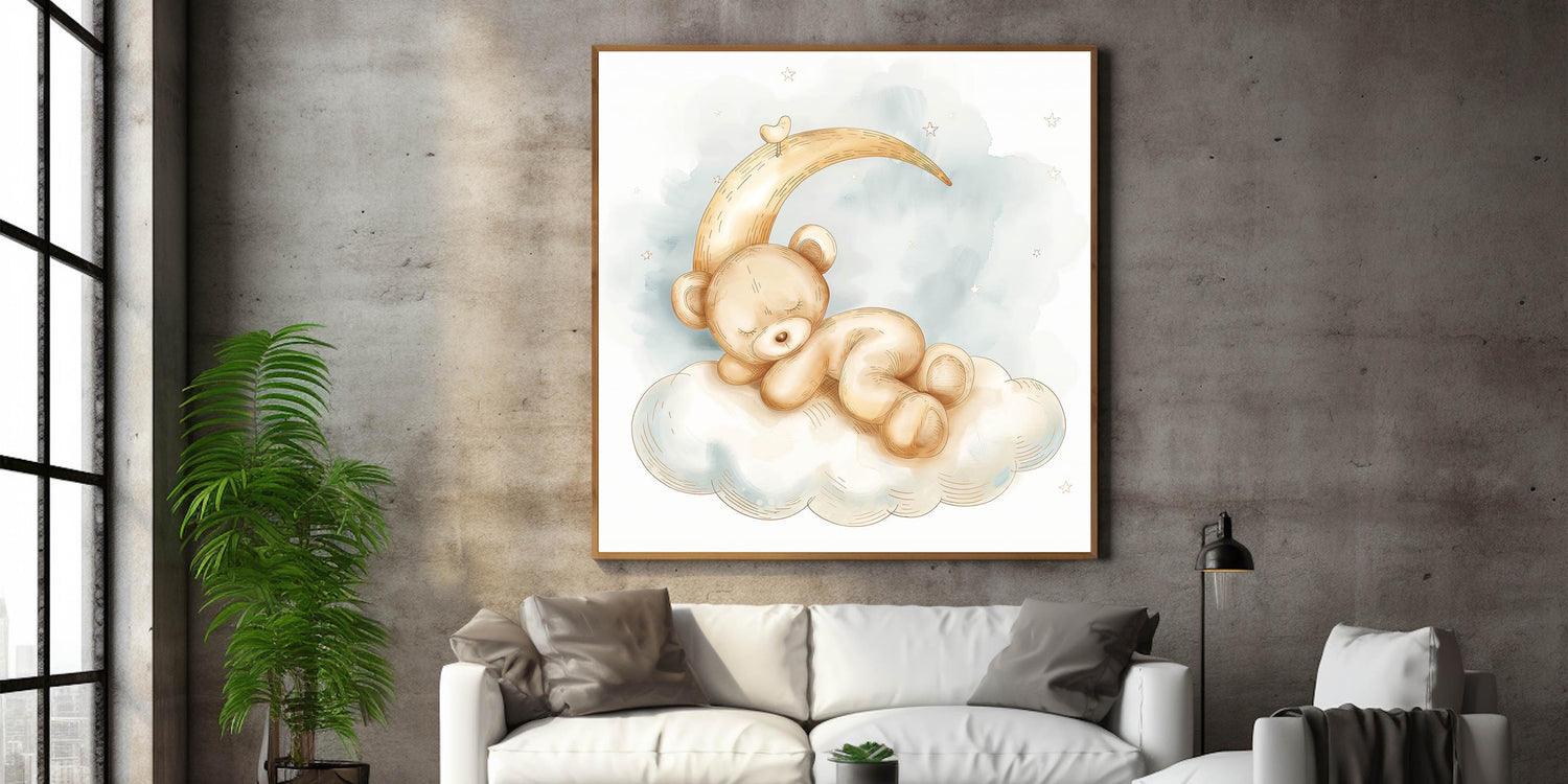 Create a calming and magical atmosphere in your child’s room with this charming "Sleepy Bear" wall art. This adorable design features a sweet teddy bear peacefully resting on a soft cloud beneath a glowing crescent moon, surrounded by twinkling stars. Rendered in gentle shades of beige, cream, and soft blue, this artwork is perfect for nurseries, kids' rooms, or playrooms, offering a sense of tranquility and comfort to any space.