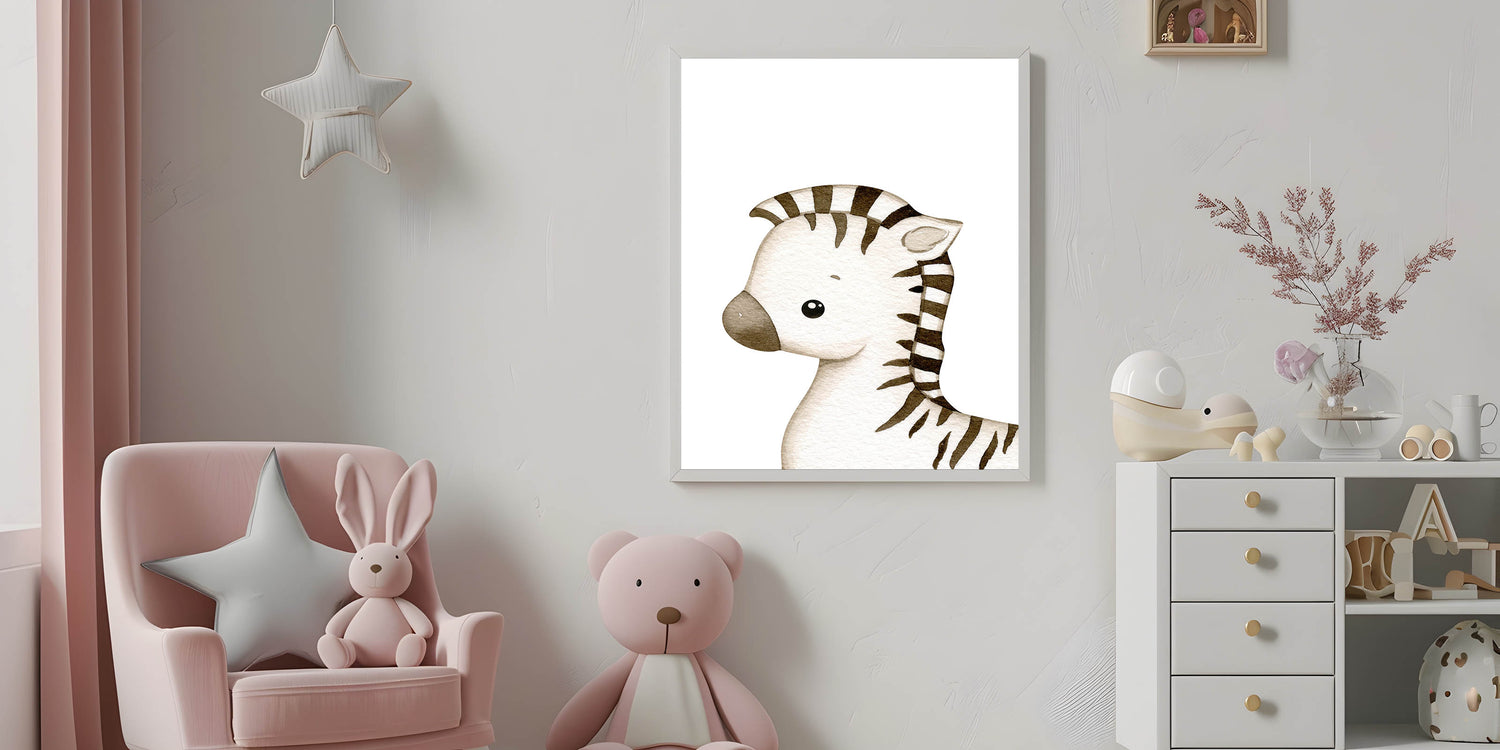 - Personalized Children's Art Prints with a soft and playful zebra design.