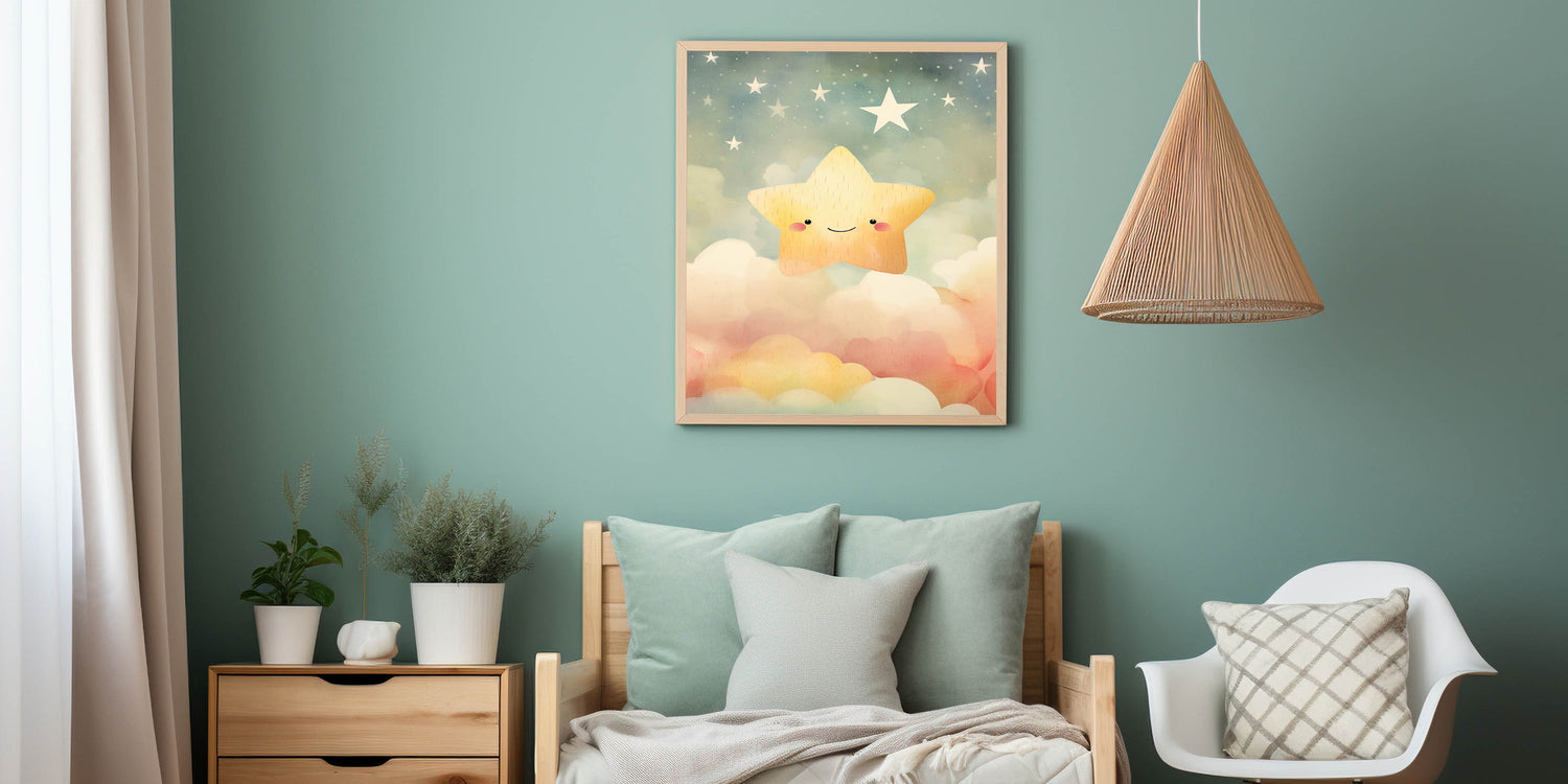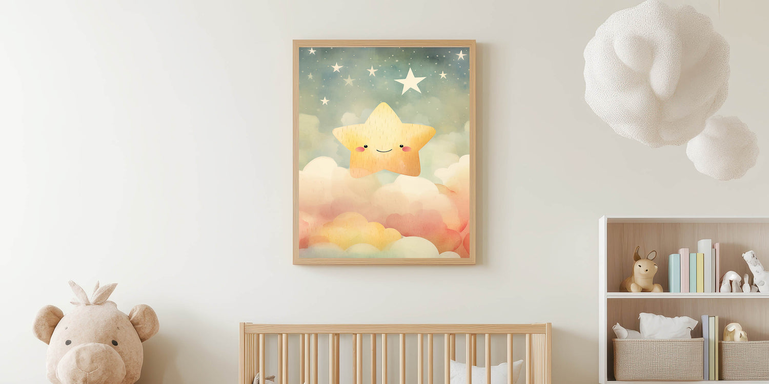 Add a touch of magic and warmth to your child's space with this Stretched Canvas Art for Kids, featuring a smiling star floating among soft clouds in a dreamy night sky. The gold, beige, soft pink, and light blue hues create a calming and soothing ambiance, making it a perfect addition to nurseries, playrooms, or children's bedrooms.