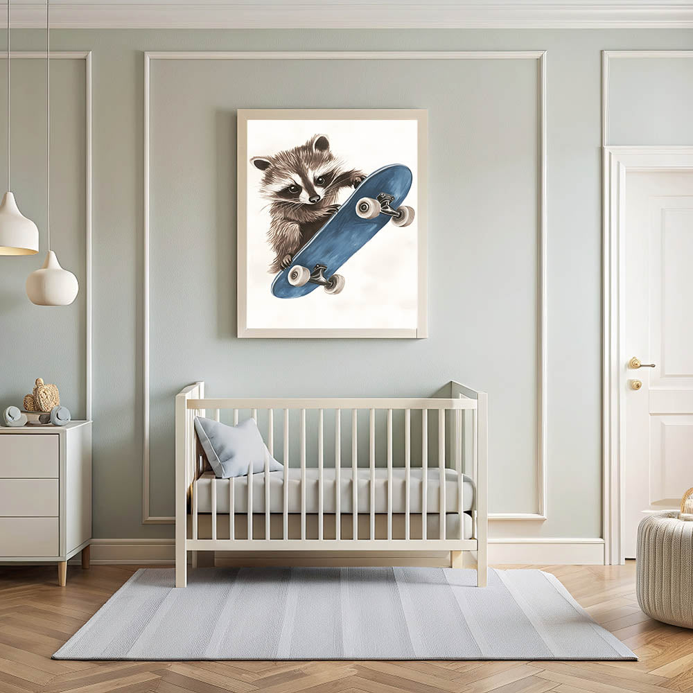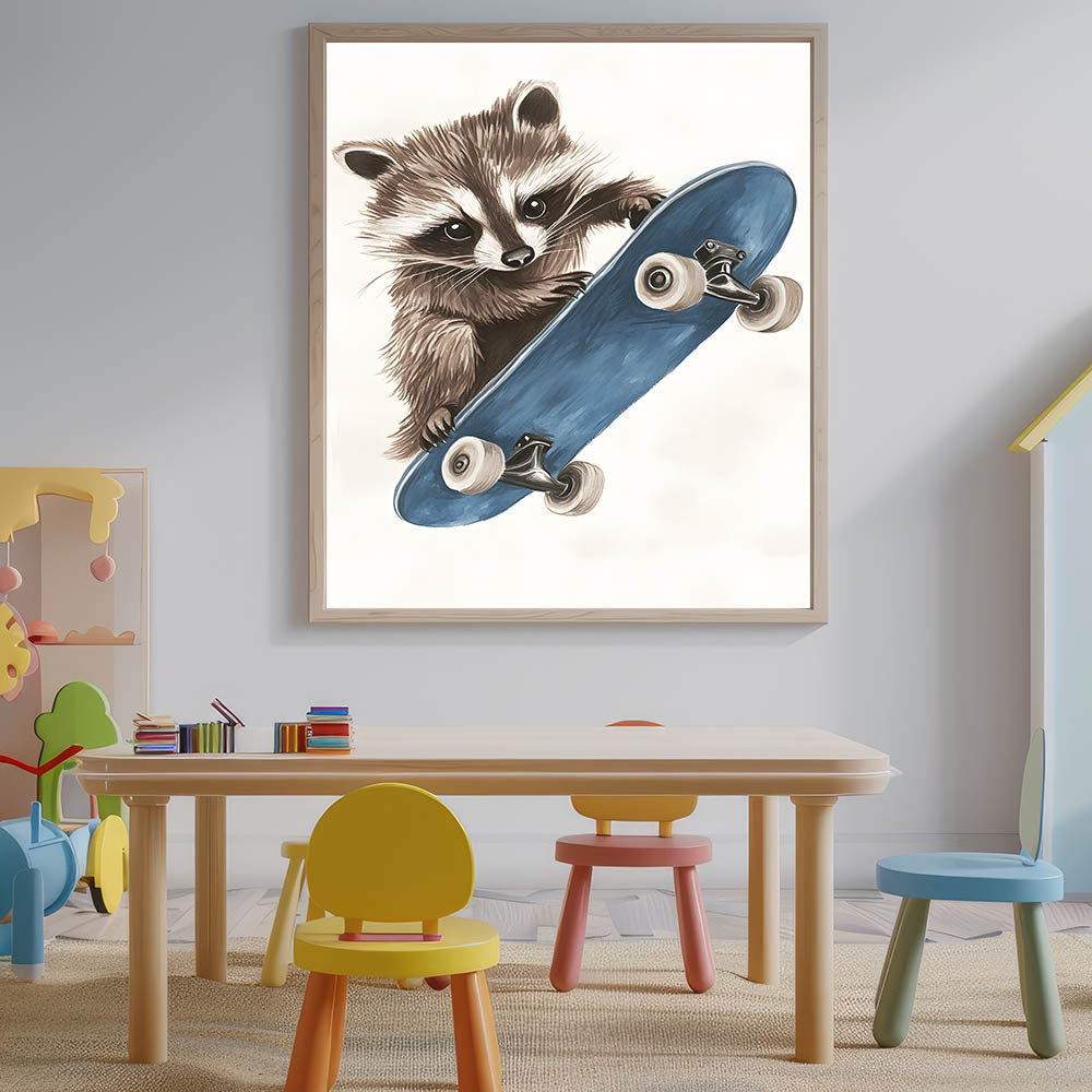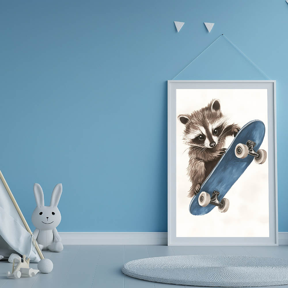 Add a touch of fun and adventure to your child’s space with this Raccoon Skateboard Nursery Wall Art. Featuring a playful raccoon gripping a blue skateboard, this artwork captures a sense of movement and excitement, making it an ideal addition to baby room decor and children’s wall art collections. The combination of brown, gray, and blue tones blends well with various nursery themes.