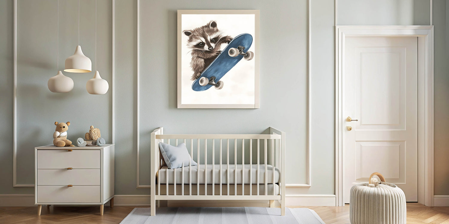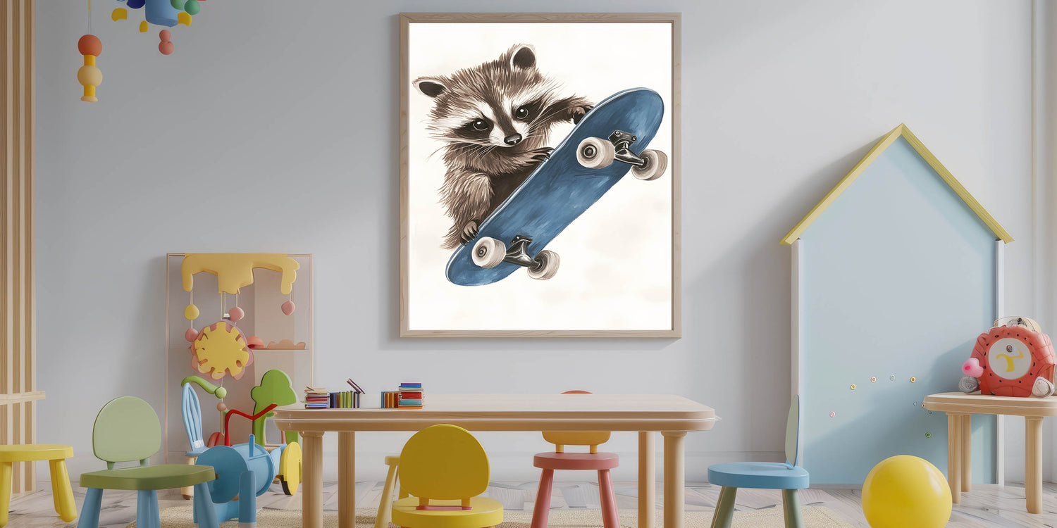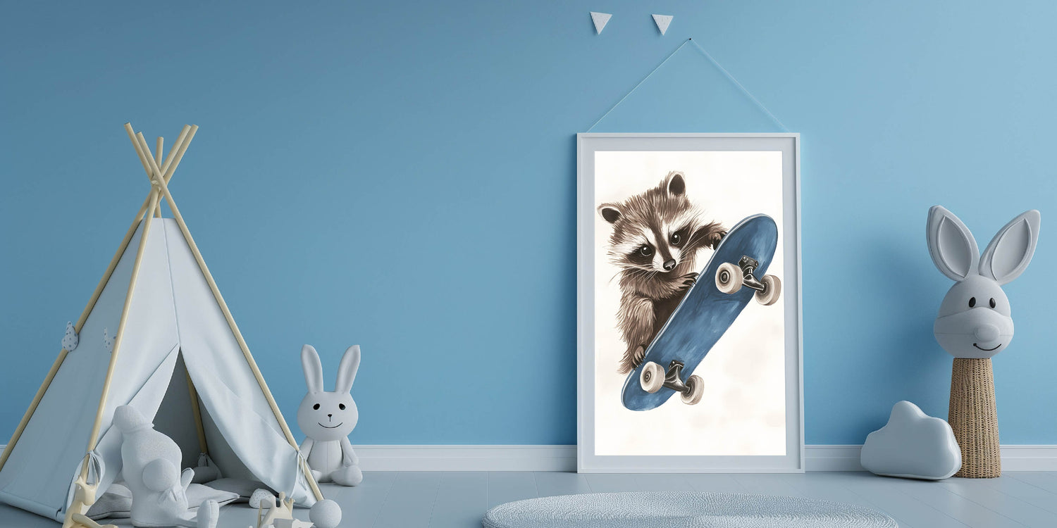 Add a touch of fun and adventure to your child’s space with this Raccoon Skateboard Nursery Wall Art. Featuring a playful raccoon gripping a blue skateboard, this artwork captures a sense of movement and excitement, making it an ideal addition to baby room decor and children’s wall art collections. The combination of brown, gray, and blue tones blends well with various nursery themes.
