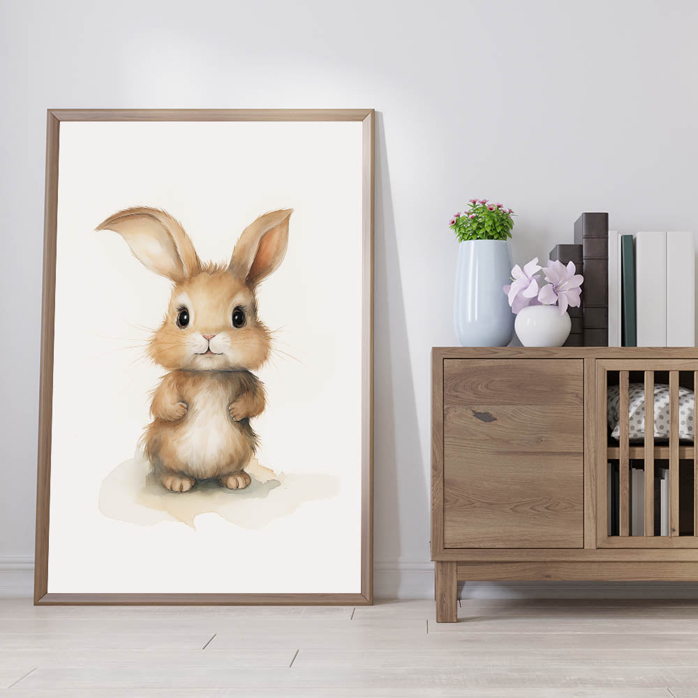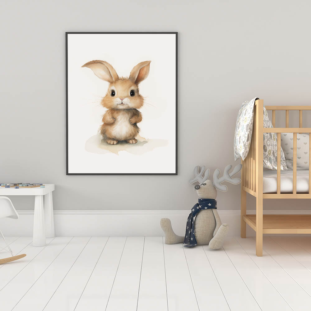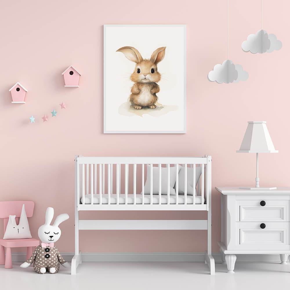 Add a touch of charm and warmth to your little one's space with this adorable bunny nursery wall art. Featuring a beautifully illustrated fluffy rabbit with soft watercolor textures, this children’s wall art is perfect for creating a soothing and magical atmosphere in any nursery, toddler's room, or playroom.