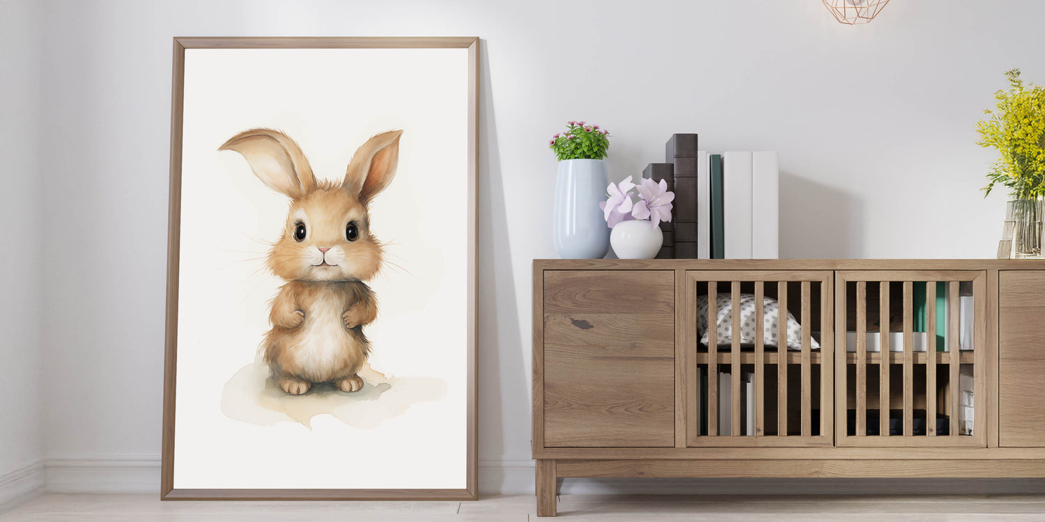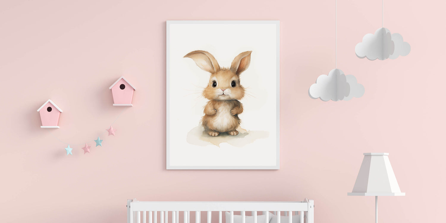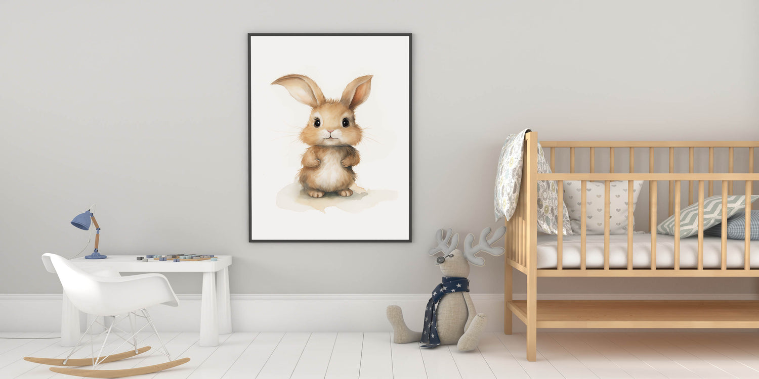 Add a touch of charm and warmth to your little one's space with this adorable bunny nursery wall art. Featuring a beautifully illustrated fluffy rabbit with soft watercolor textures, this children’s wall art is perfect for creating a soothing and magical atmosphere in any nursery, toddler's room, or playroom.