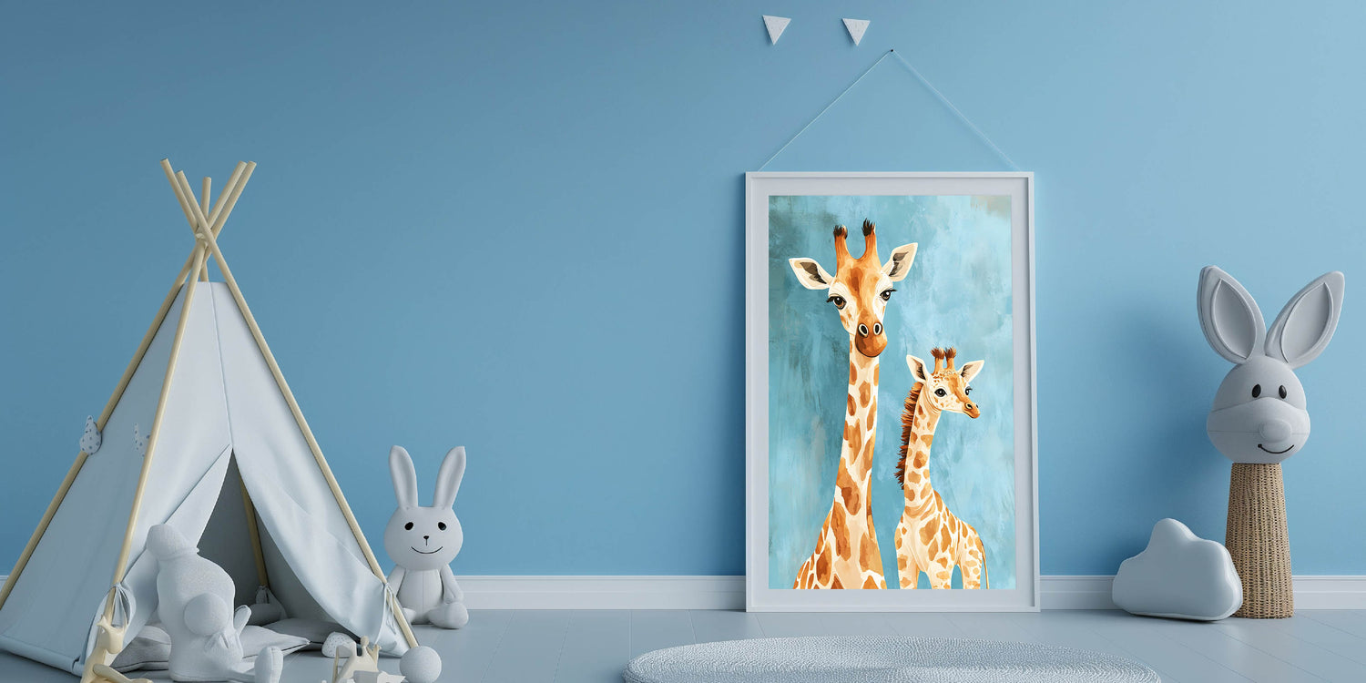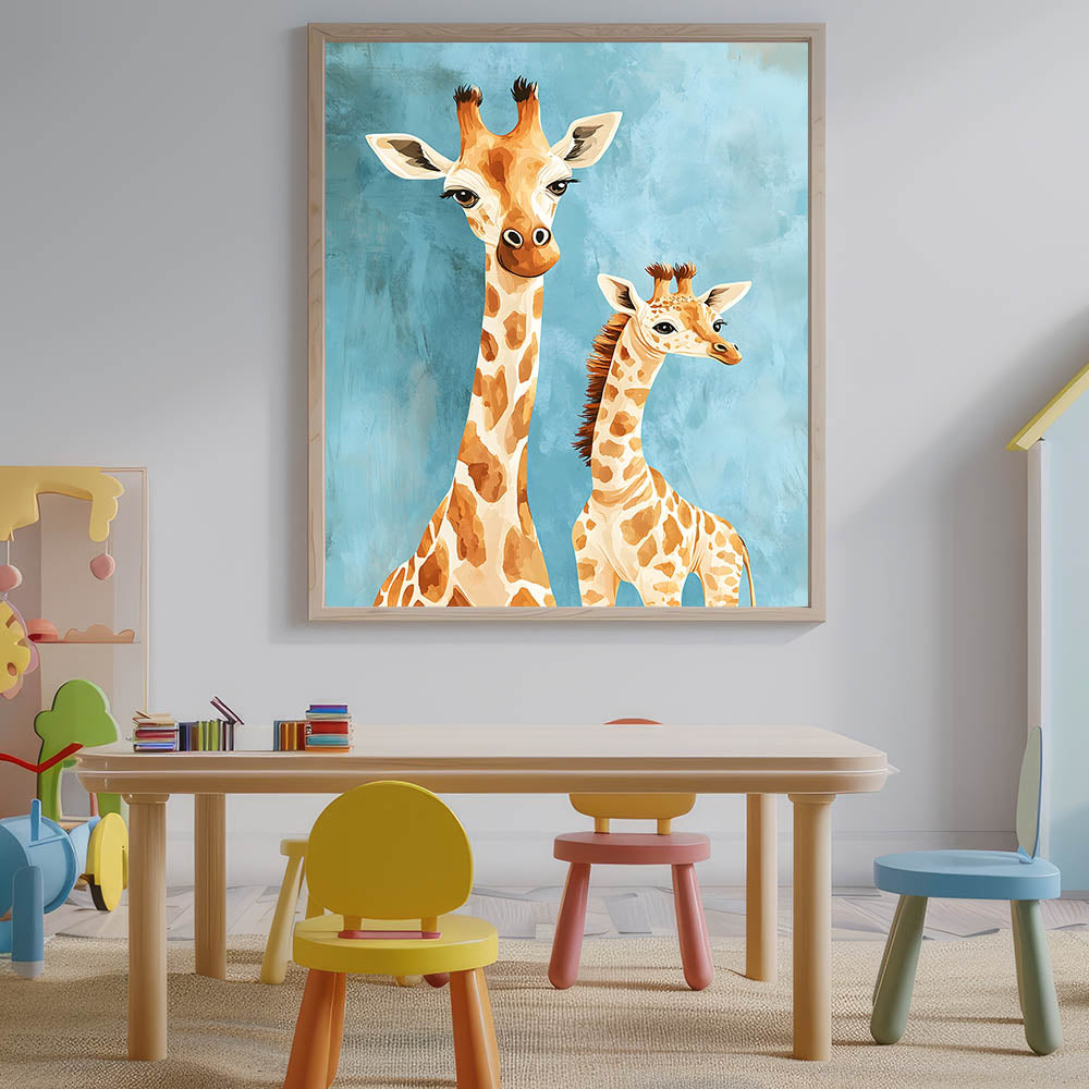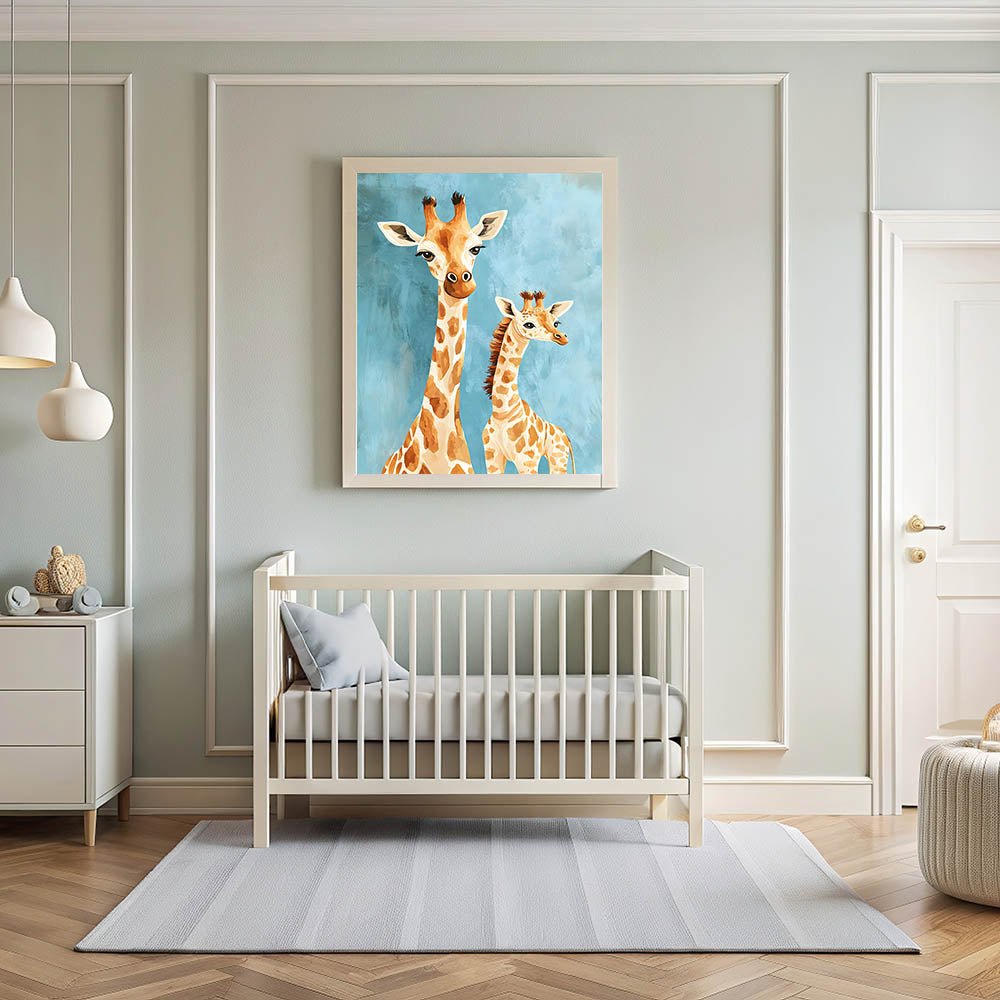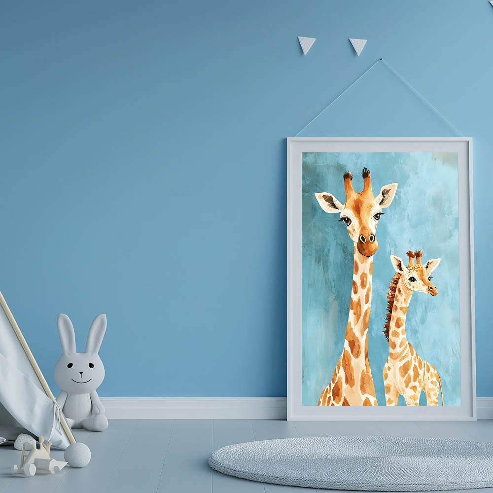 Transform your nursery with this giraffe nursery wall art, featuring a loving mother and baby giraffe against a soft blue background. This heartwarming illustration brings a calm, gentle, and adventurous feel to any baby room decor. The detailed giraffe patterns and watercolor-like strokes create a beautiful blend of warmth and elegance, making this children’s wall art a delightful addition to your little one’s space.