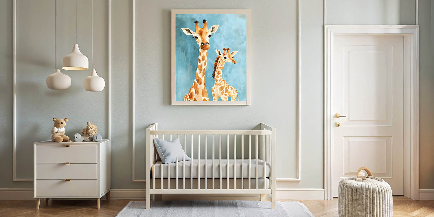 Enhance your child’s space with this nursery canvas print, a framed baby art print, or a durable acrylic nursery print. The combination of warm giraffe tones and cool blue hues creates a stunning contrast that brings life to any modern nursery.