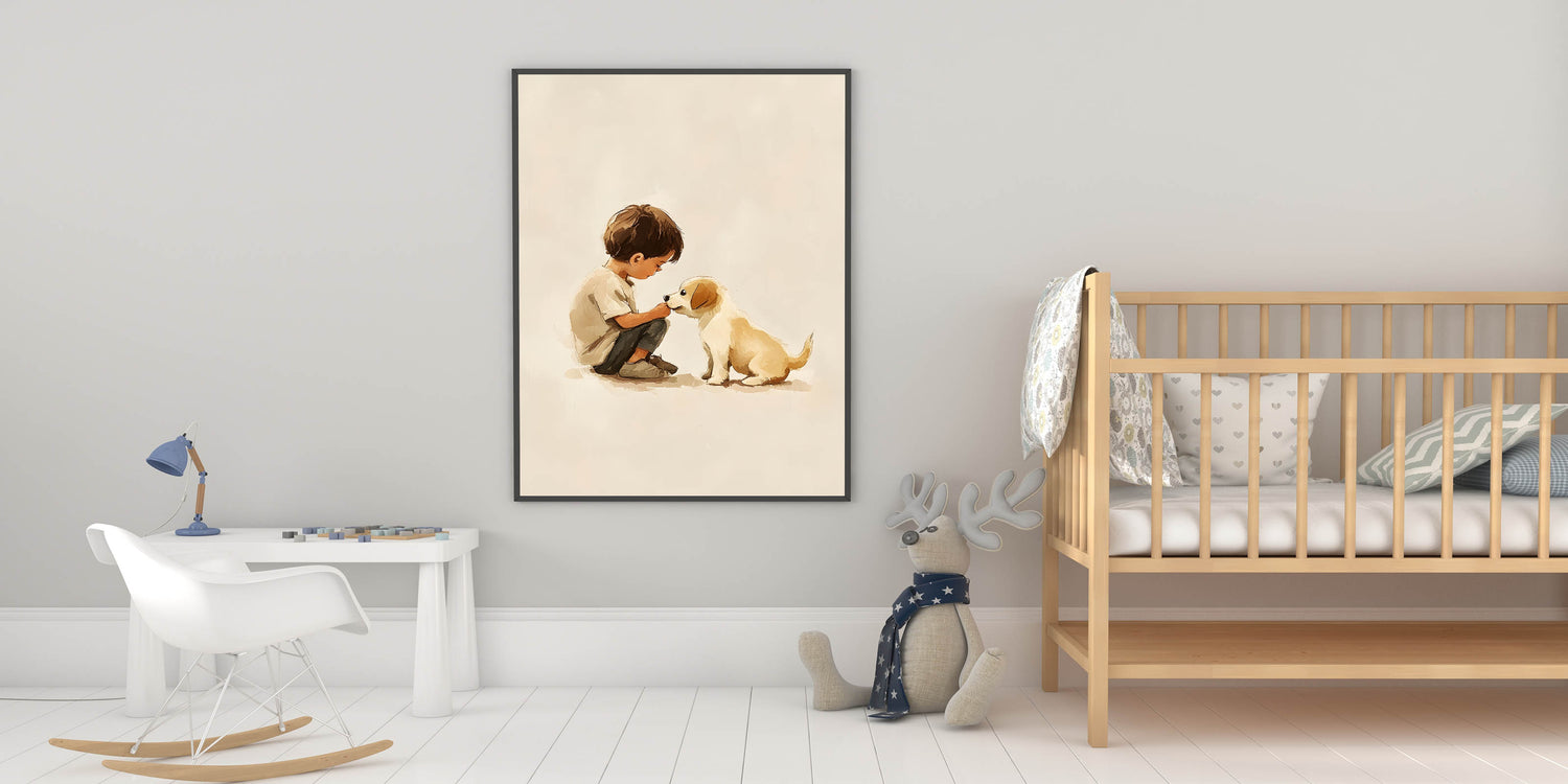 Celebrate the beauty of friendship and innocence with this Boy and Puppy Nursery Wall Art. Featuring a touching illustration of a young boy gently interacting with his furry companion, this artwork captures a heartwarming moment of love and connection. The soft beige background and warm earthy tones make it a timeless addition to baby room decor and children’s wall art collections.