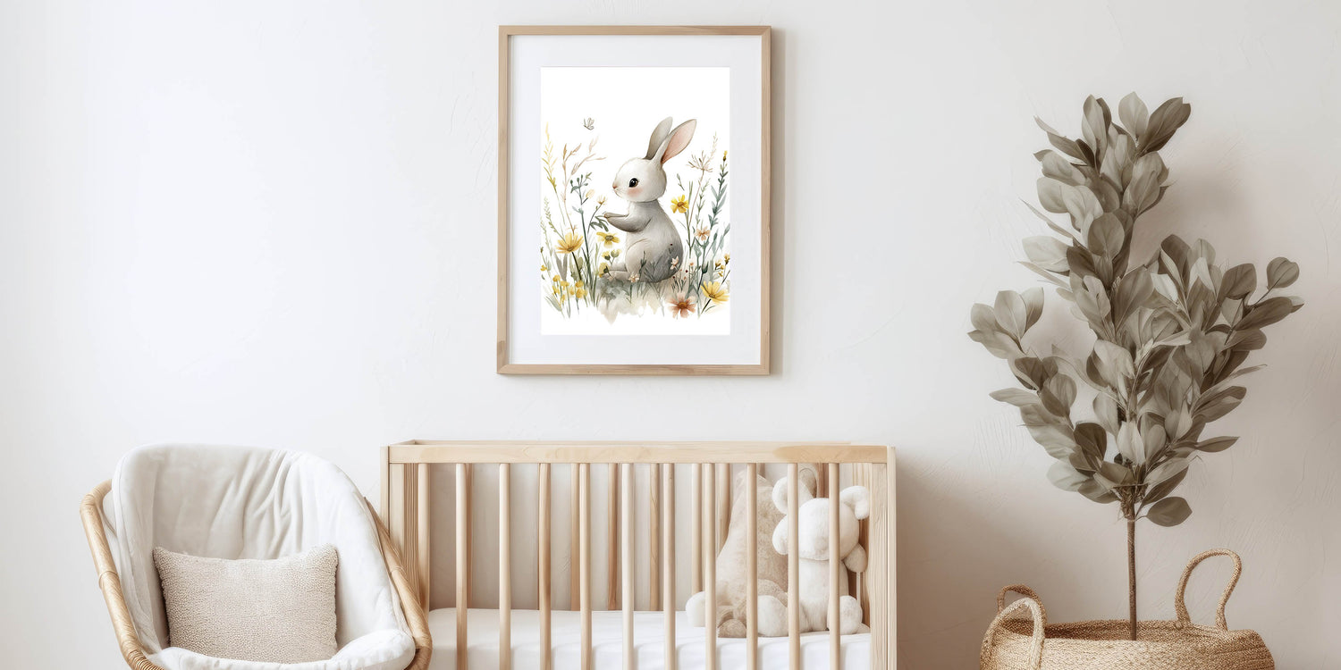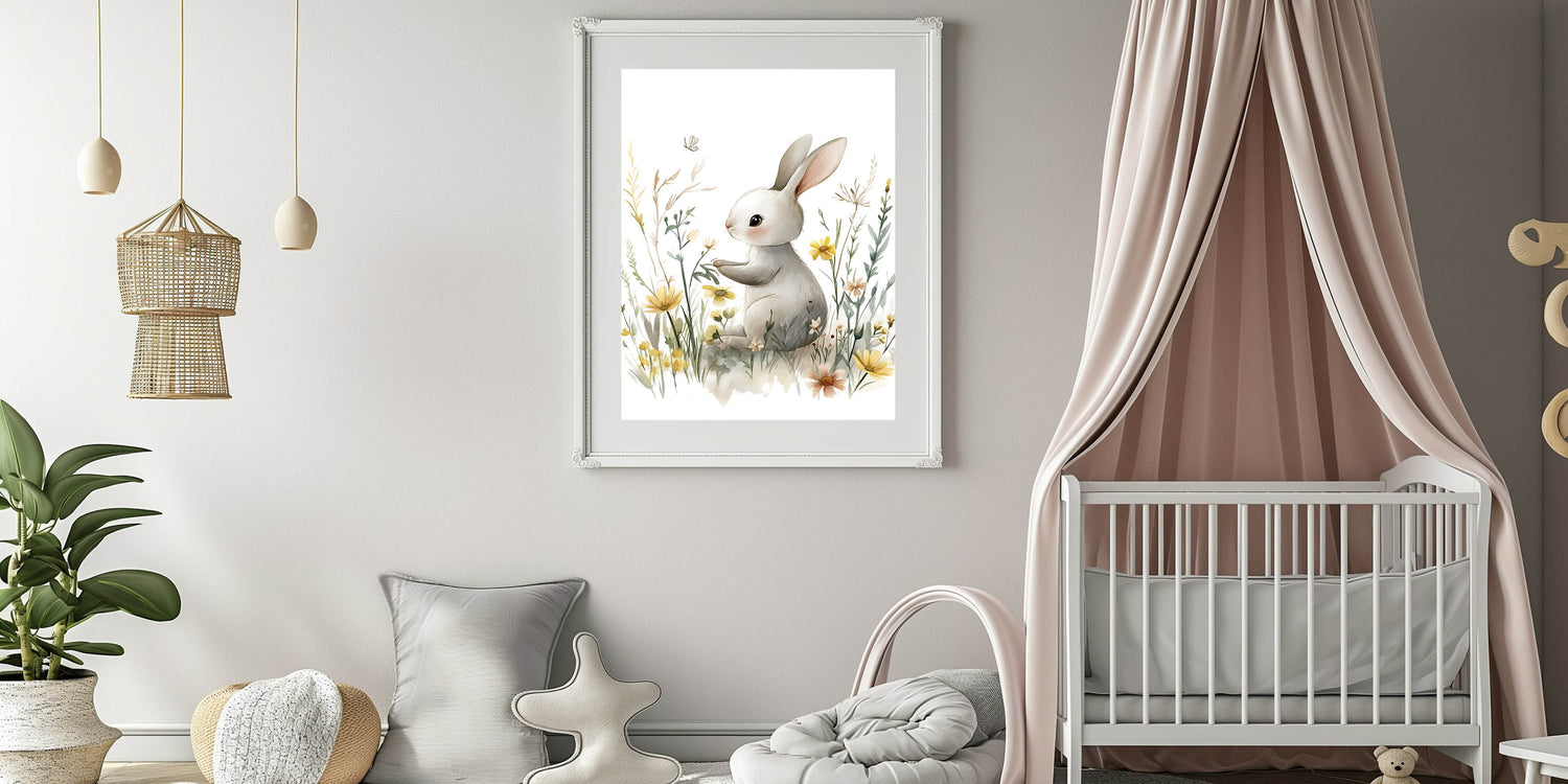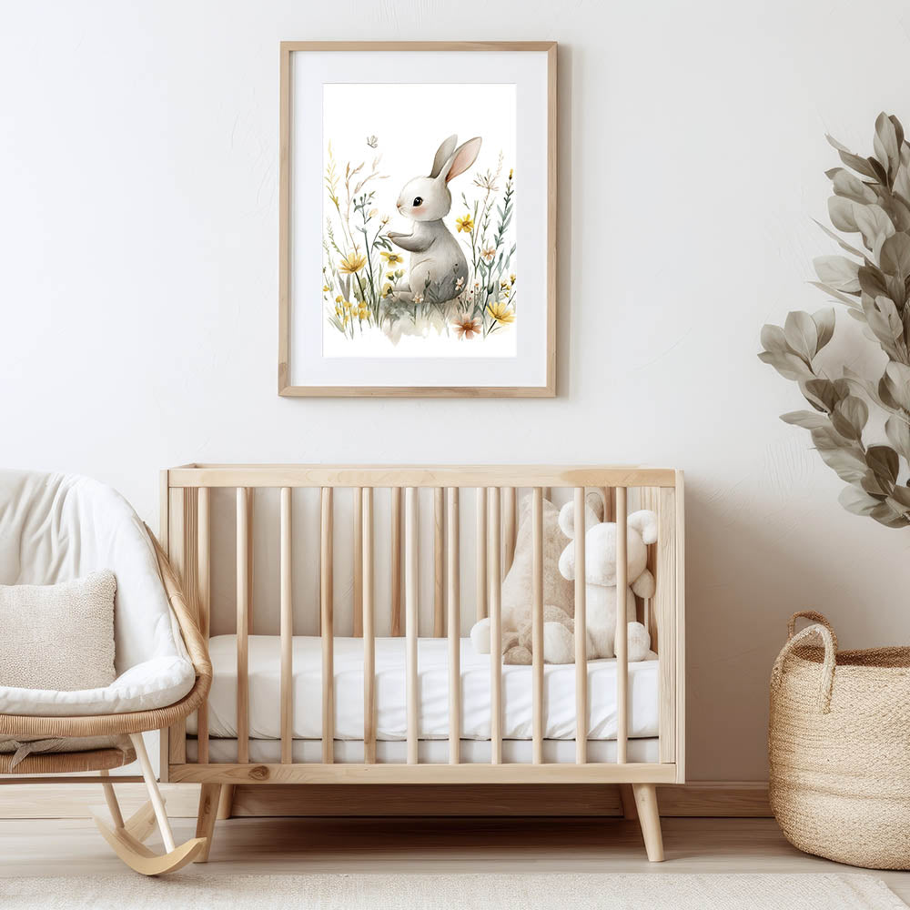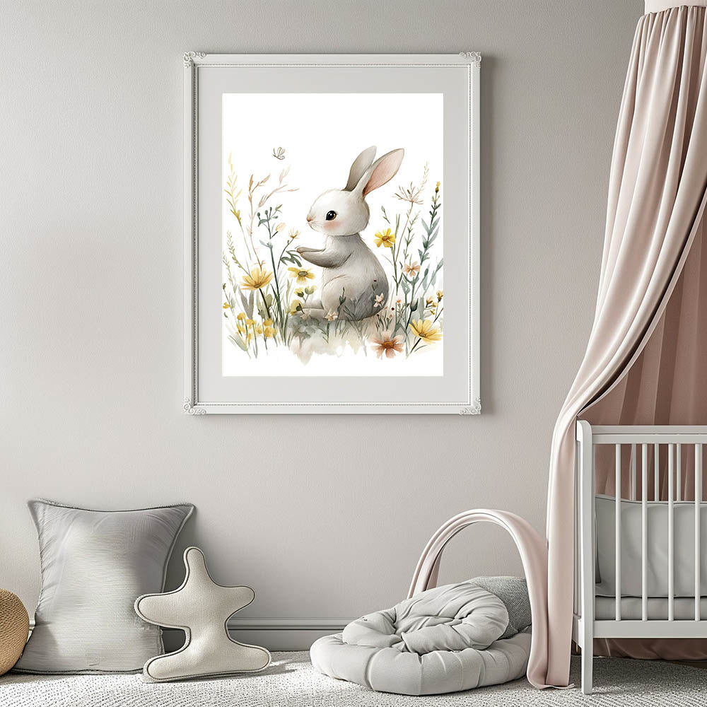Create a soft and whimsical atmosphere with this Bunny in Meadow Nursery Wall Art. Featuring a delicate watercolor-style illustration of a fluffy bunny surrounded by wildflowers and gentle greenery, this baby room decor adds warmth, charm, and a touch of nature to nurseries, playrooms, or children's bedrooms.