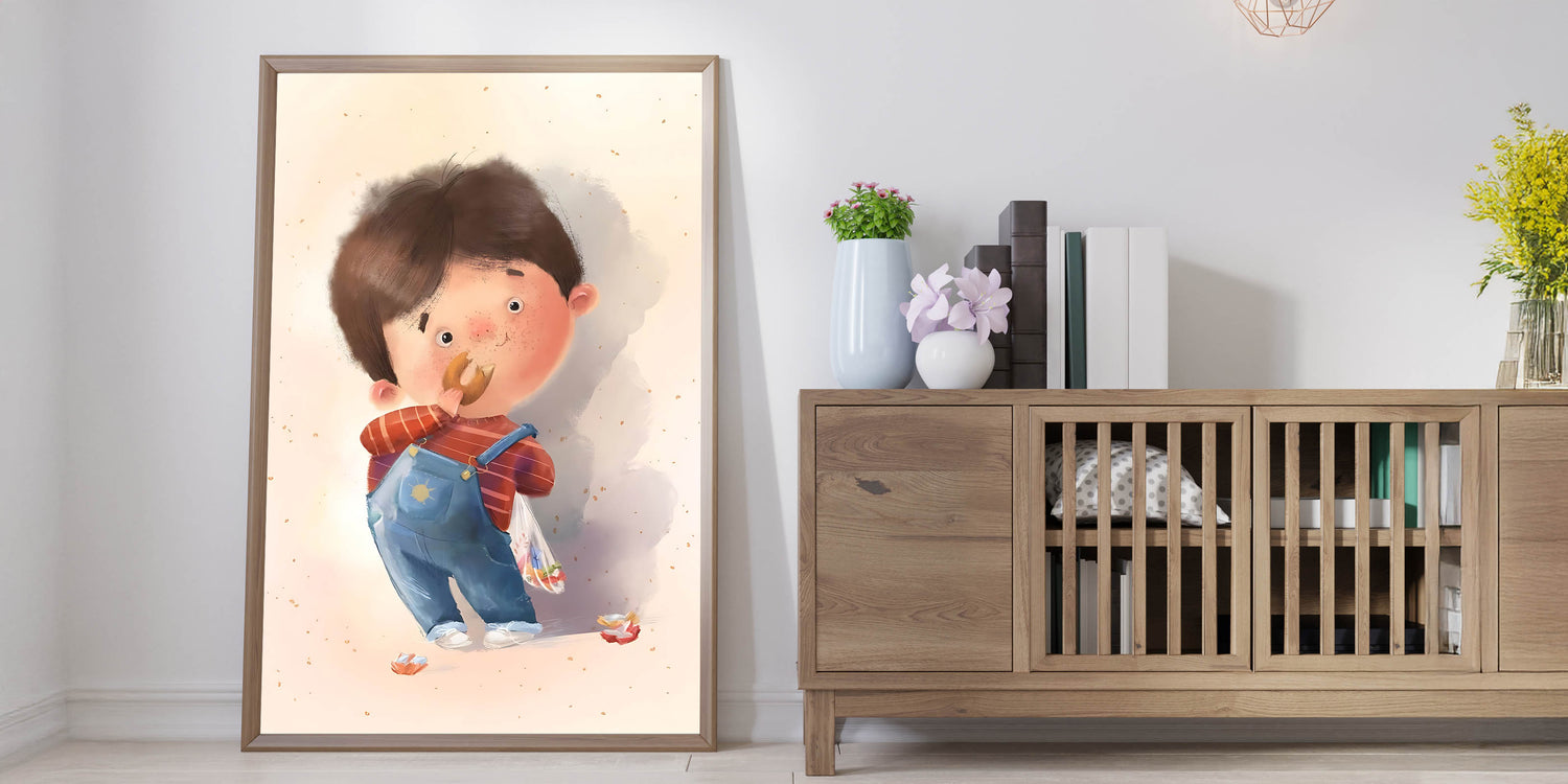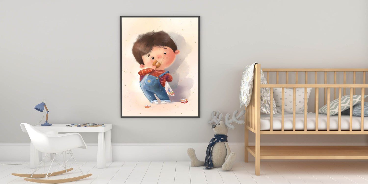 Add warmth and nostalgia to your child’s space with this charming boy nursery canvas print. This beautifully illustrated children’s wall art features a young boy in denim overalls, enjoying a snack with a soft and dreamy background. The warm beige, blue, and brown tones make it a comforting and stylish baby room decor choice.