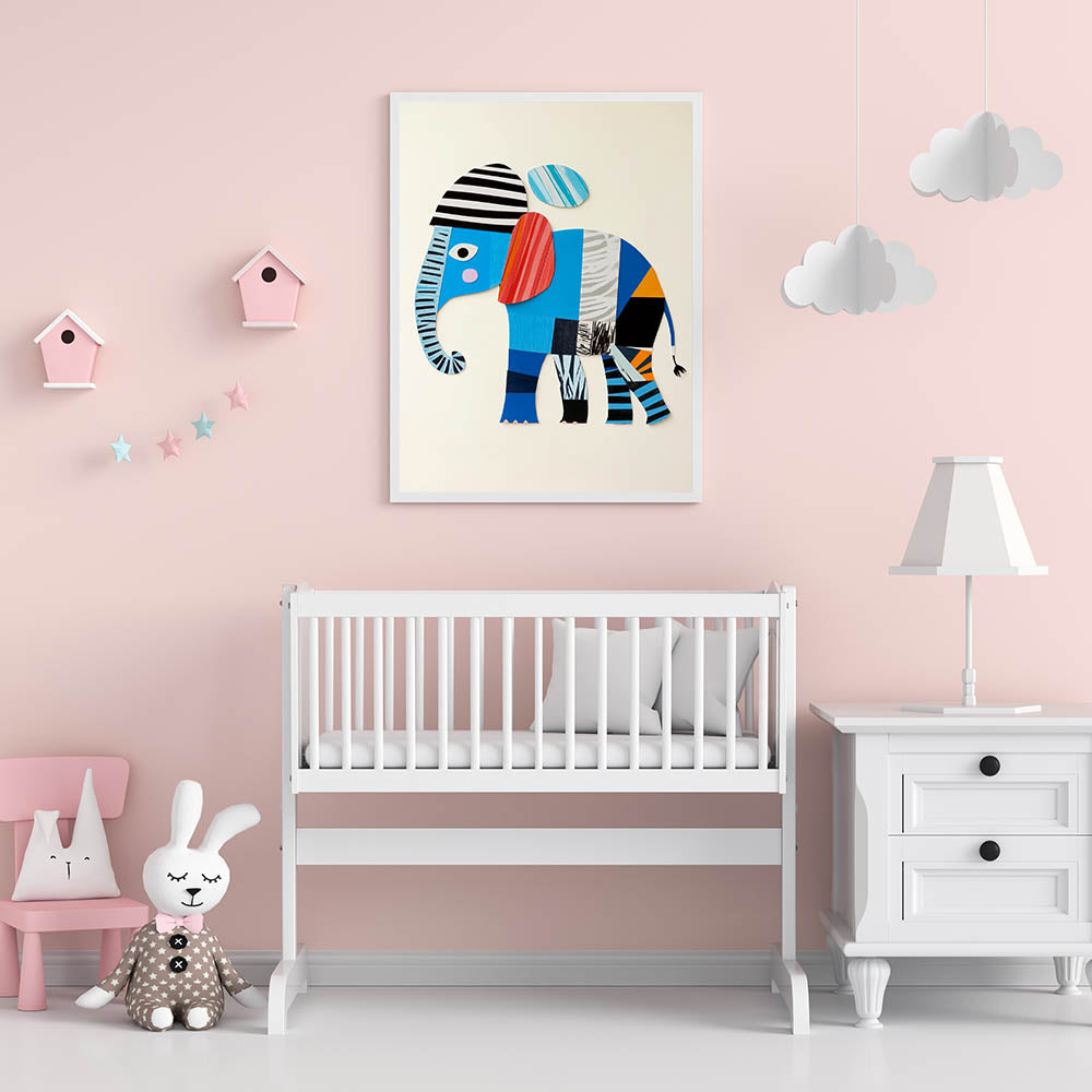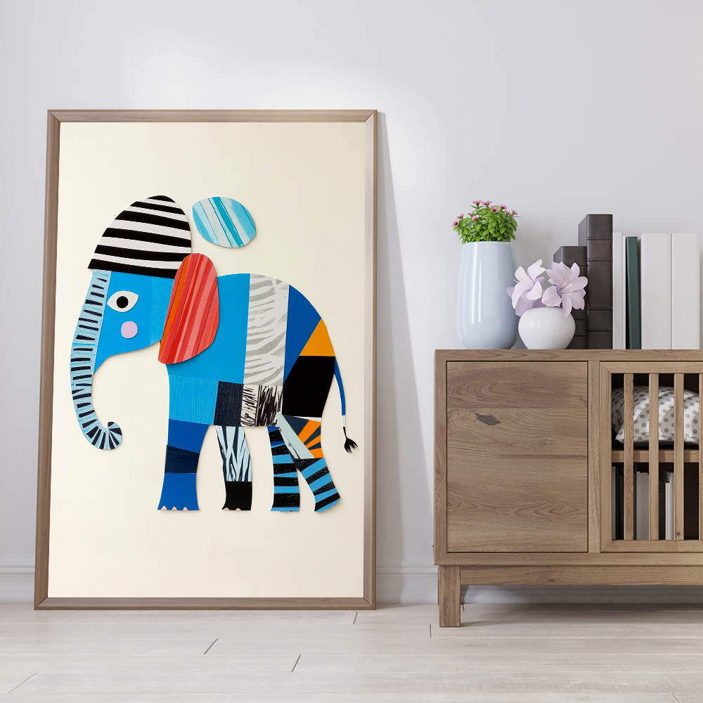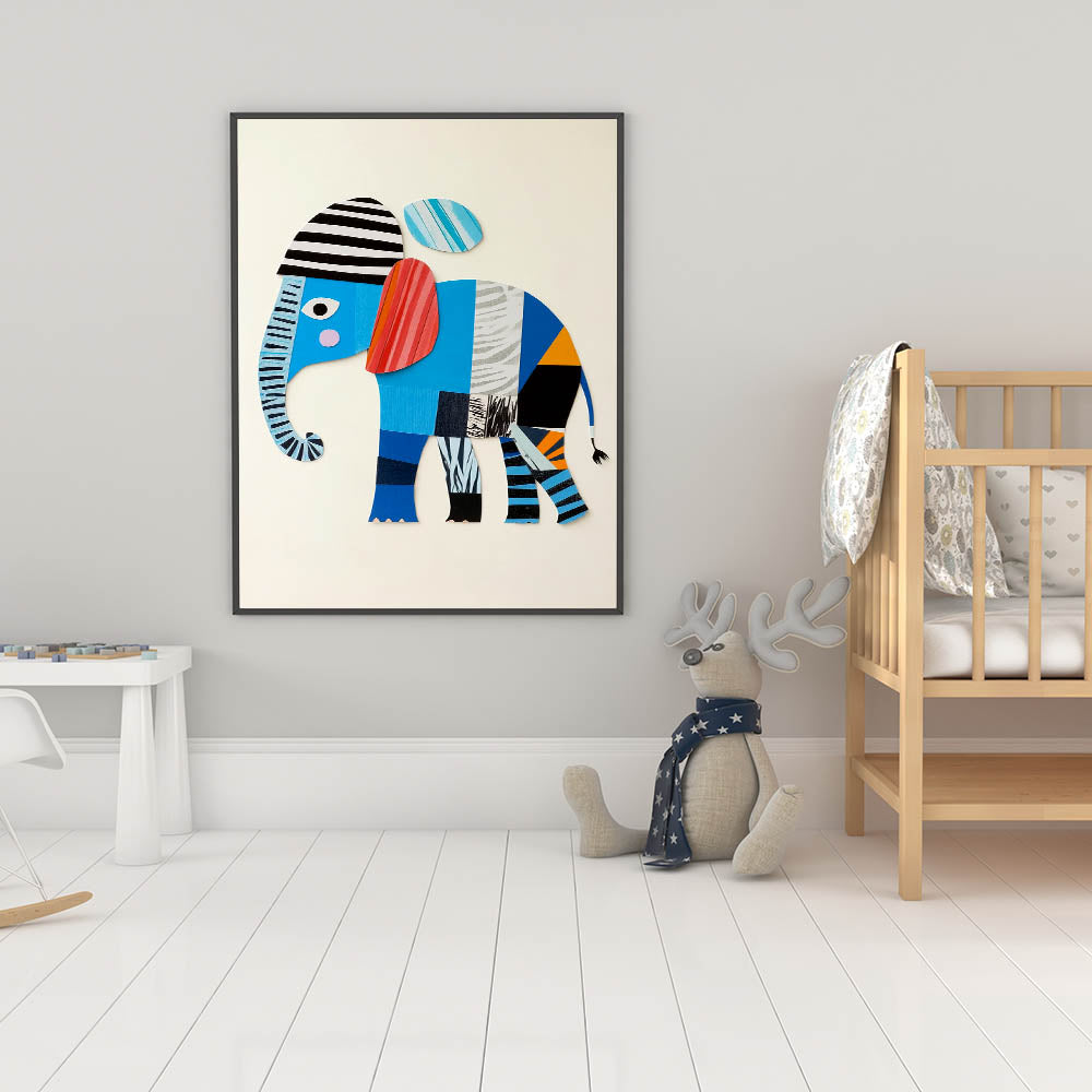 Add a splash of creativity to your child's space with this colorful elephant nursery wall art. Designed in a unique patchwork collage style, this playful elephant features an artistic mix of blue, black, white, red, and orange hues, making it a striking focal point in baby room decor. The vibrant and modern design makes it ideal for safari-themed nurseries, playrooms, or children’s bedrooms.