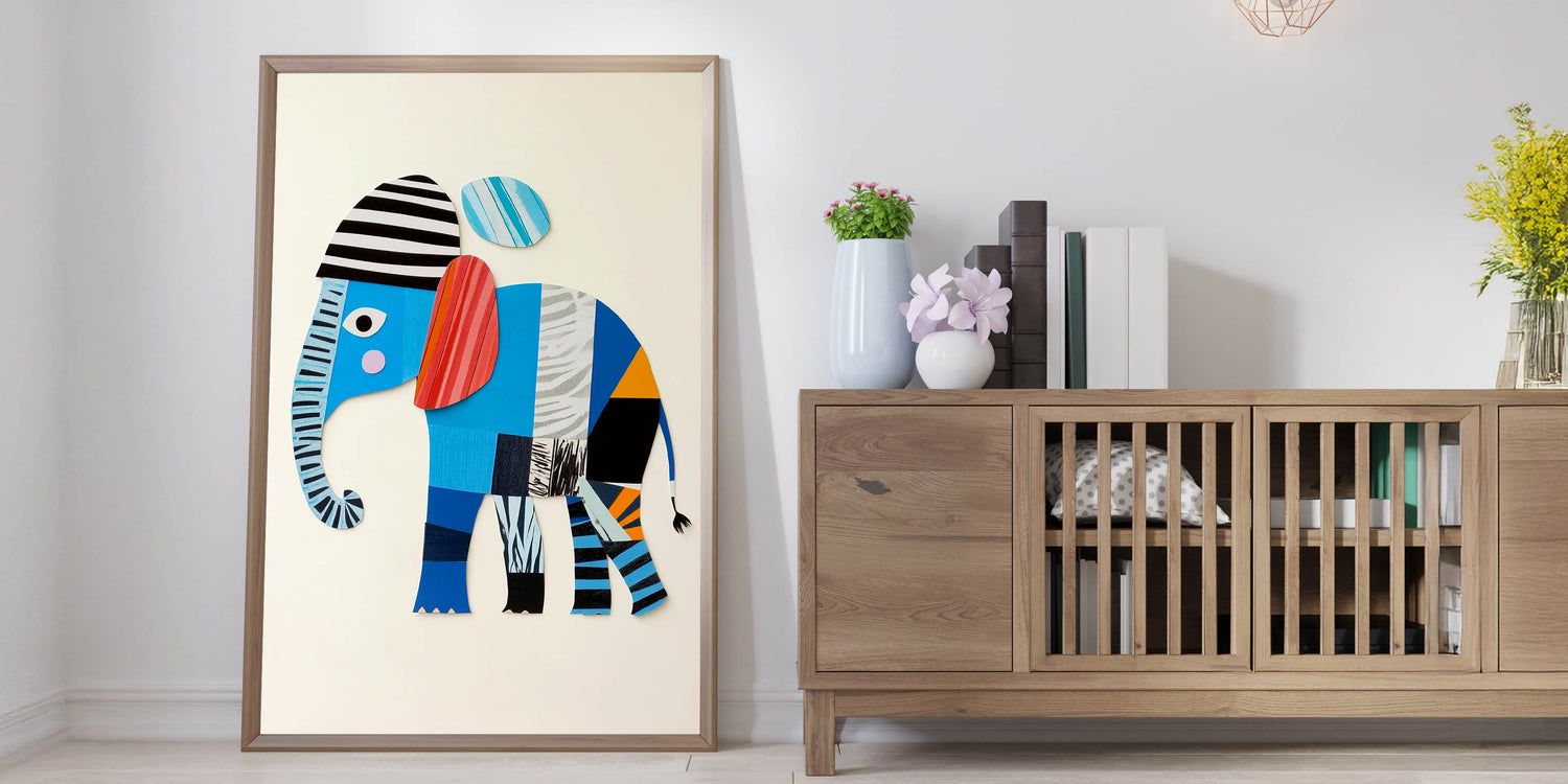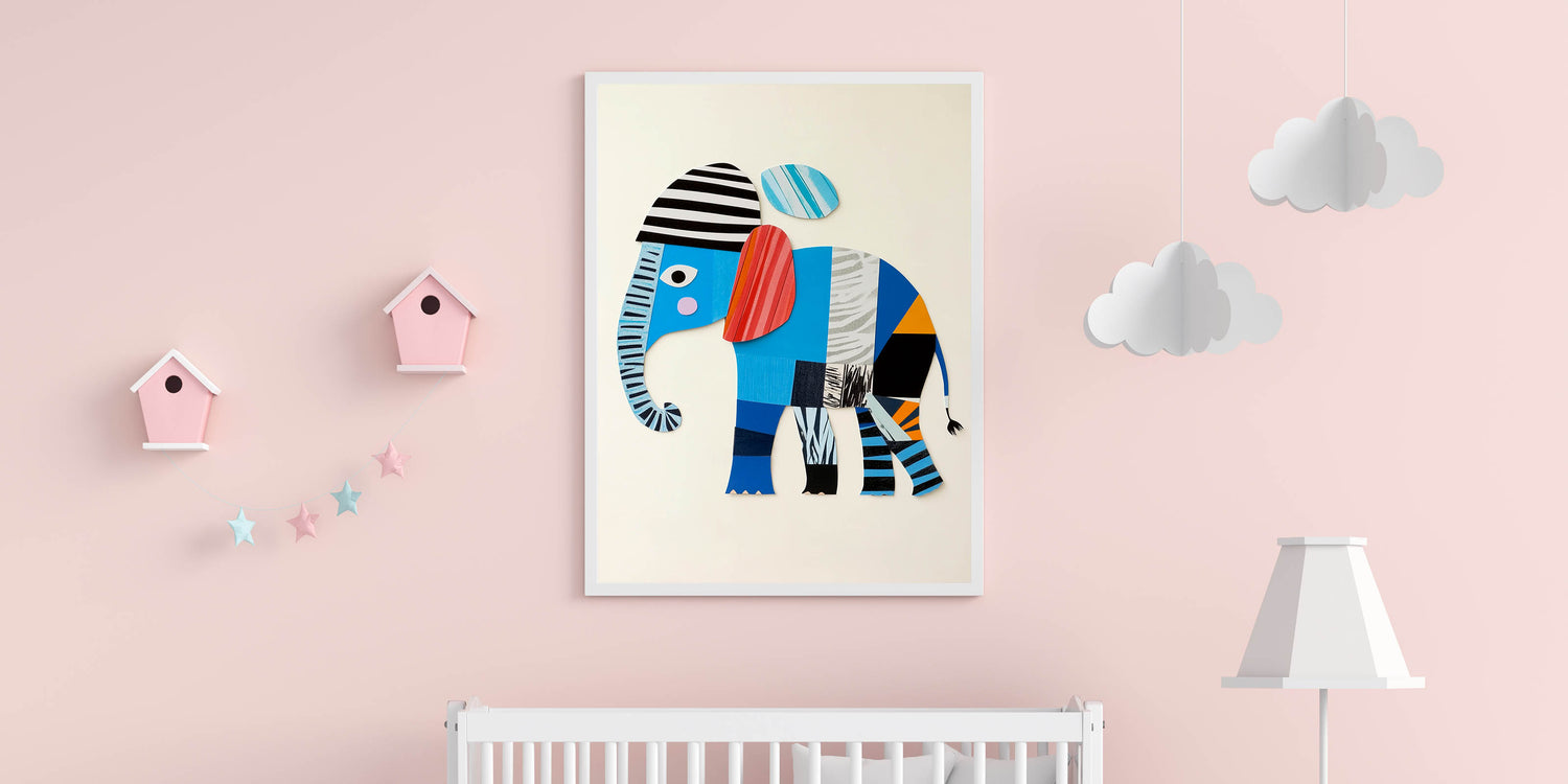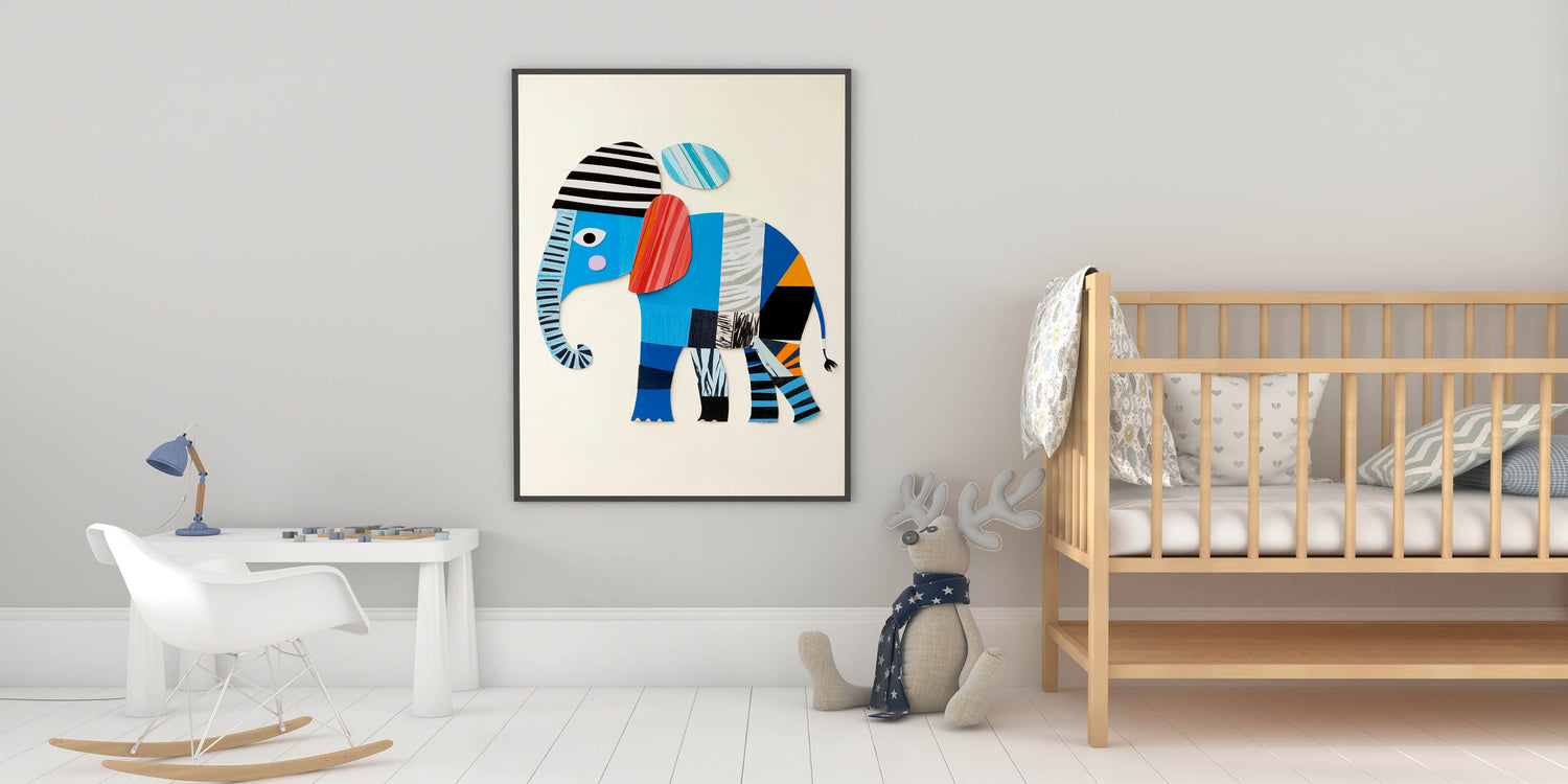 Add a splash of creativity to your child's space with this colorful elephant nursery wall art. Designed in a unique patchwork collage style, this playful elephant features an artistic mix of blue, black, white, red, and orange hues, making it a striking focal point in baby room decor. The vibrant and modern design makes it ideal for safari-themed nurseries, playrooms, or children’s bedrooms.