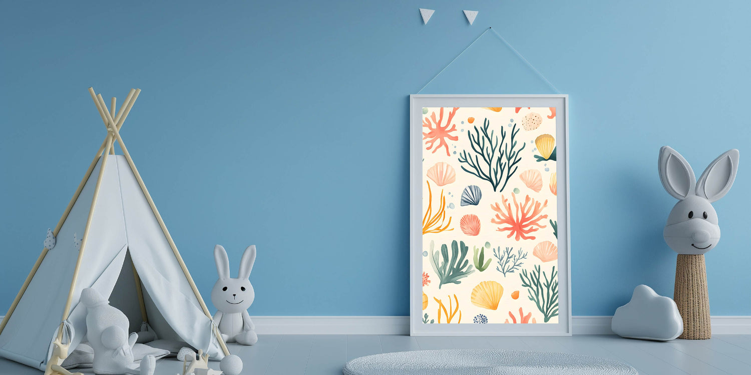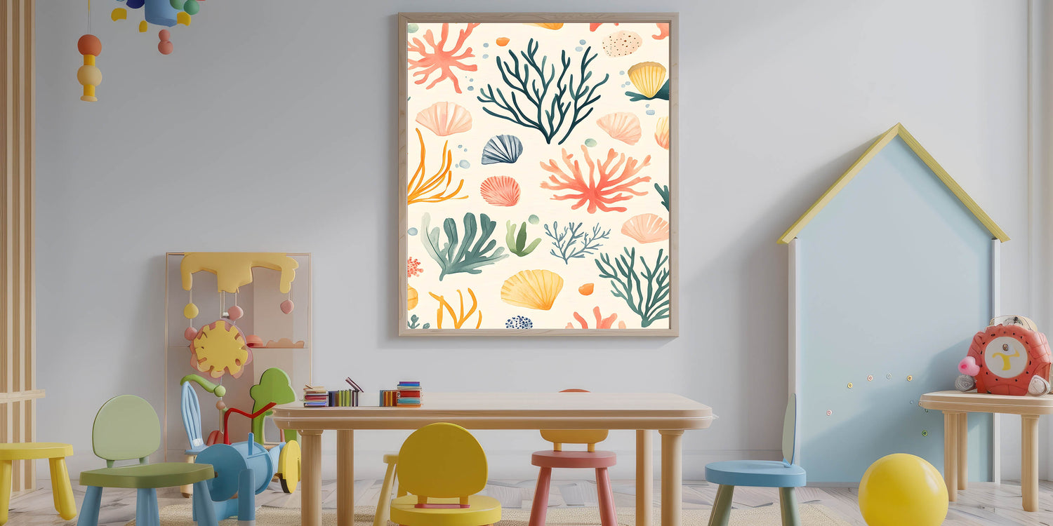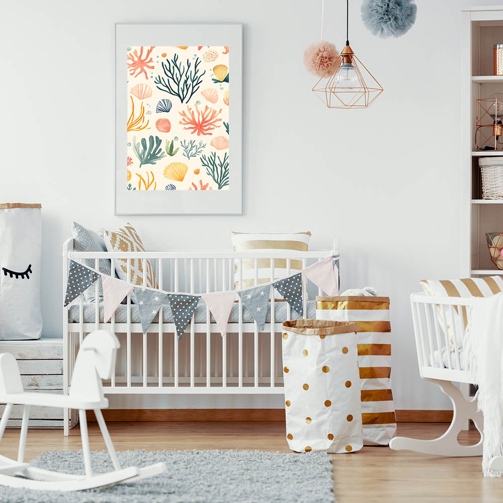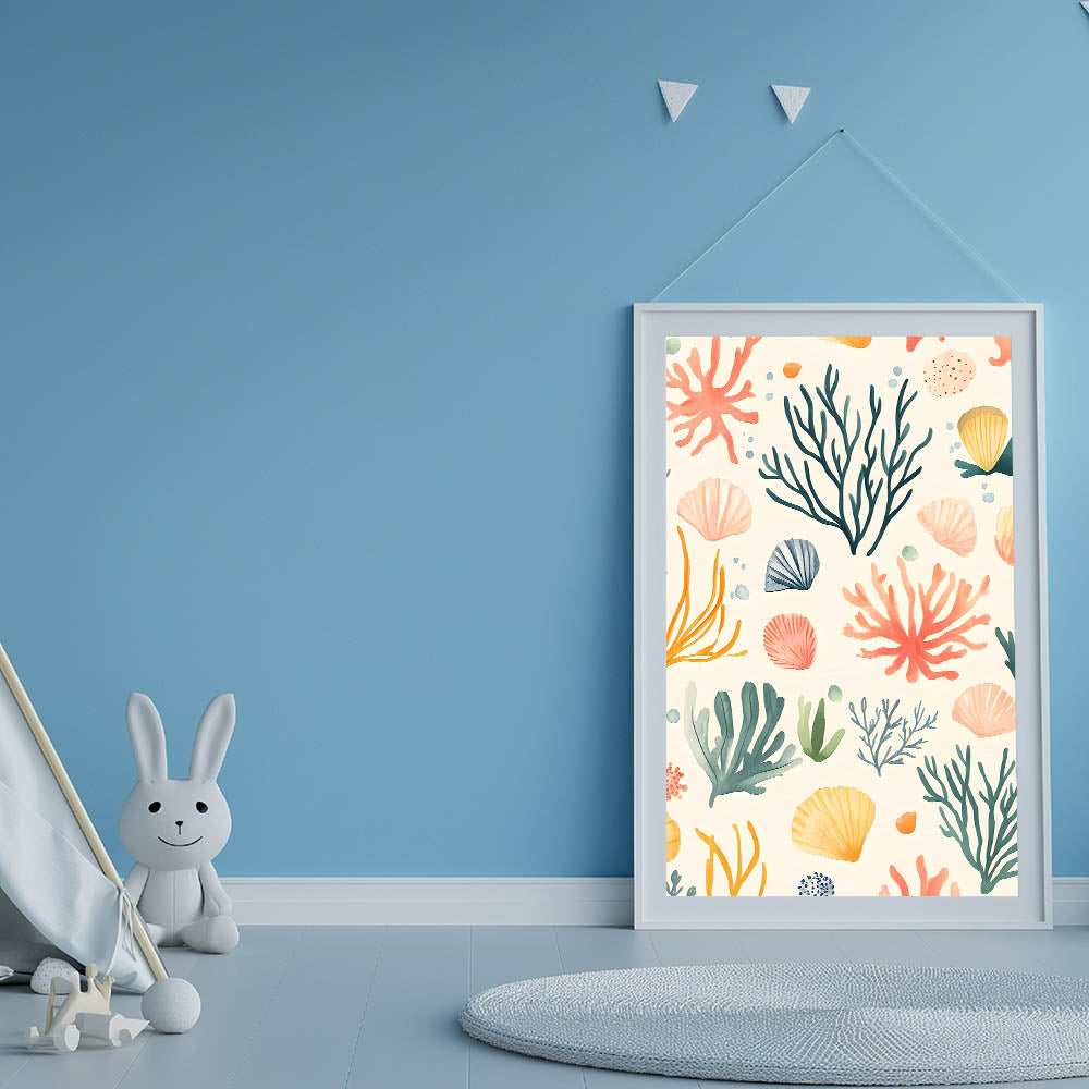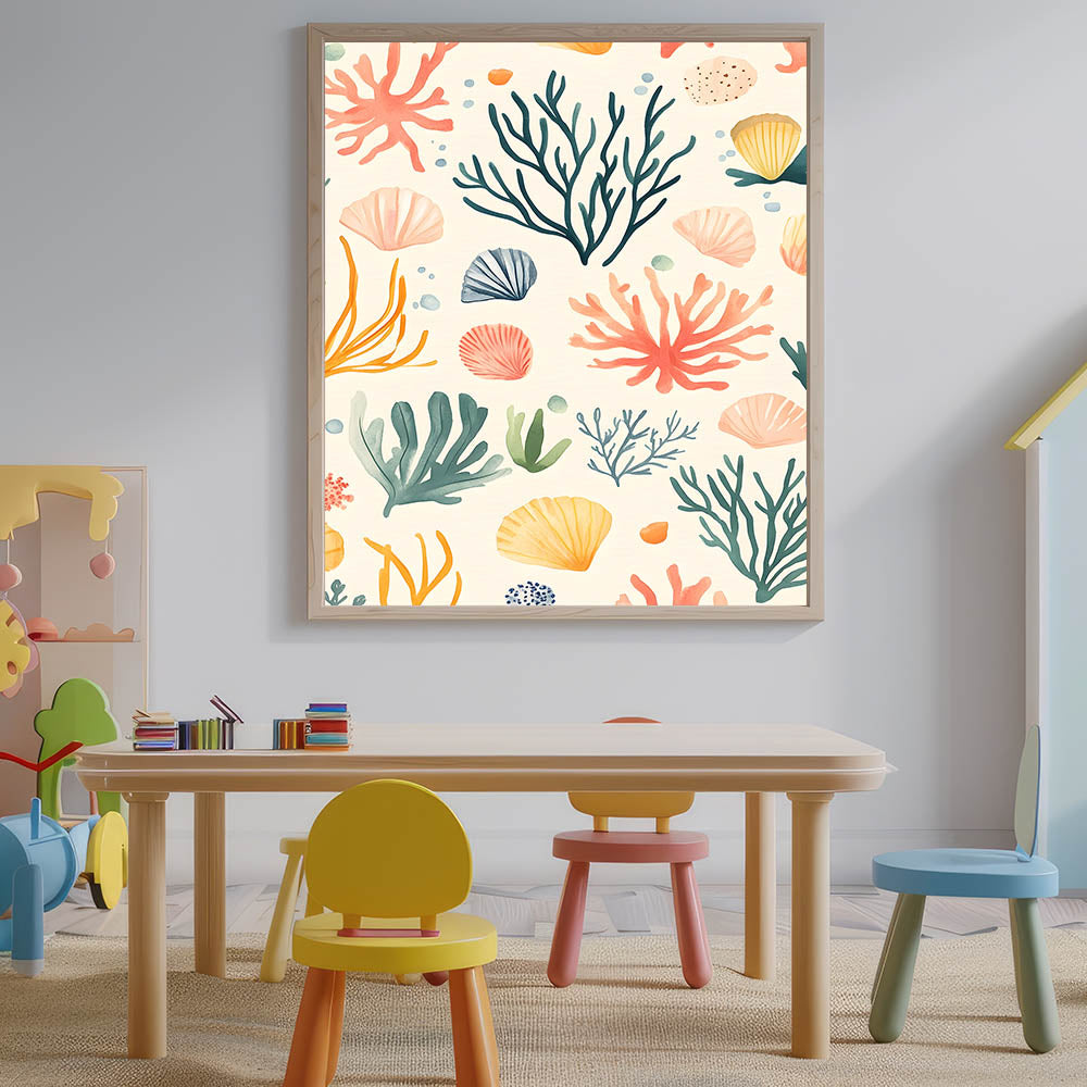 Bring the beauty of the ocean into your child’s space with this Coral Reef Nursery Wall Art. Featuring a vibrant mix of coral, seashells, and ocean elements in soft pastels and rich marine tones, this baby room decor adds a playful yet calming atmosphere to nurseries, playrooms, or children's bedrooms.