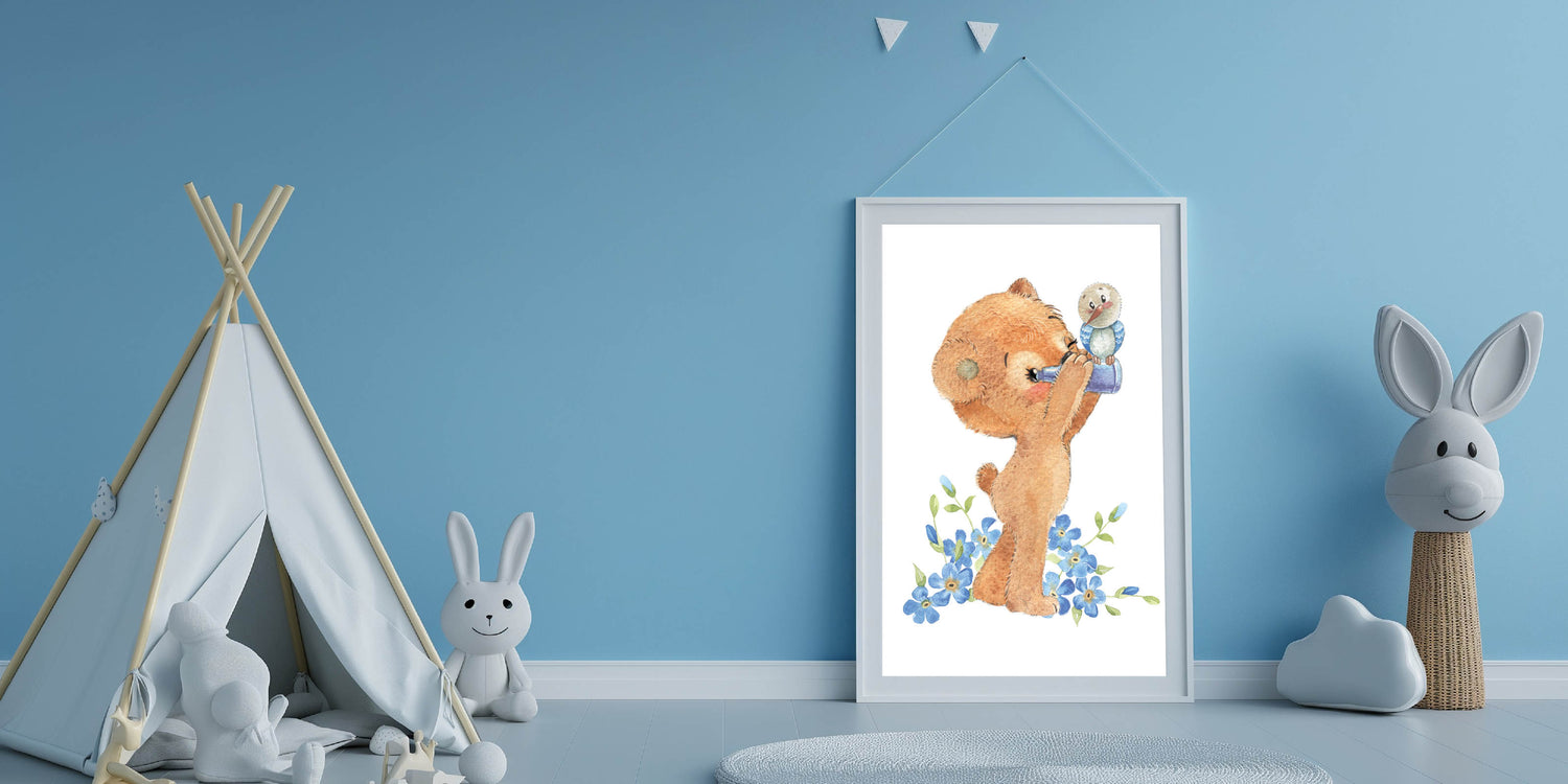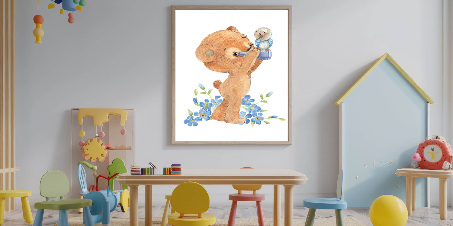 - Adorable Watercolor Design – A whimsical and detailed bear and bird illustration to brighten up nurseries.