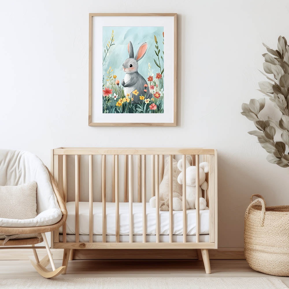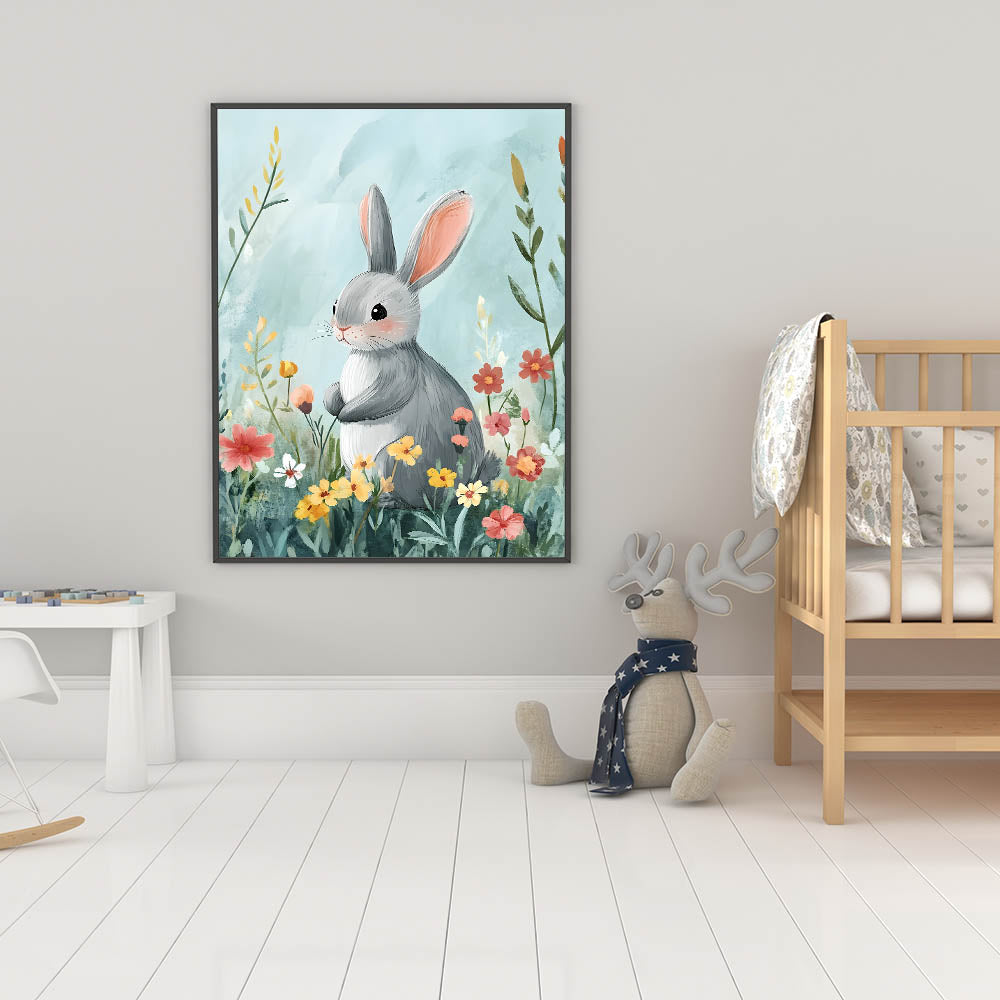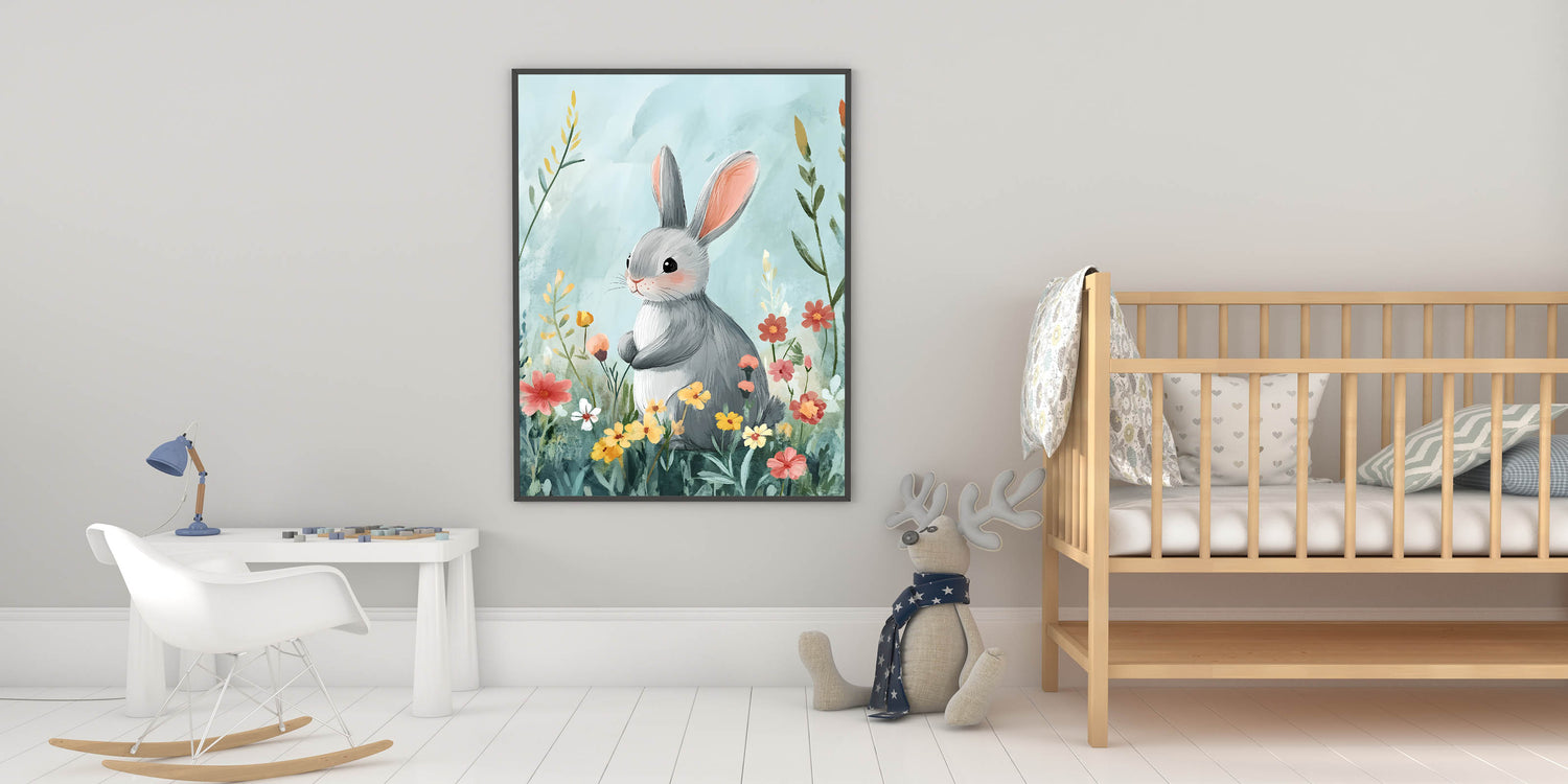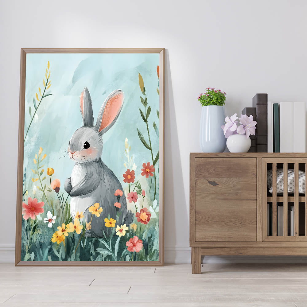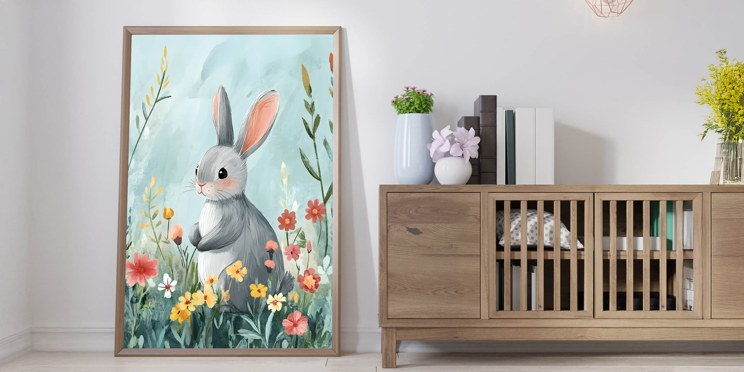 - Charming Design – Features a sweet bunny in a floral meadow, perfect for kids' room art prints.