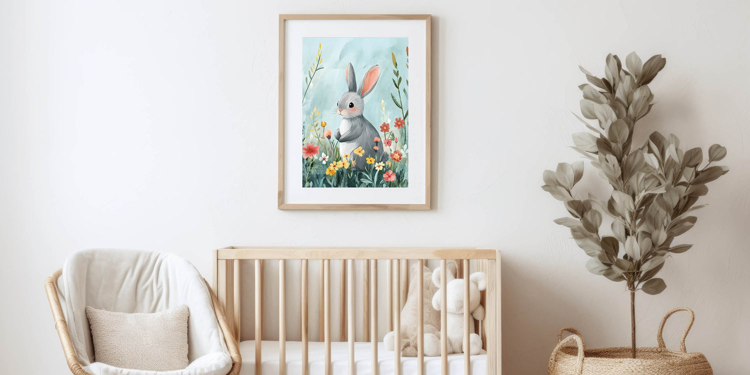 Enhance your child’s space with this nursery canvas print, an elegant framed baby art print, or a durable acrylic nursery print. This bunny-themed artwork is sure to bring joy and charm to any little one's room!