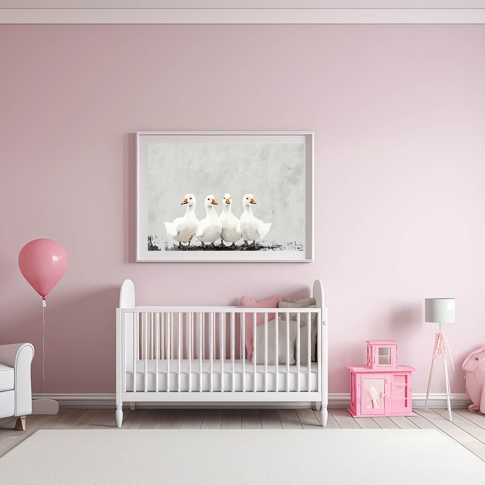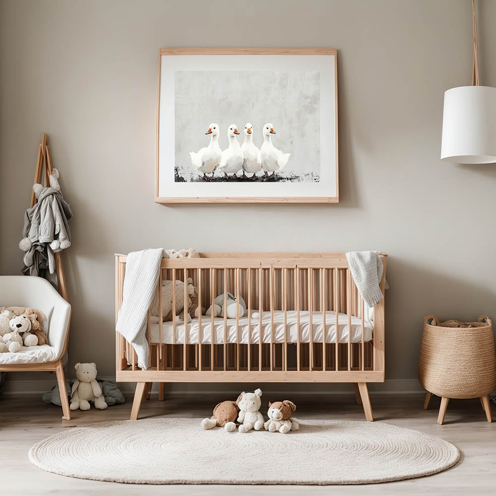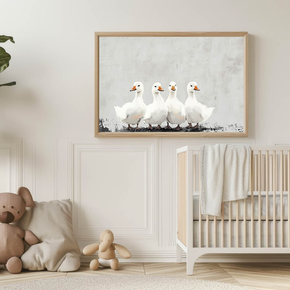 This framed nursery art is ideal for animal lovers or parents looking to create a peaceful ambiance in their child's room. Whether in acrylic nursery art or canvas, this geese print will bring timeless beauty to any nursery space.