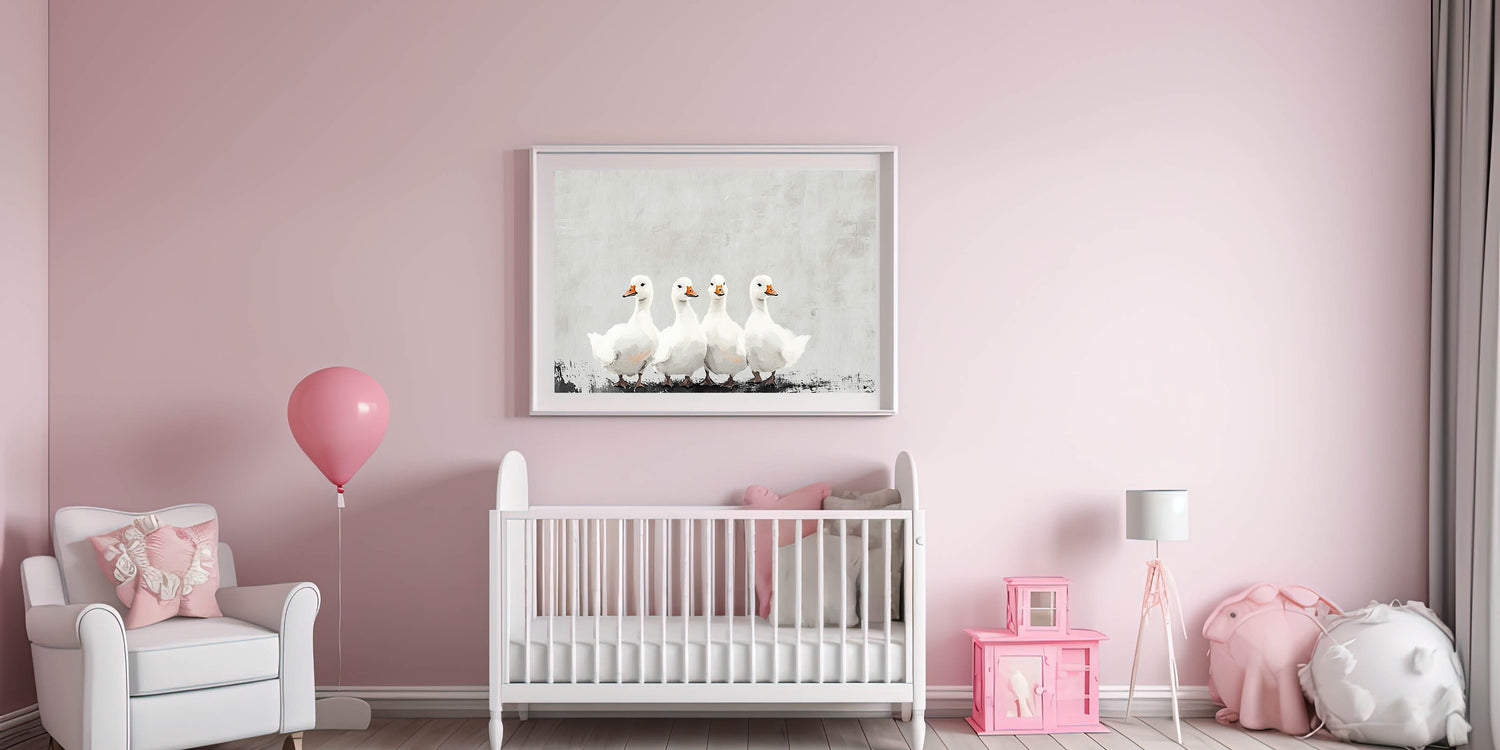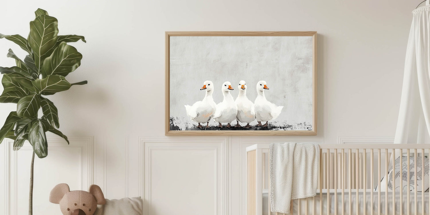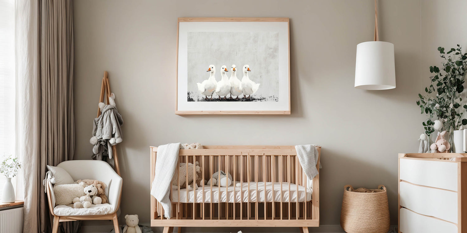 This framed nursery art is ideal for animal lovers or parents looking to create a peaceful ambiance in their child's room. Whether in acrylic nursery art or canvas, this geese print will bring timeless beauty to any nursery space.