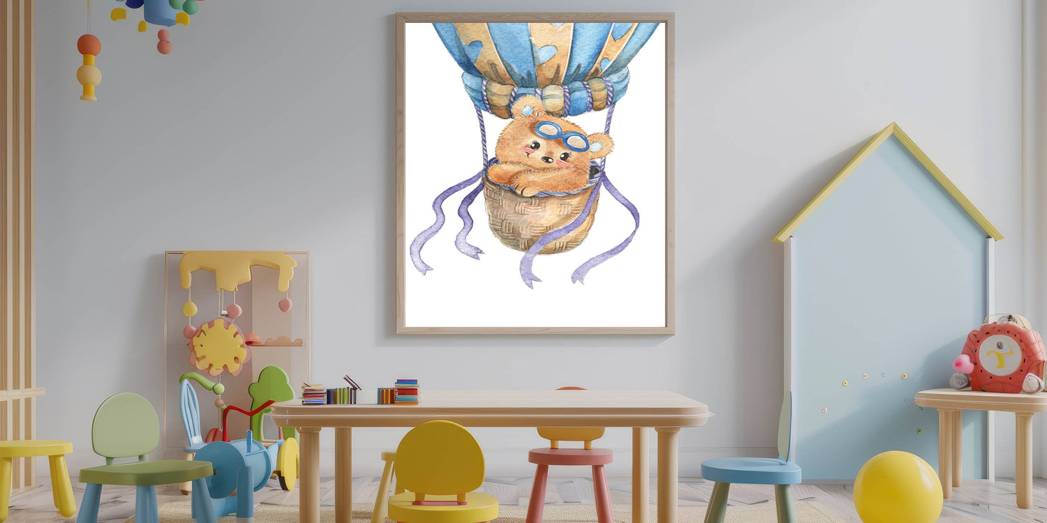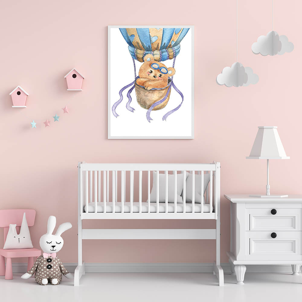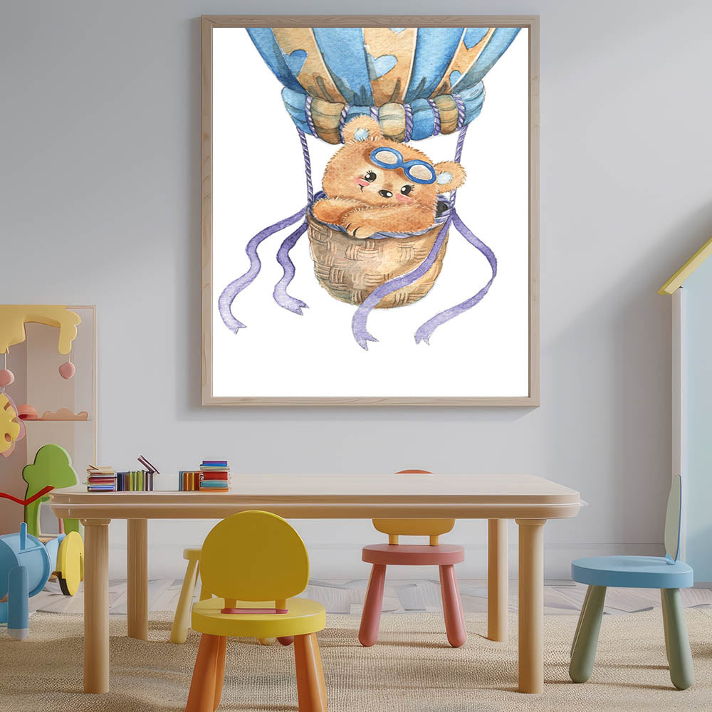 Let your child’s imagination soar with this Hot Air Balloon Bear Nursery Wall Art. Featuring a whimsical watercolor illustration of a cute bear in a hot air balloon, this baby room decor adds a dreamy and adventurous feel to any nursery. The soft blue, brown, and beige tones blend beautifully with modern and classic children's spaces, making it a perfect choice for kids’ wall art.