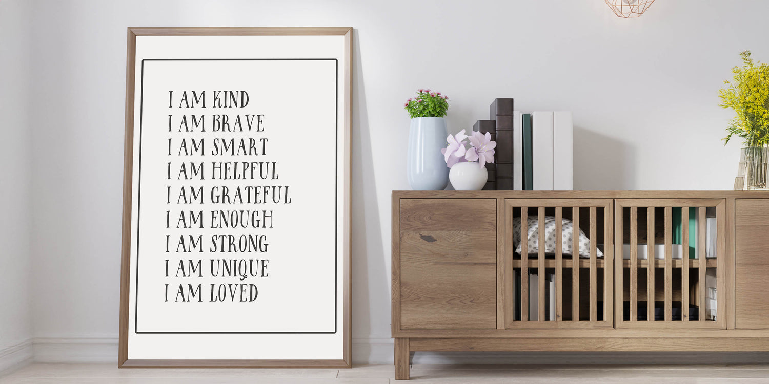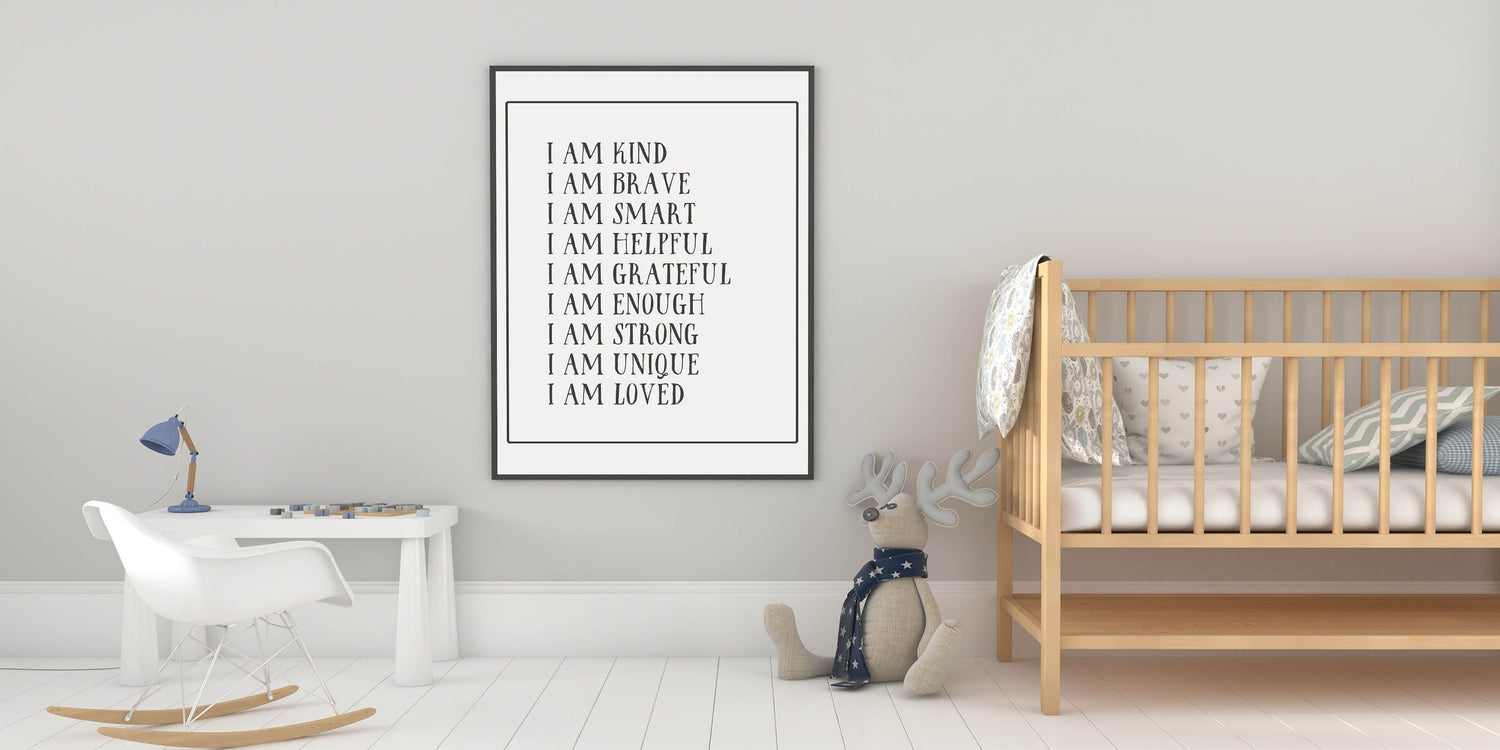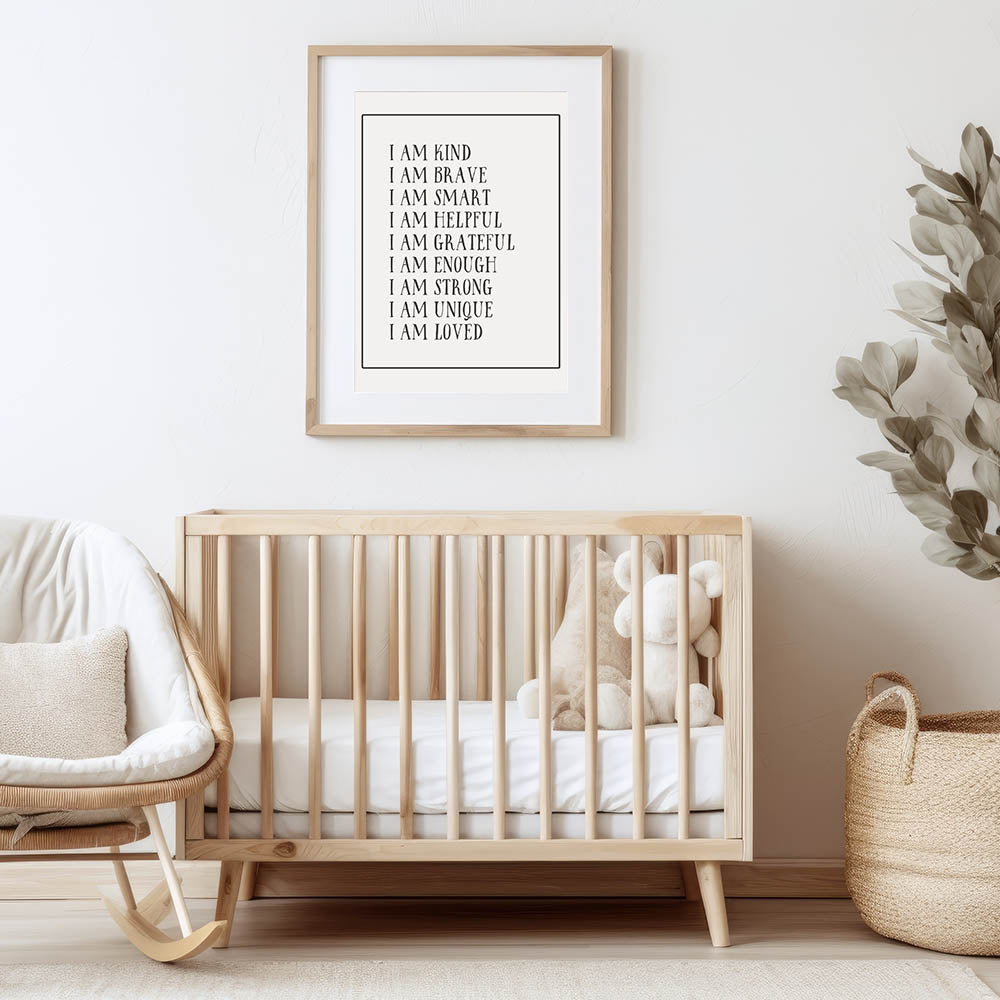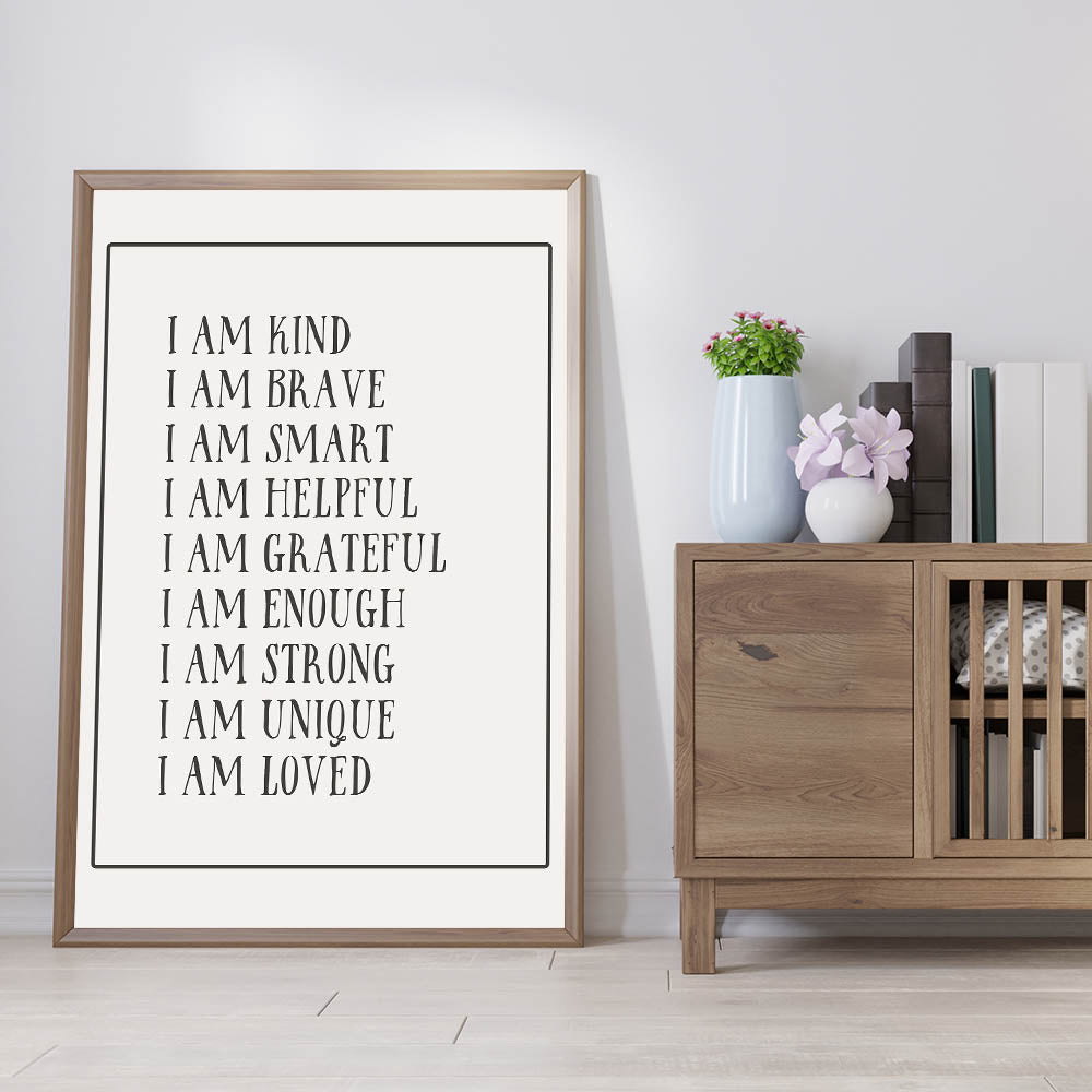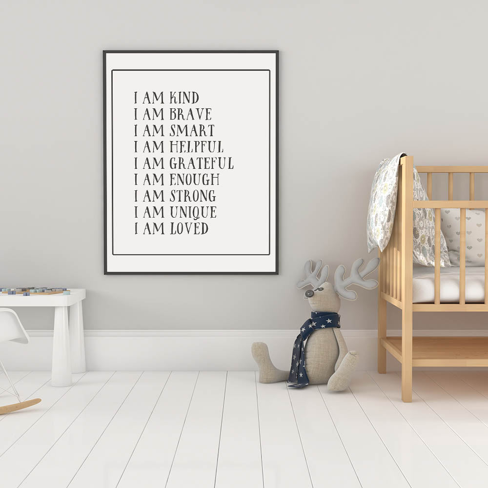 Encourage confidence and positivity with this kids' affirmation nursery wall art. Featuring empowering statements like "I Am Kind," "I Am Brave," and "I Am Loved," this baby room decor piece promotes self-love, strength, and mindfulness in young children. The minimalist black-and-white typography makes it a timeless and versatile addition to any nursery, playroom, or kids' learning space.